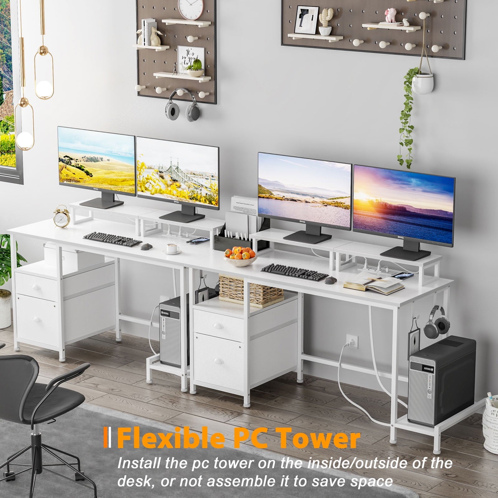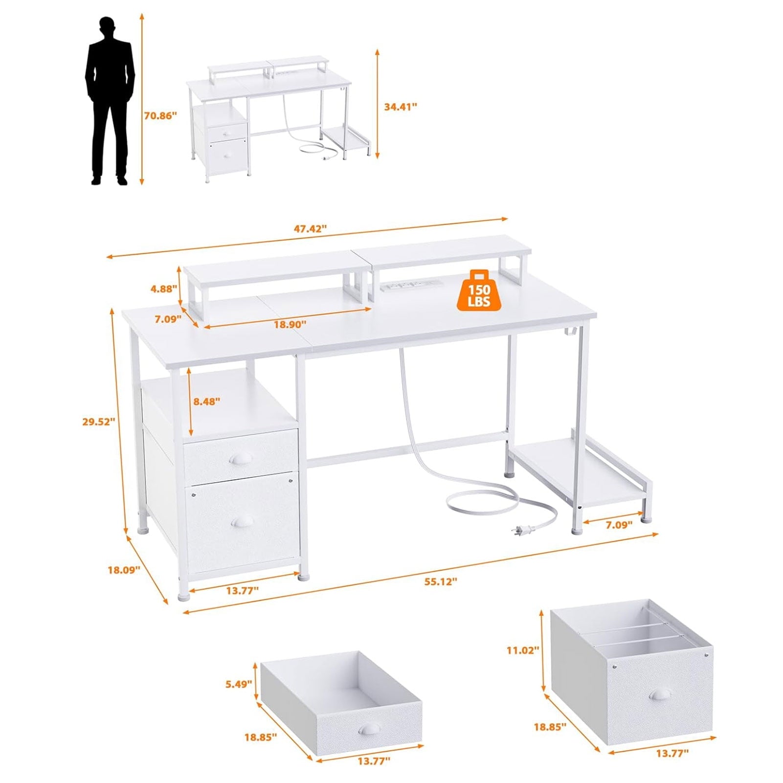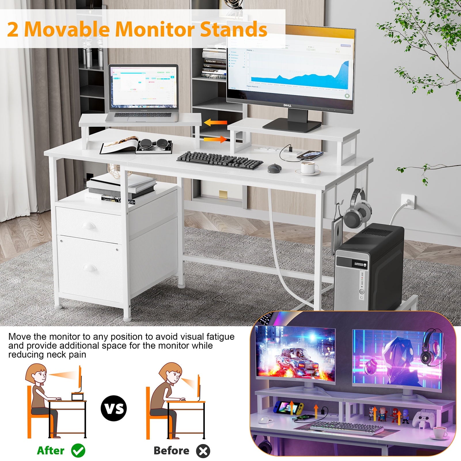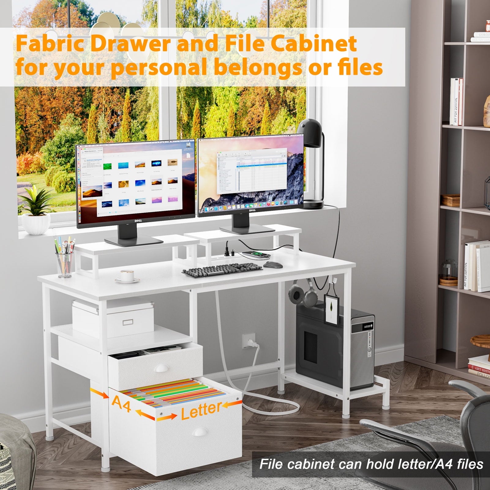 Furologee White Computer Desk with Drawer and Power Outlets, 47" Office Desk with 2 Monitor Stands and Fabric File Cabinet, Writing Gaming Table with Shelves and 2 Hooks for Home Office