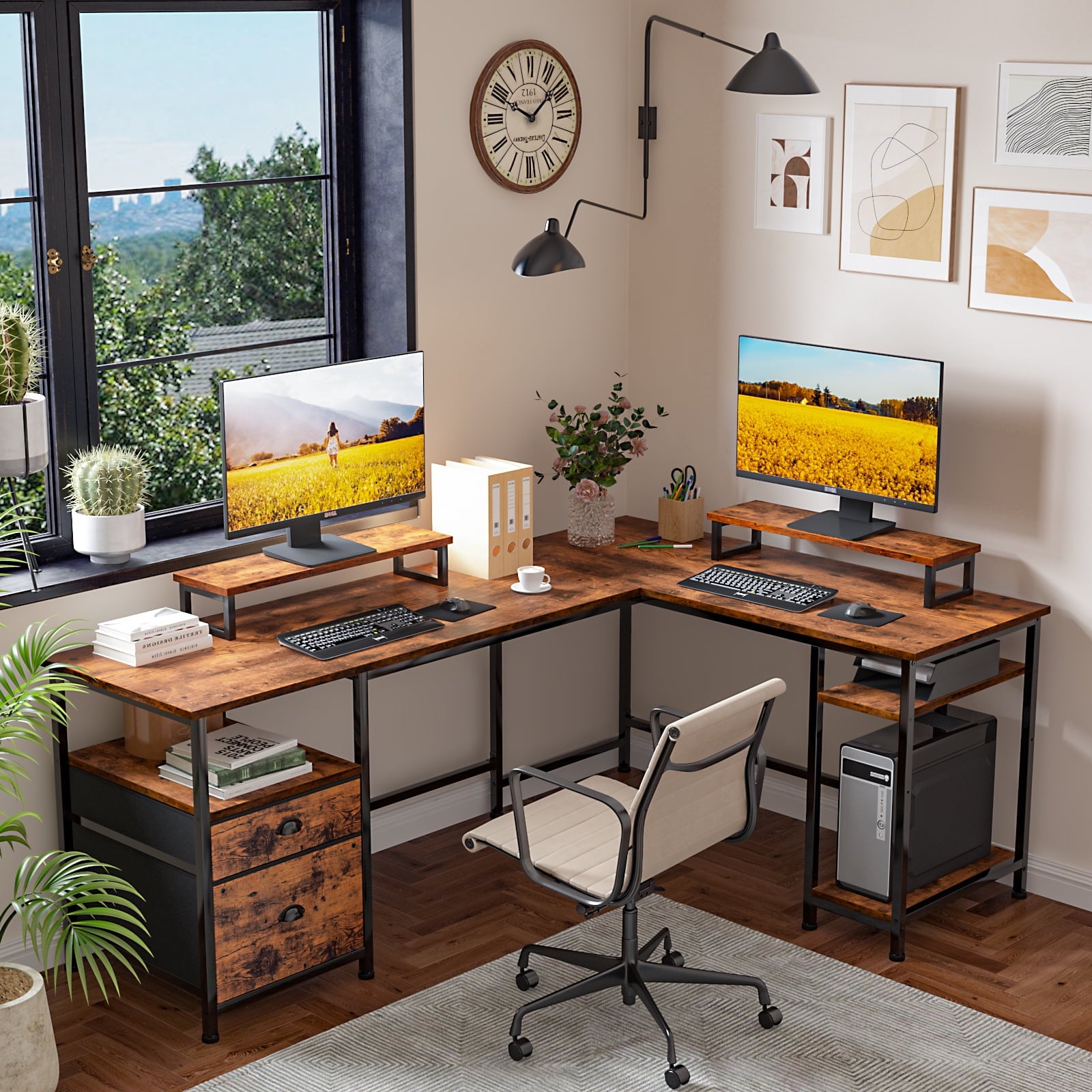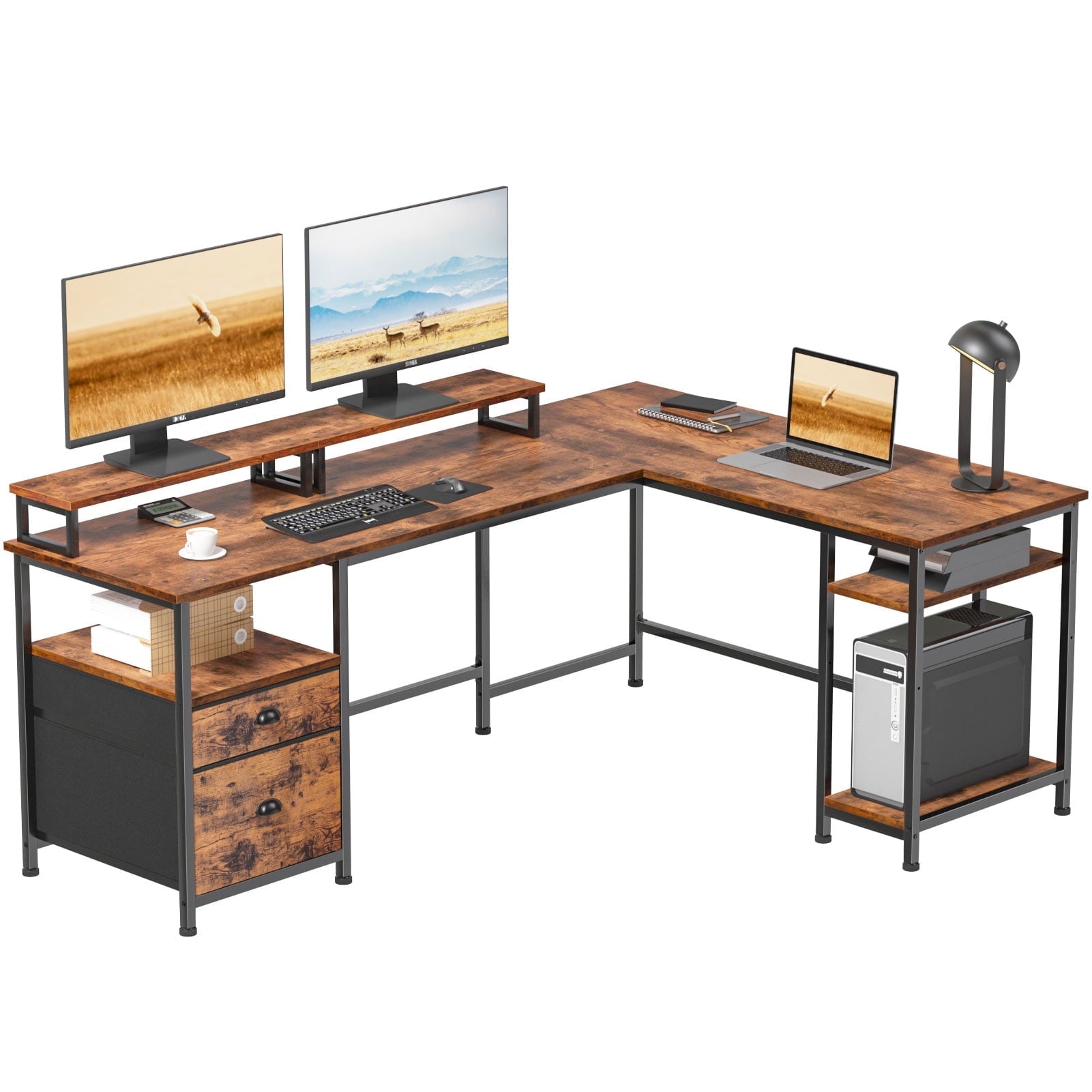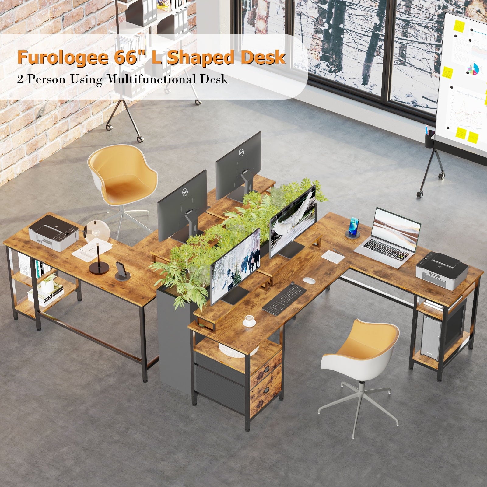 Furologee 66" L Shaped Computer Desk with Shelves, Reversible Corner Gaming Desk with Drawers & 2 Monitor Stands, Large Home Office Desk, Writing Study Table Workstation, Rustic Brown