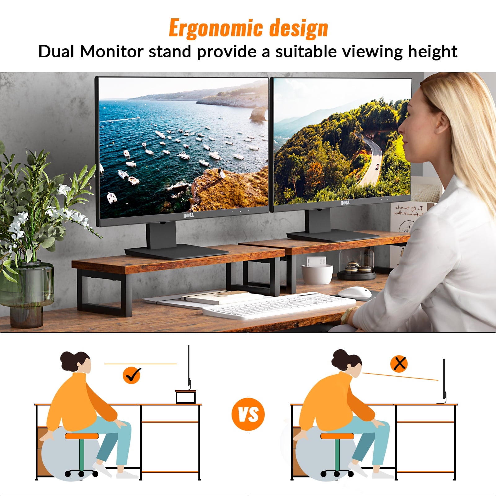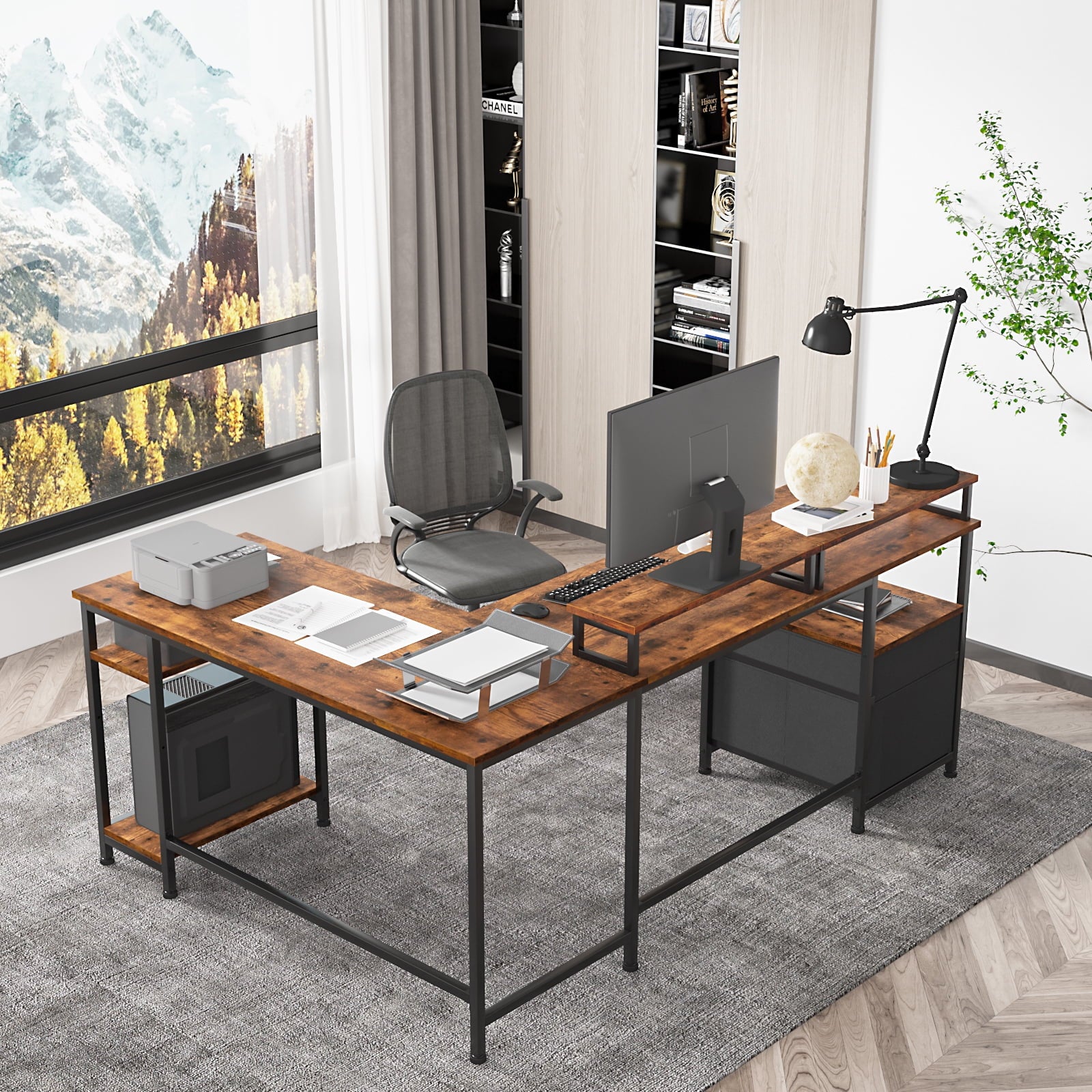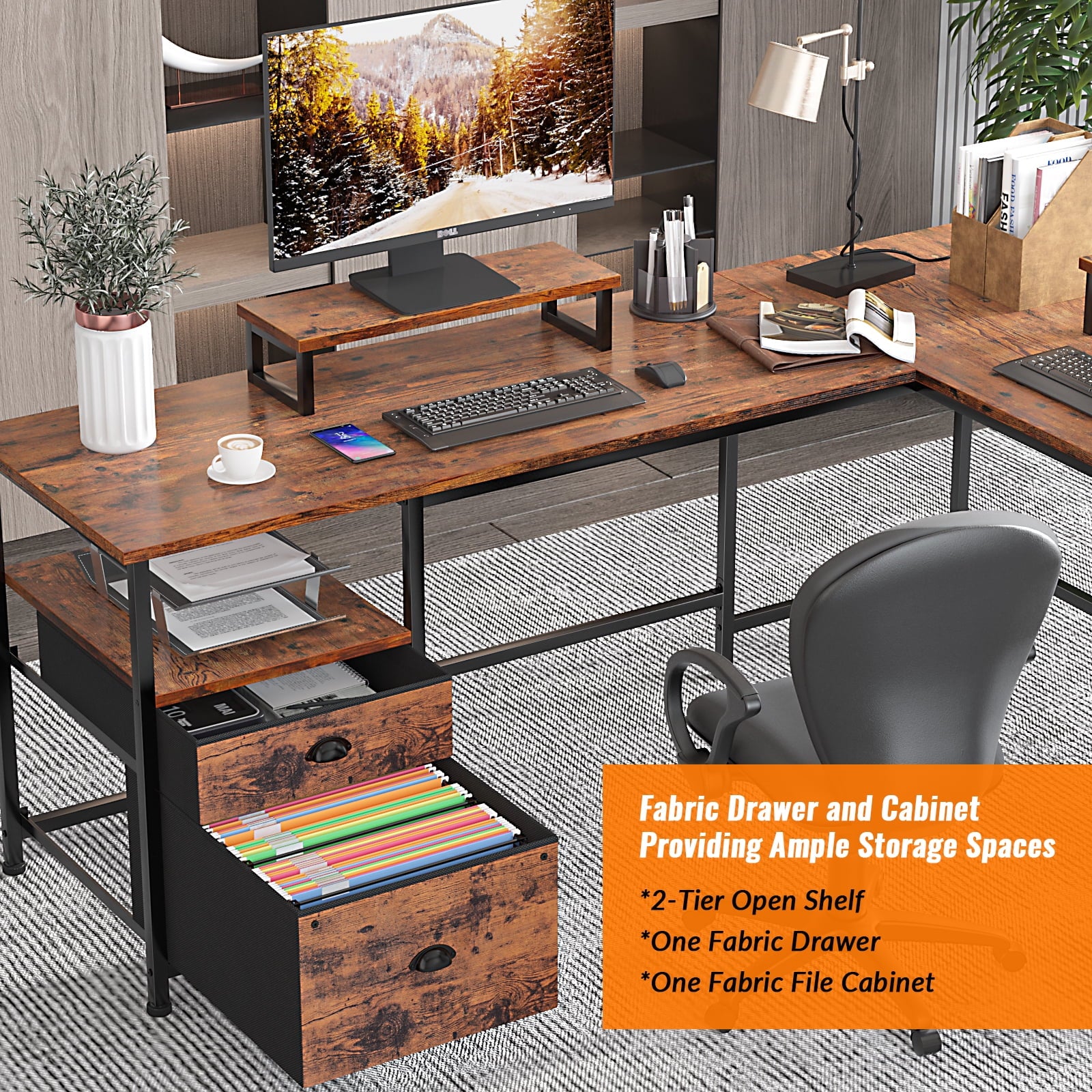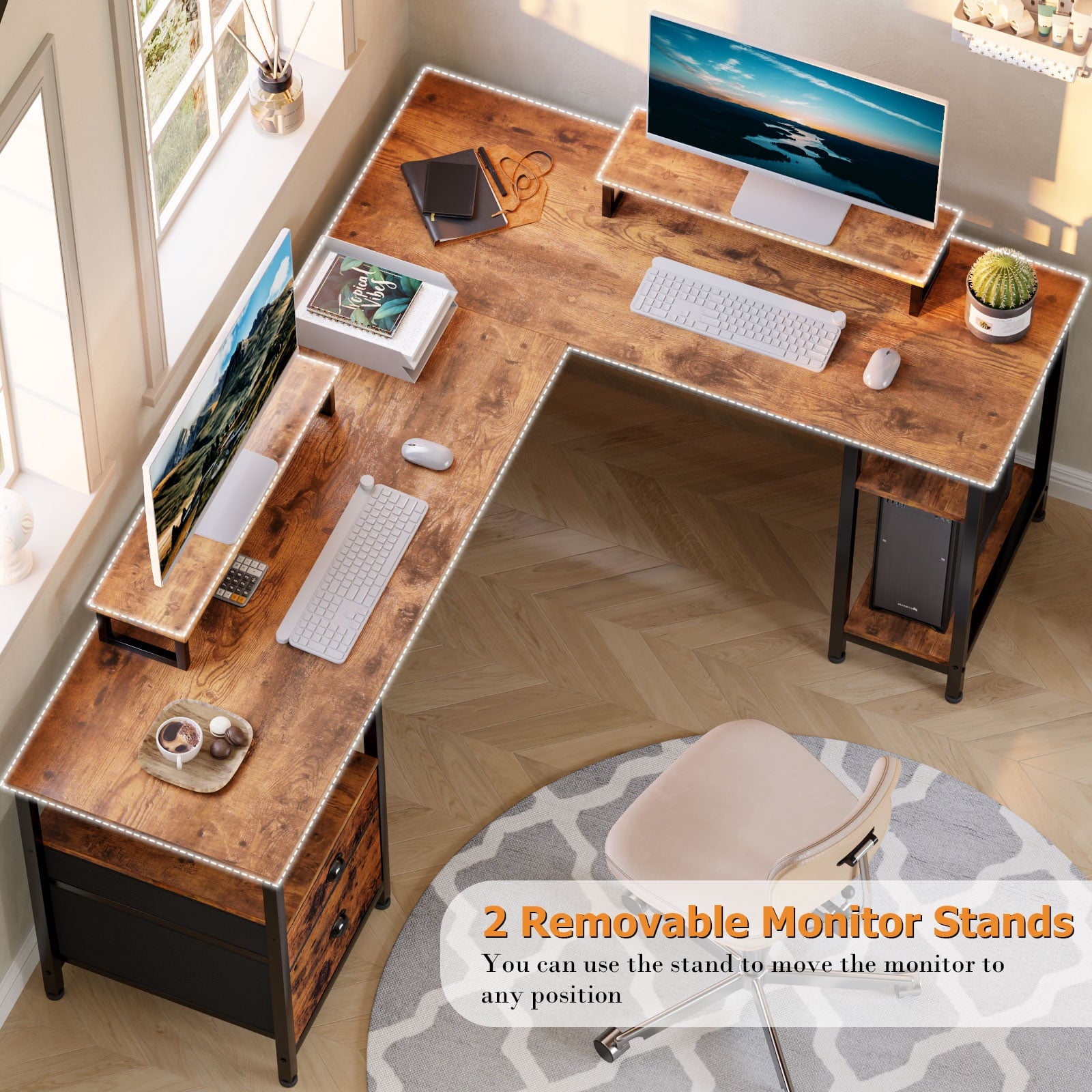 Furologee 66" L Shaped Computer Desk with Shelves, Reversible Corner Gaming Desk with Drawers & 2 Monitor Stands, Large Home Office Desk, Writing Study Table Workstation, Rustic Brown