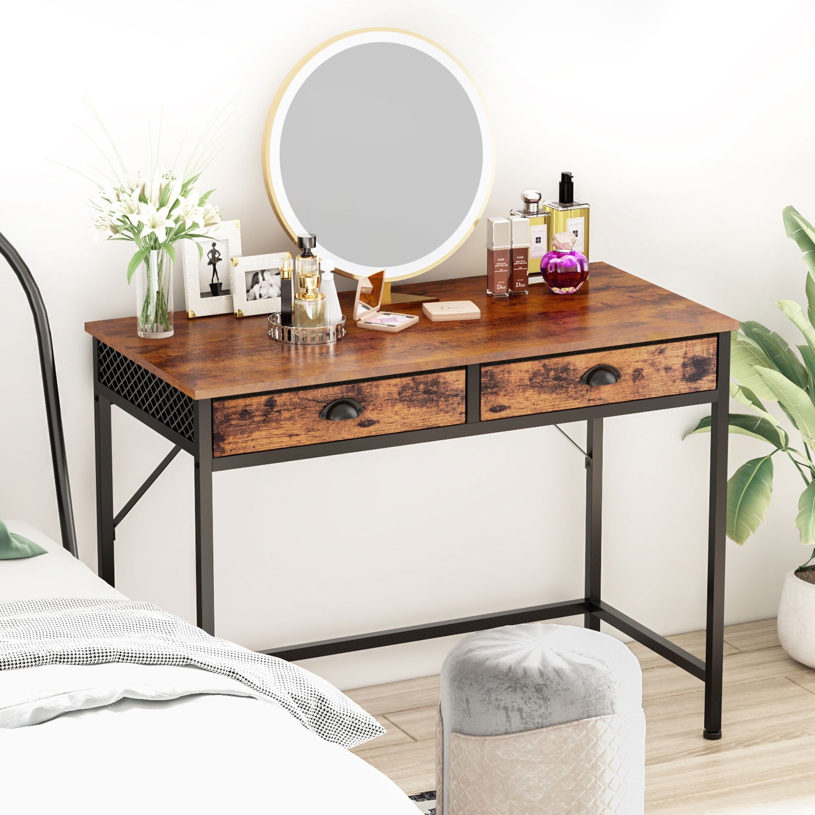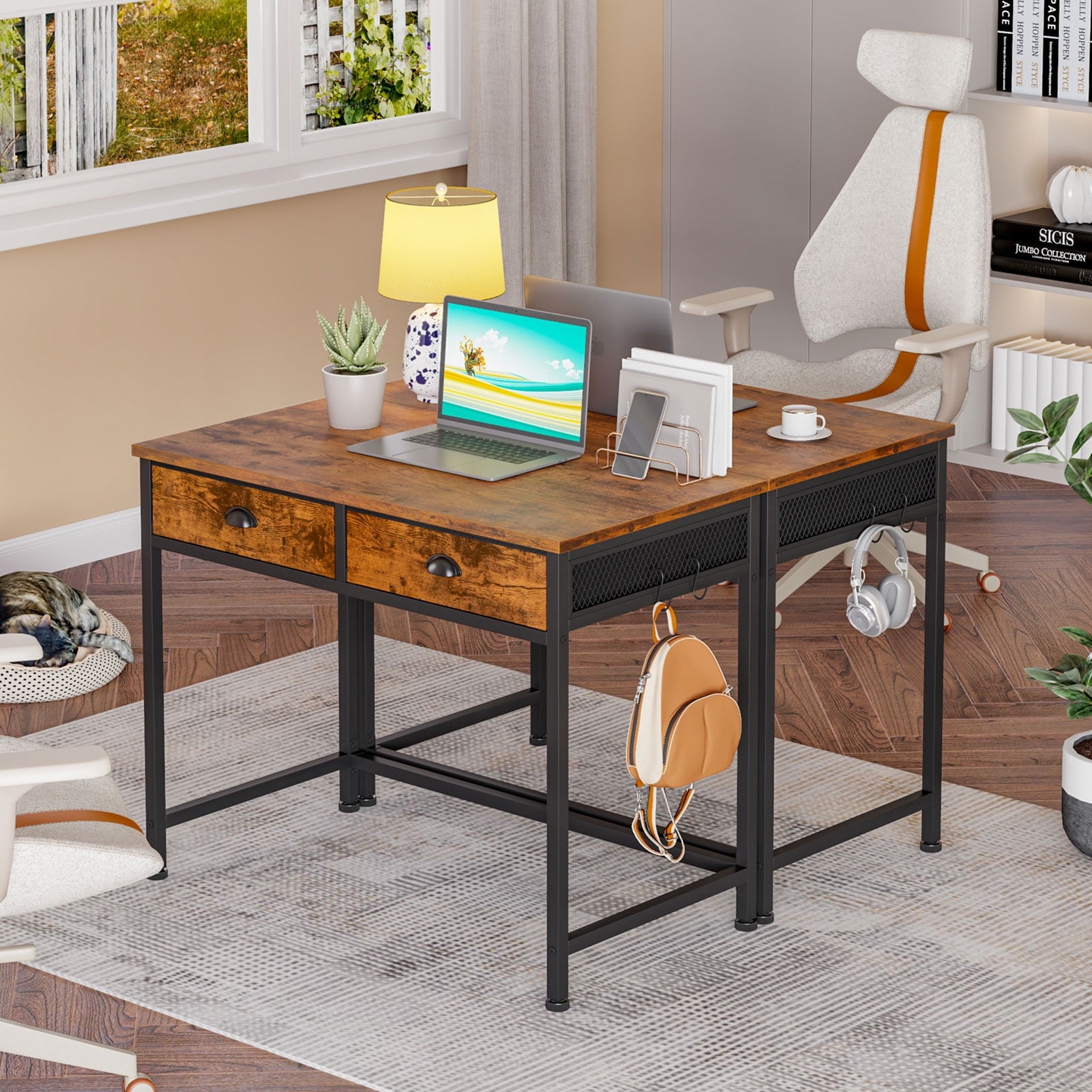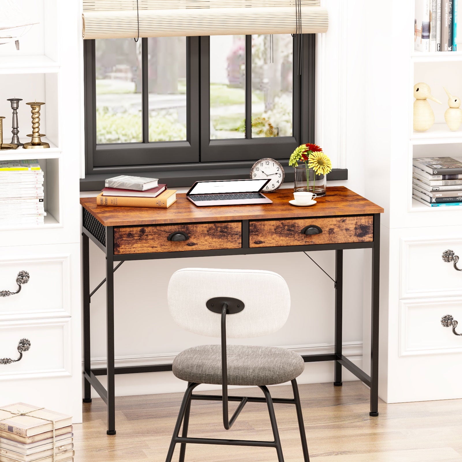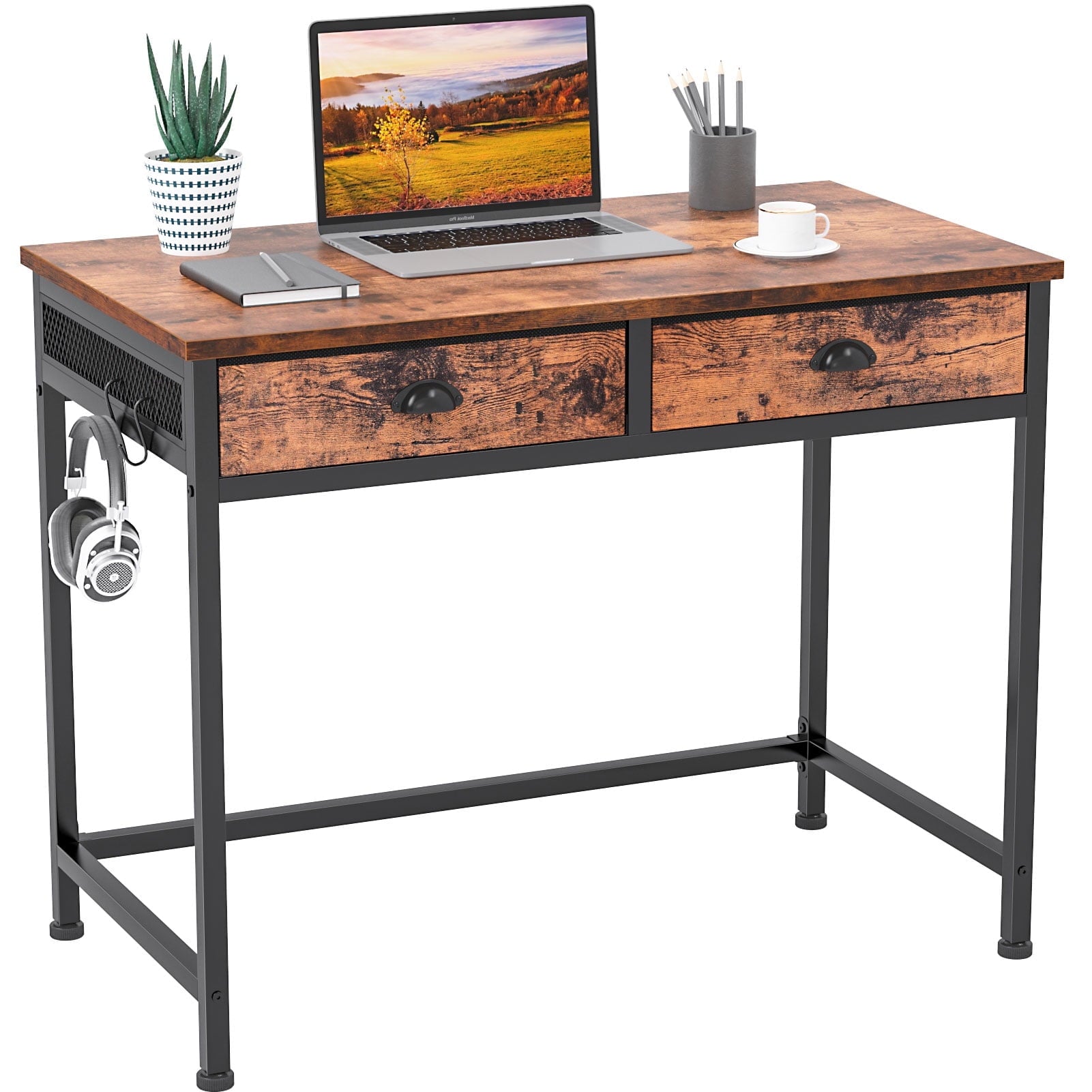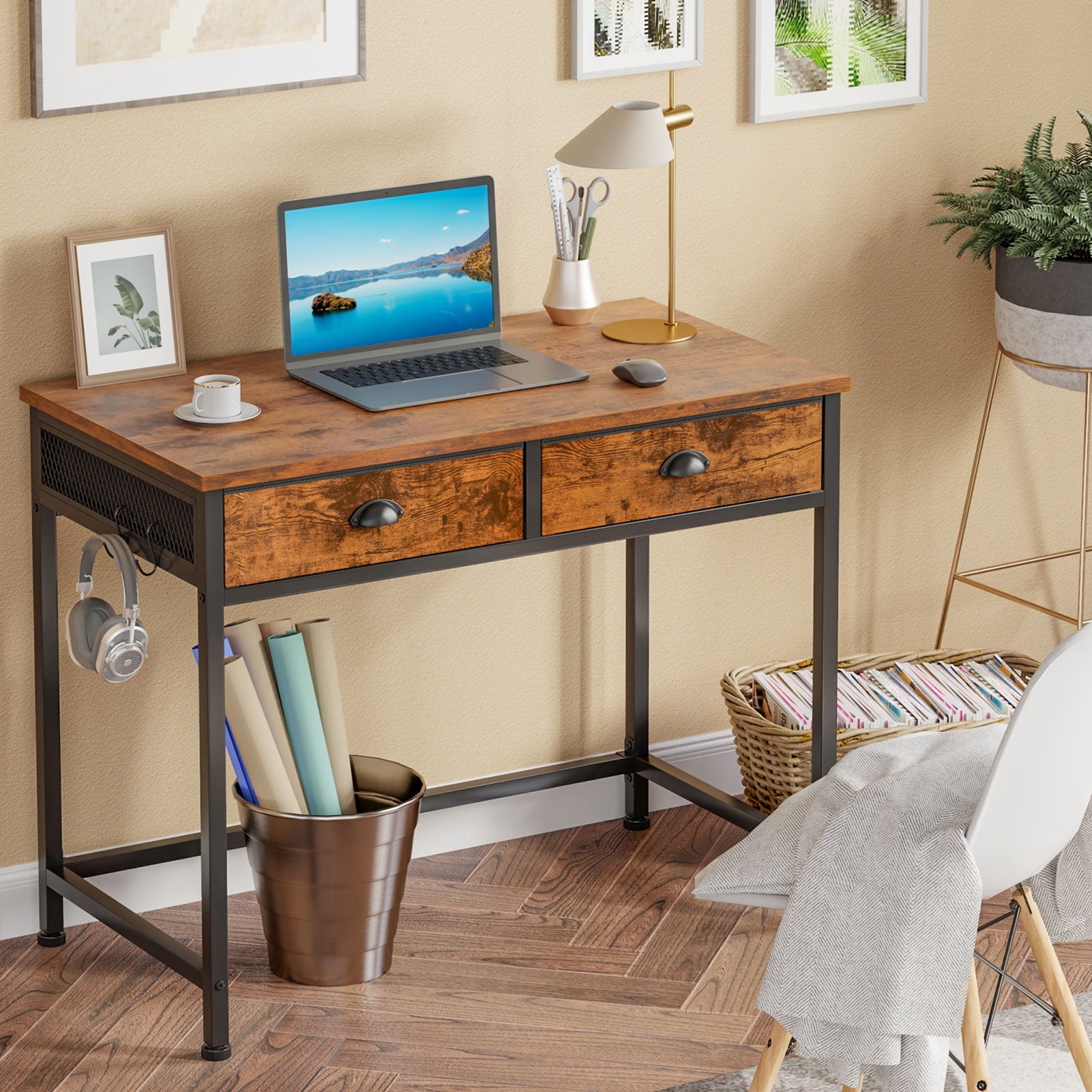 Furologee Computer Desk with 2 Fabric Drawers, 36" Home Office Writing Desk, Vanity Desk with Hooks, Study Desk for Small Spaces, Makeup Dressing Table, Rustic Brown