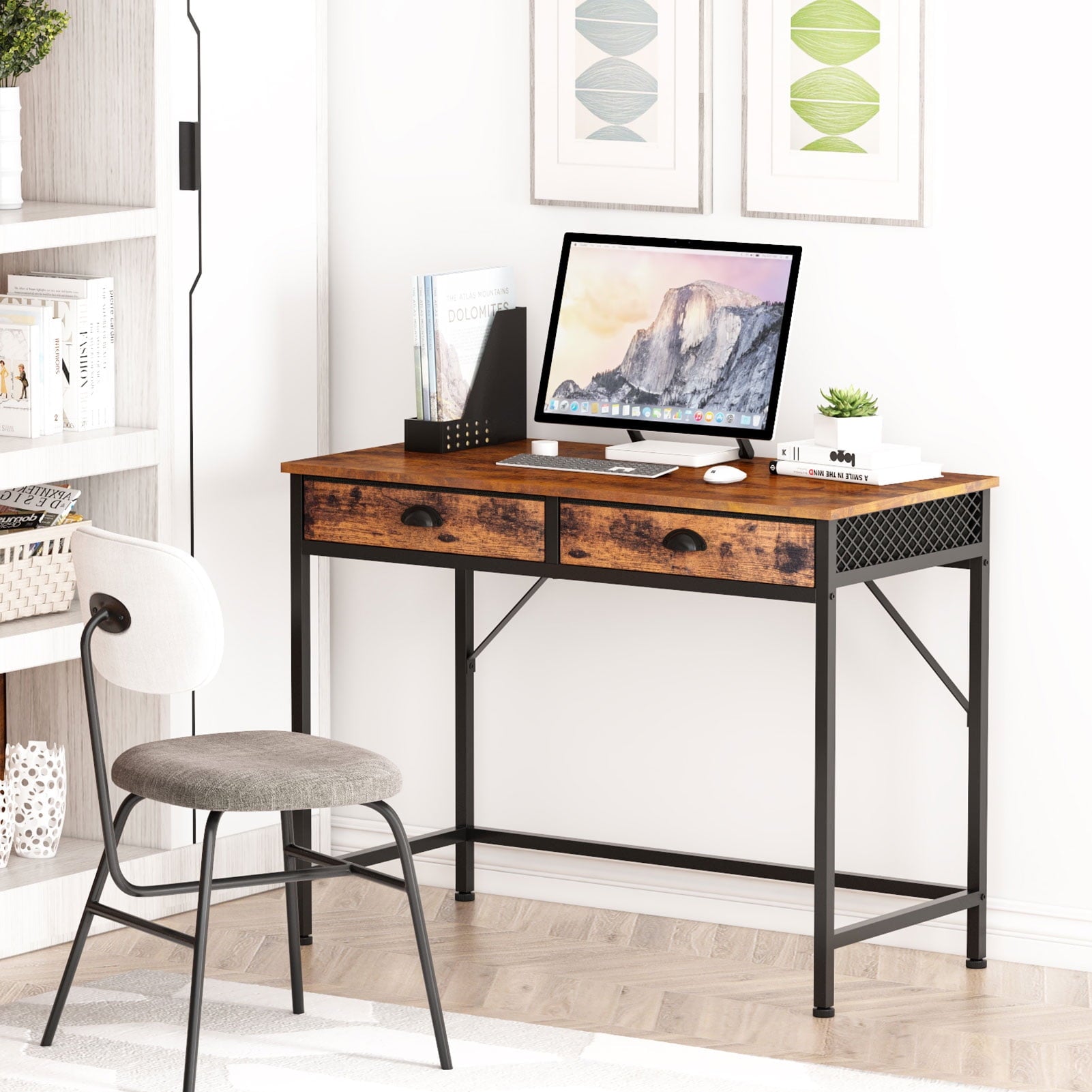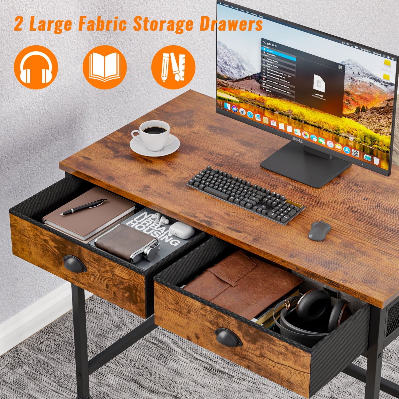 Furologee Computer Desk Home Office Writing Desk with 2 Fabric Drawers, Rustic Brown