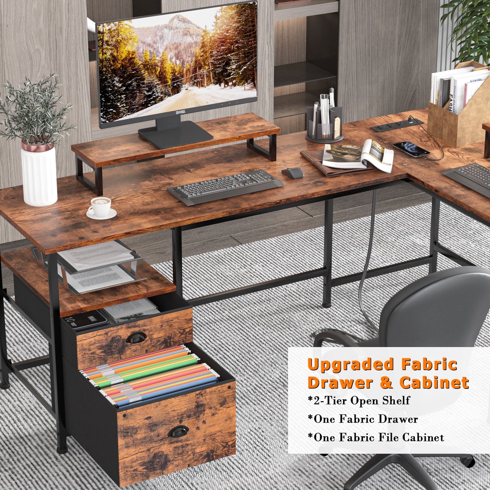 Furologee Computer Desk L-Shaped Reversible Desk with Drawers and 2 Monitor Stands, Rustic Brown