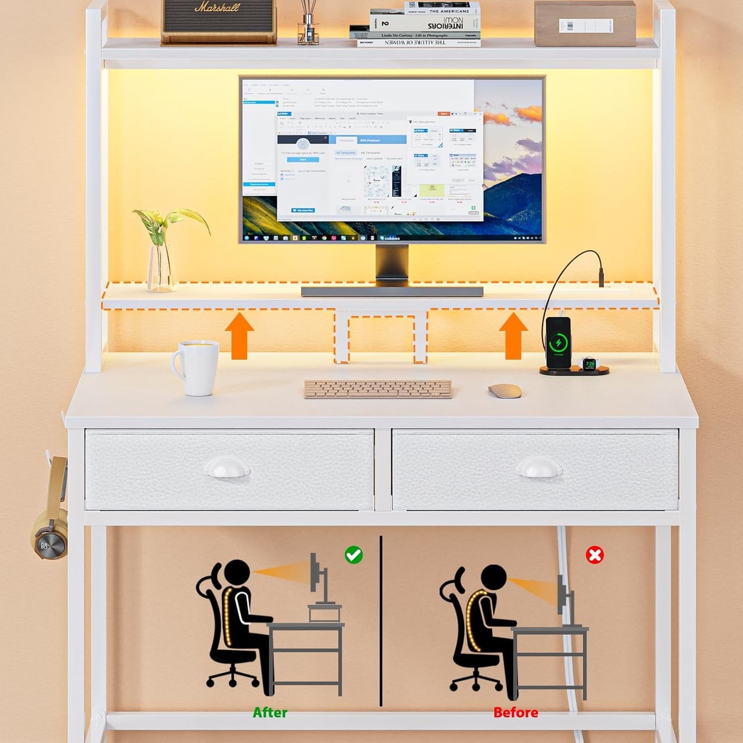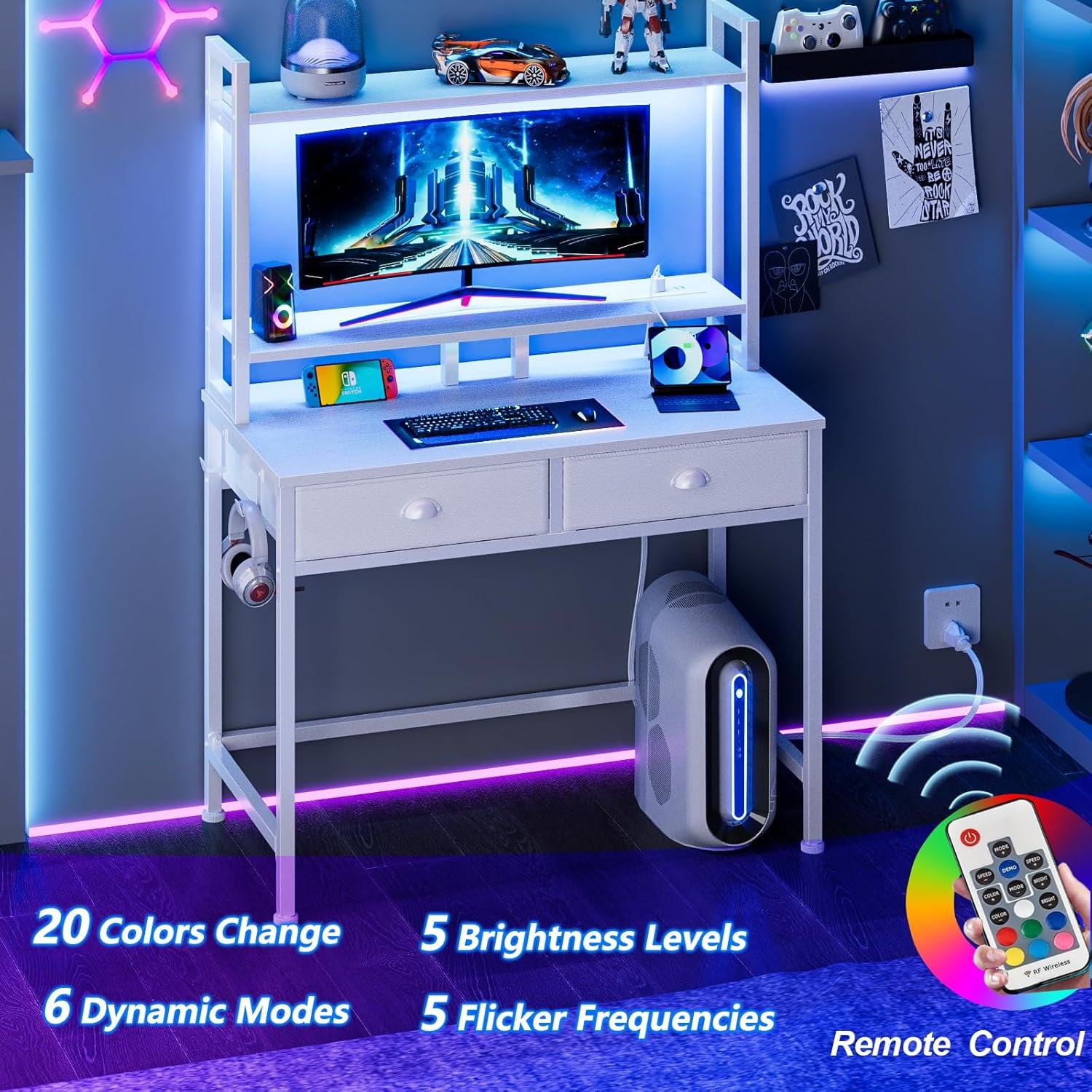 Furologee Small White Computer Desk with Power Outlet and 2 Fabric Drawers, Gaming Desk with LED Light, Home Office Desk with Monitor Stand and Hutch, Study Table with Shelf