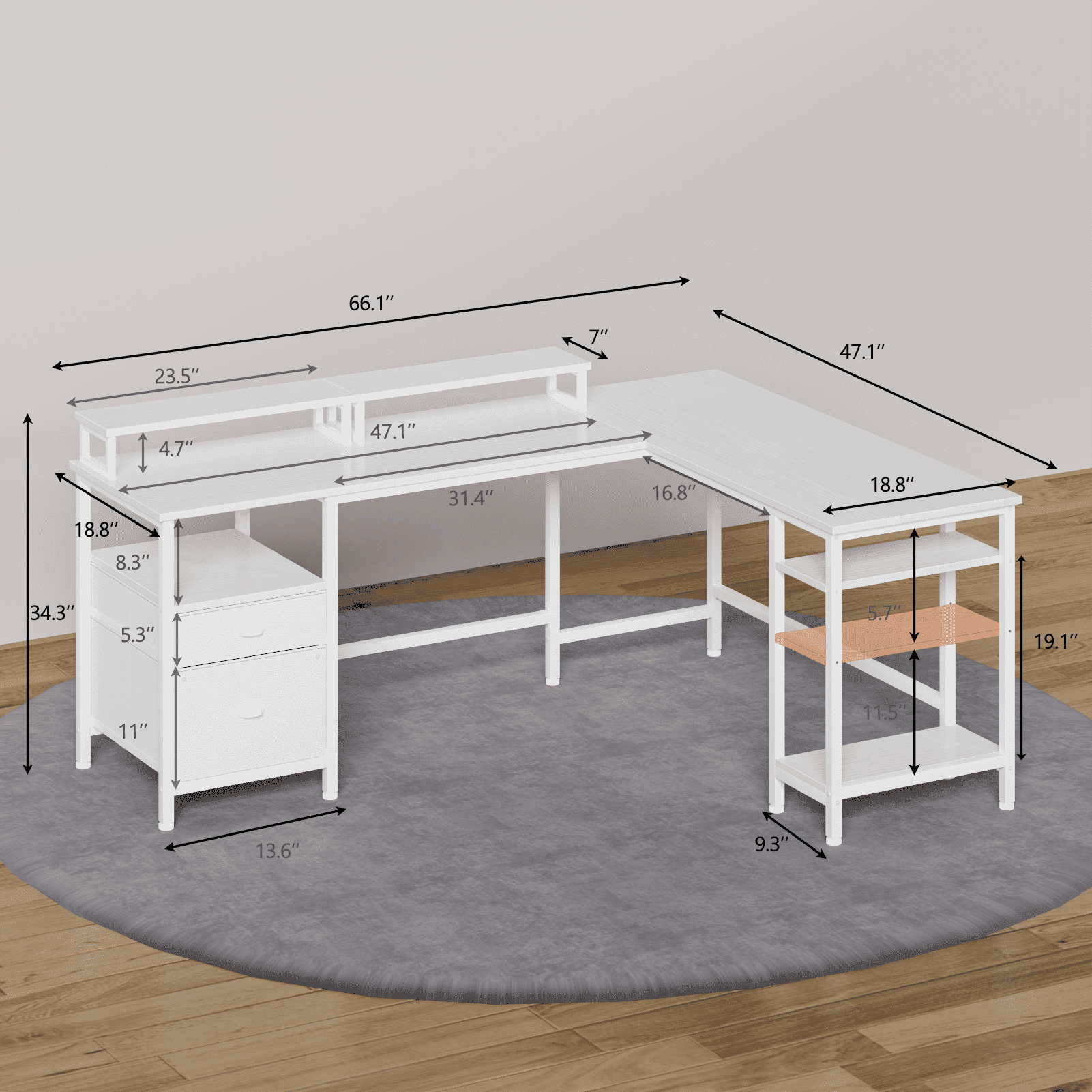 Hexmn Computer Desk, Adult Lap Desks, with Fabric Drawers, File Cabinet, Monitor Stands, 18.9 x 66.14 in, White
