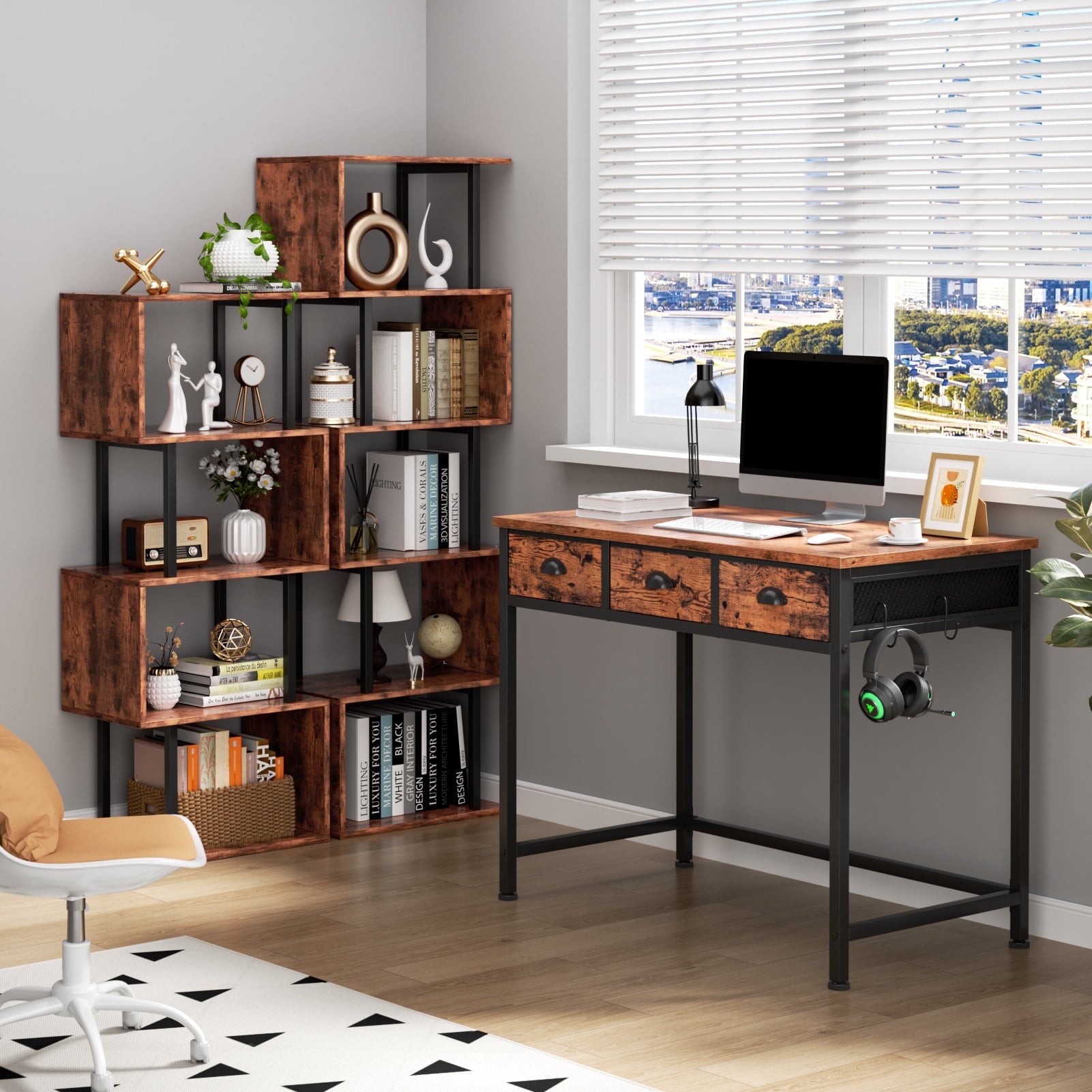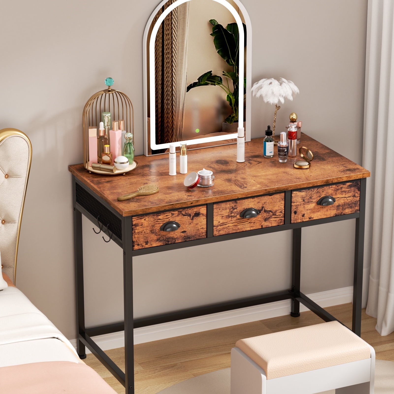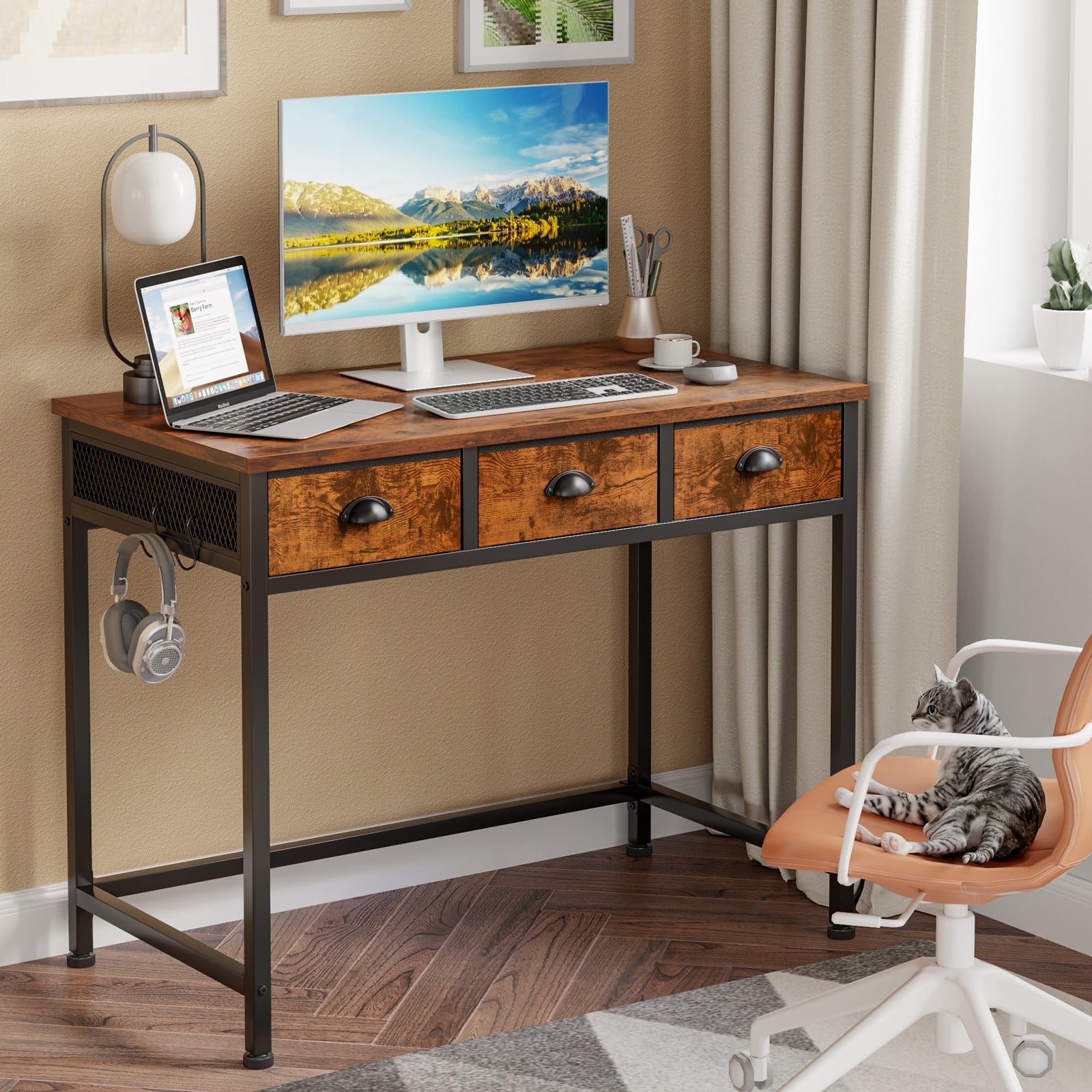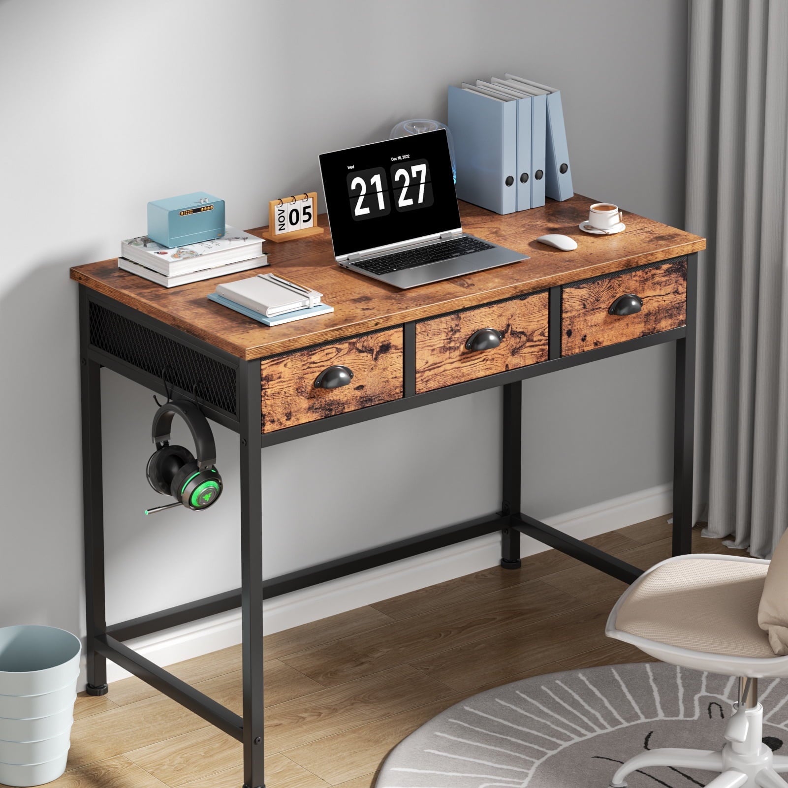 This stylish and functional desk features two fabric drawers and side hooks, perfect for storing items and organizing essentials like bags and headphones. It comes equipped with adjustable feet, non-slip pads, and a scratch-resistant surface. Versatile in design, this desk can be placed in your dining room, bedroom, or office, serving multiple purposes as a writing desk, study table, gaming station, or even a compact dresser.