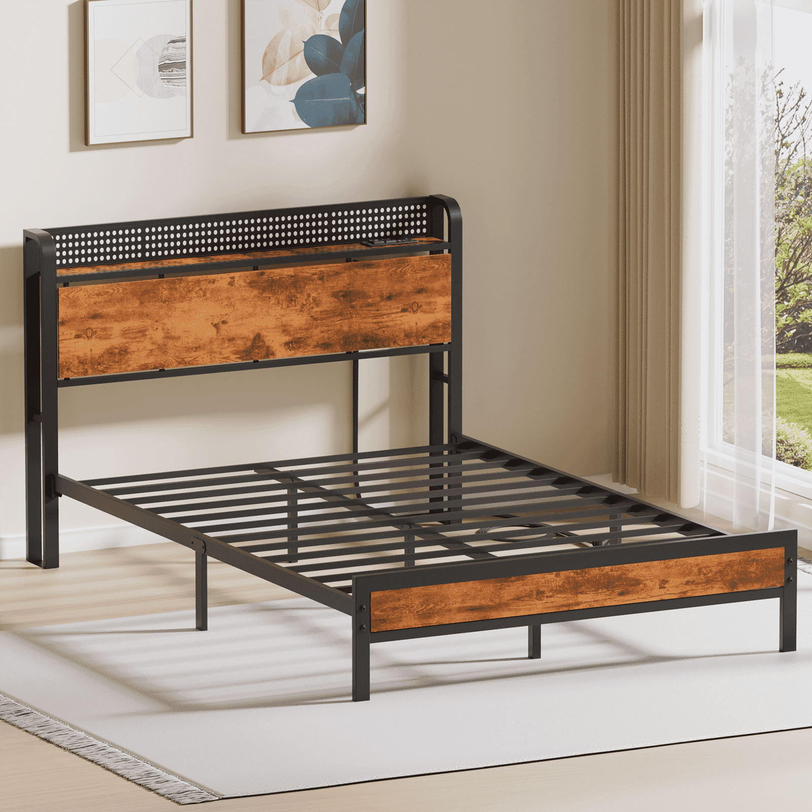 This metal bed frame combines durability, functionality, and modern design to elevate your bedroom experience. Featuring a sturdy metal frame with a rustic brown finish, it includes a multi-functional wooden headboard with a built-in shelf and integrated charging station for added convenience. The embedded design prevents mattress slippage, while the elevated frame offers ample under-bed storage space. Customizable LED light strips, controlled via remote or smartphone app, allow you to create the perfect ambiance. Easy to assemble and designed to fit seamlessly into any decor, this bed frame is perfect for those seeking a blend of style, practicality, and comfort.