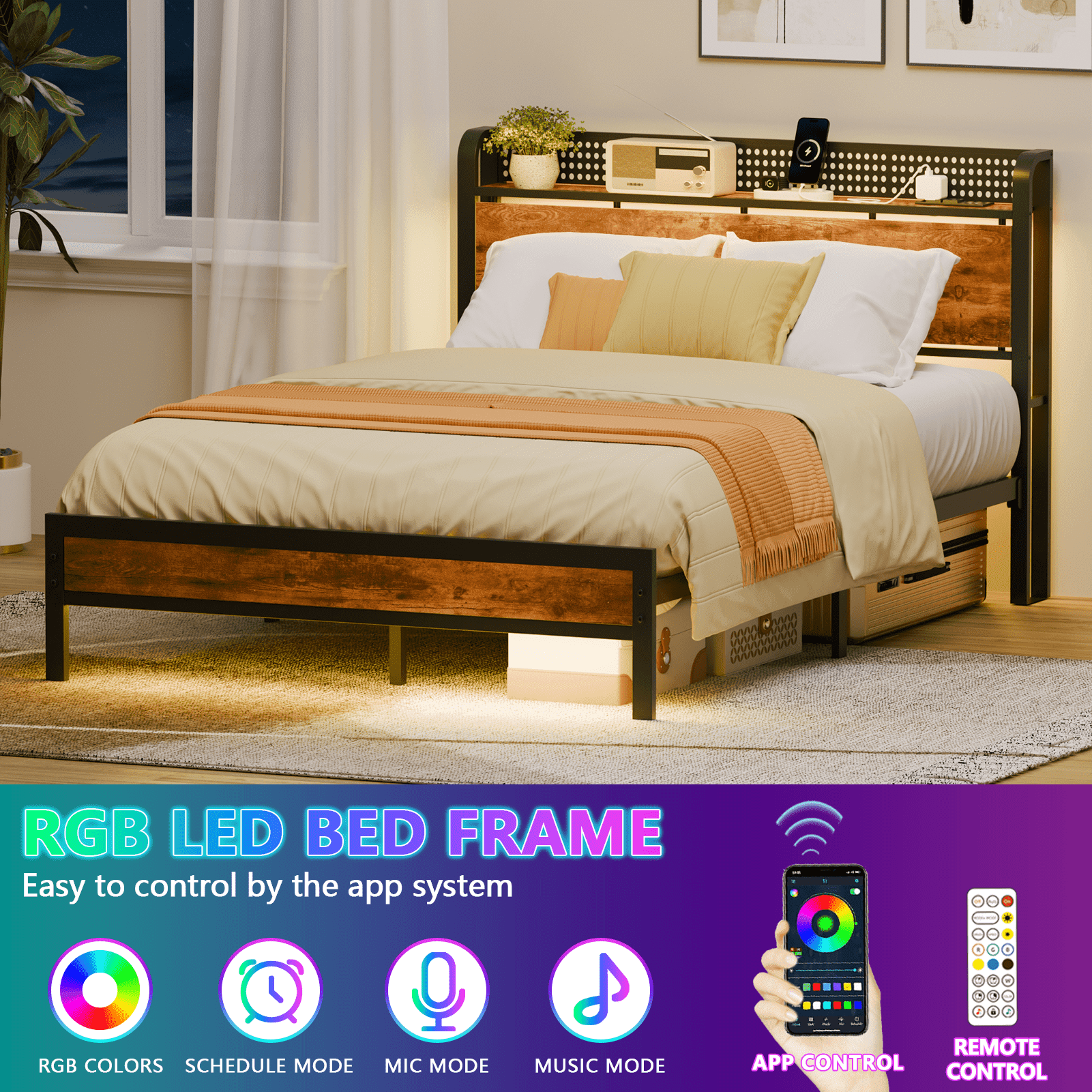 Hexmn Full RGB LED Strip Platforrm Bed Frames with Headboard Metal, Storage Shelves & Underbed, Niose Free, No Box Spring Needed