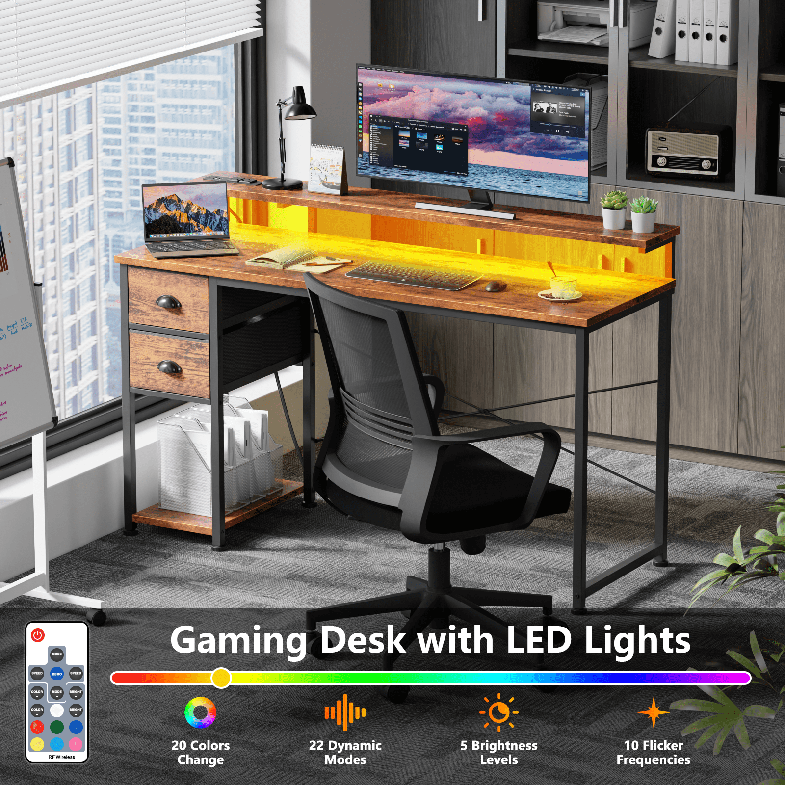 This gaming desk combines functionality and style, designed to meet the needs of modern users. The extended monitor stand and multi-purpose charging station cater to multi-device setups, while the 20-color LED light strip adds a dynamic and personalized touch to your workspace. The dual fabric drawers and adjustable shelf offer versatile storage solutions, and the sturdy metal frame ensures long-lasting durability. Whether you're gaming, working, or studying, this desk delivers exceptional support and a comfortable experience. Perfect for gamers, professionals, and students alike!