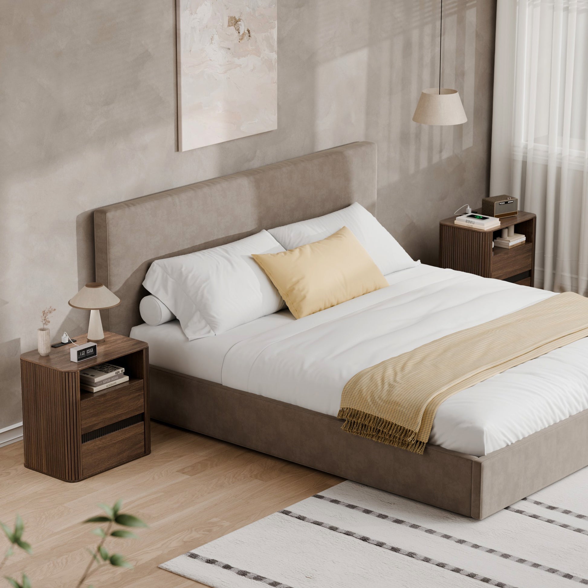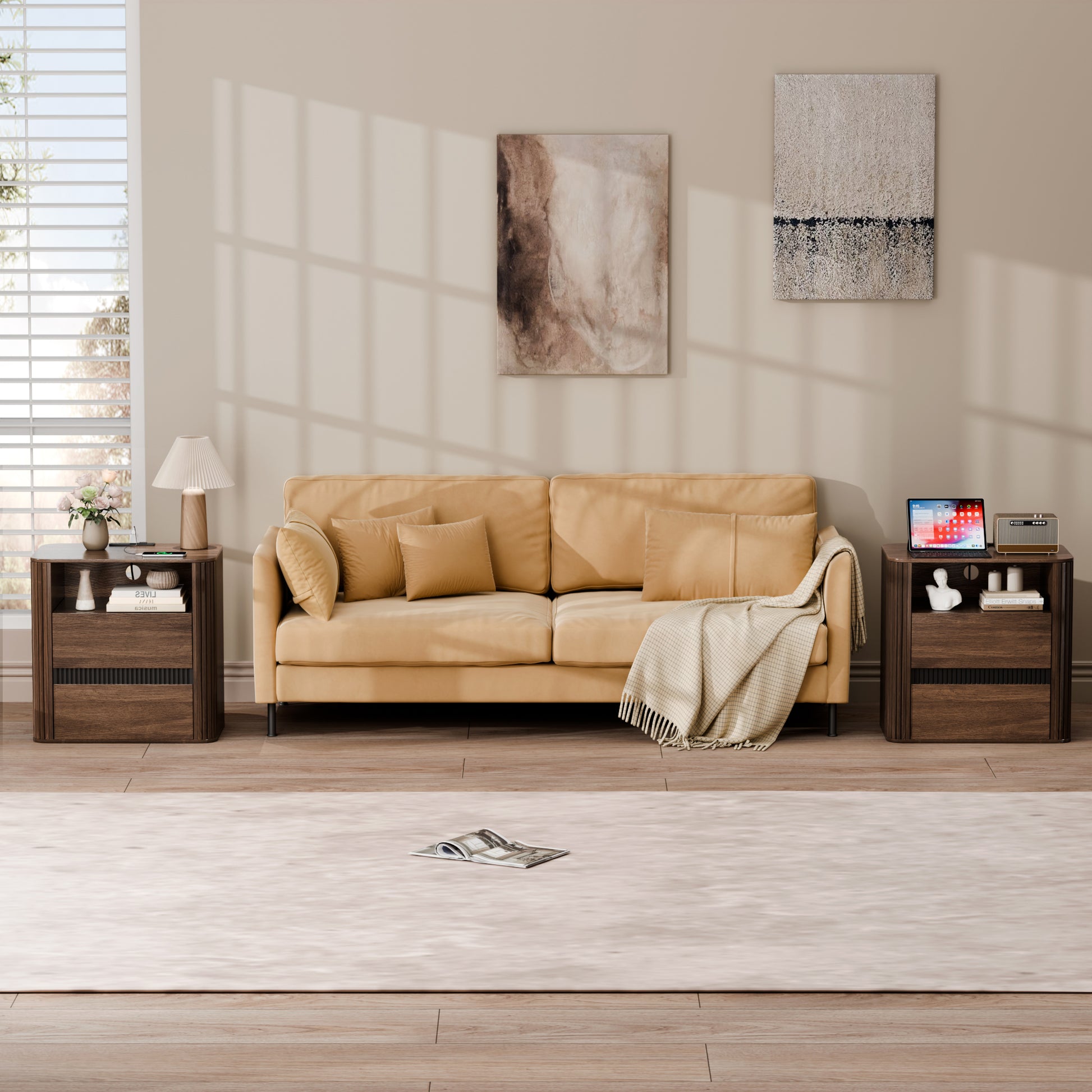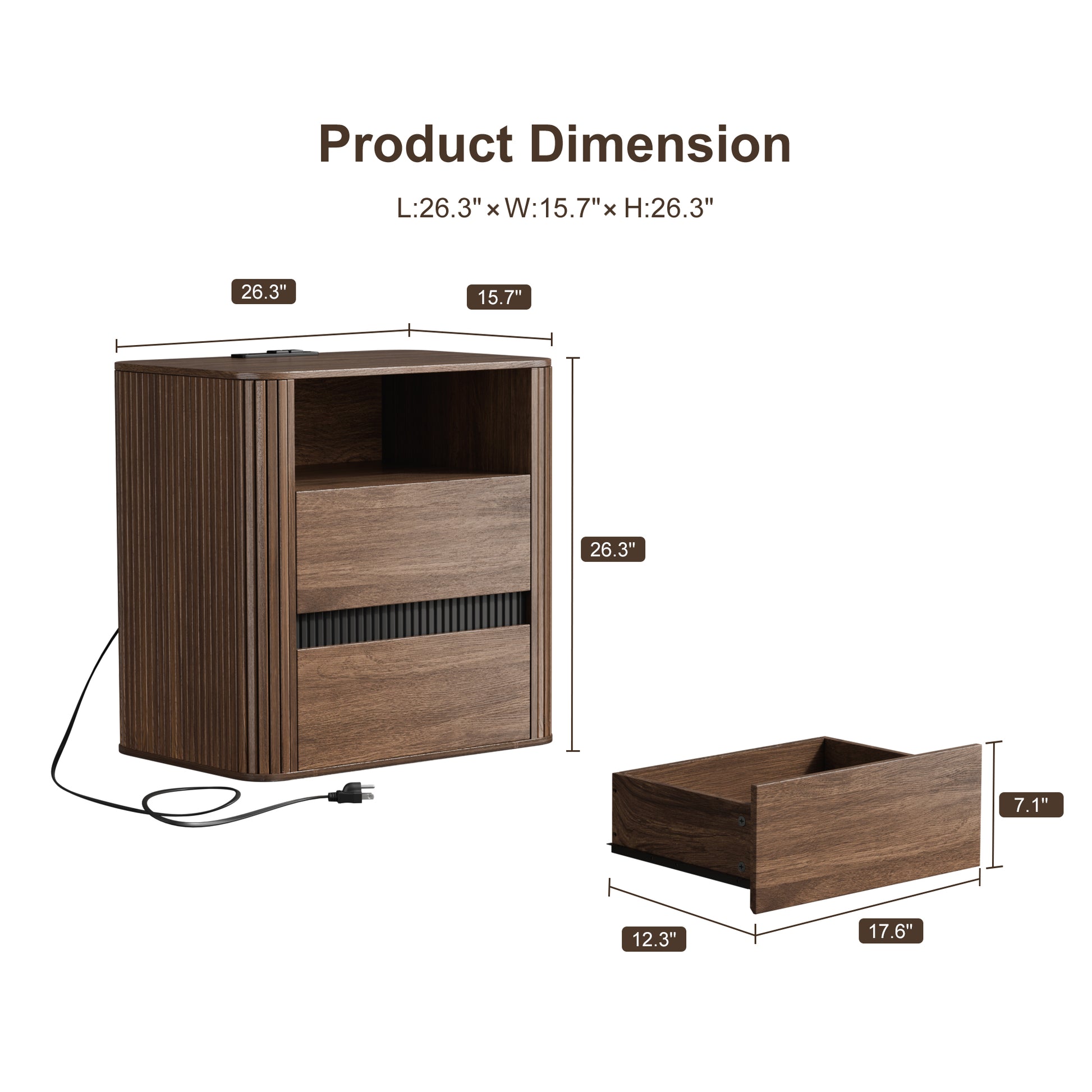 The Satifur multifunctional nightstand combines practical charging solutions with stylish storage. It features a built-in power strip with 2 AC outlets and 2 USB ports plus an extension cord for convenient device charging. Two spacious drawers and a large tabletop offer ample room for essentials and decor. Crafted from high-density MDF with a walnut grain finish, it features smooth surfaces, invisible handles, and a unique corrugated design for a mid-century modern look. It serves perfectly as a bedside table, end table, or living room side table.