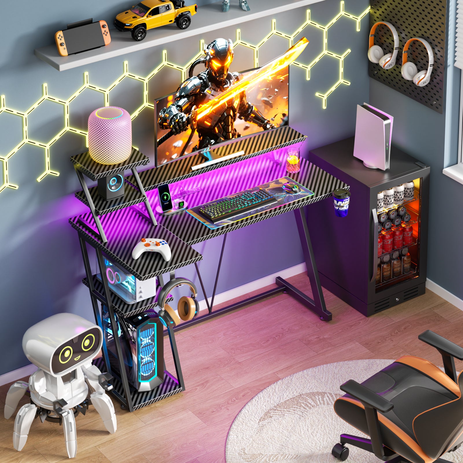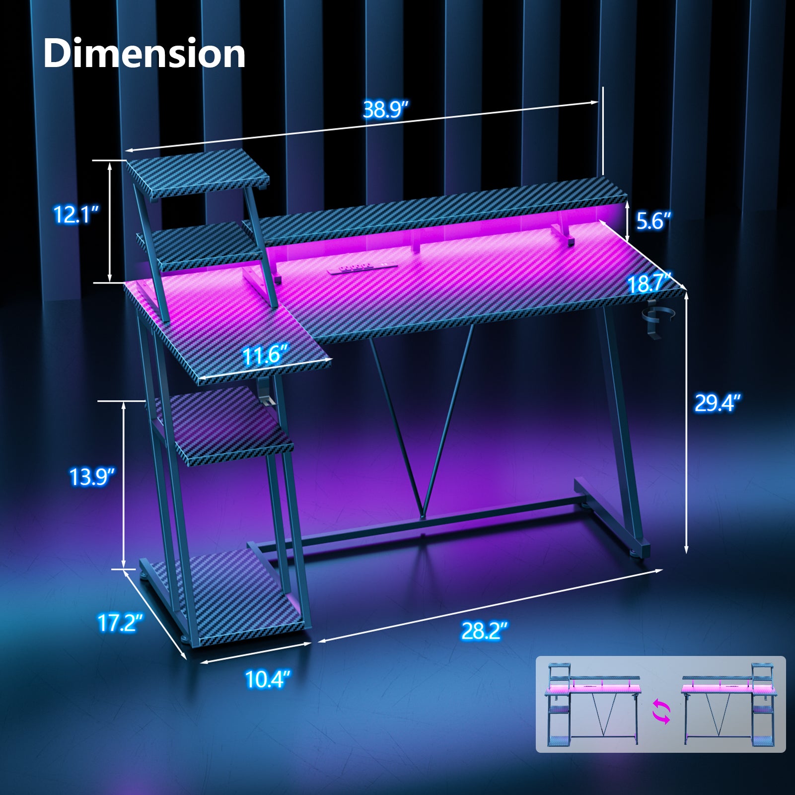 Satifur 39" Carbon Fiber Gaming Desk L-Shaped Computer Desk, RGB Lights & Power Outlets, Black