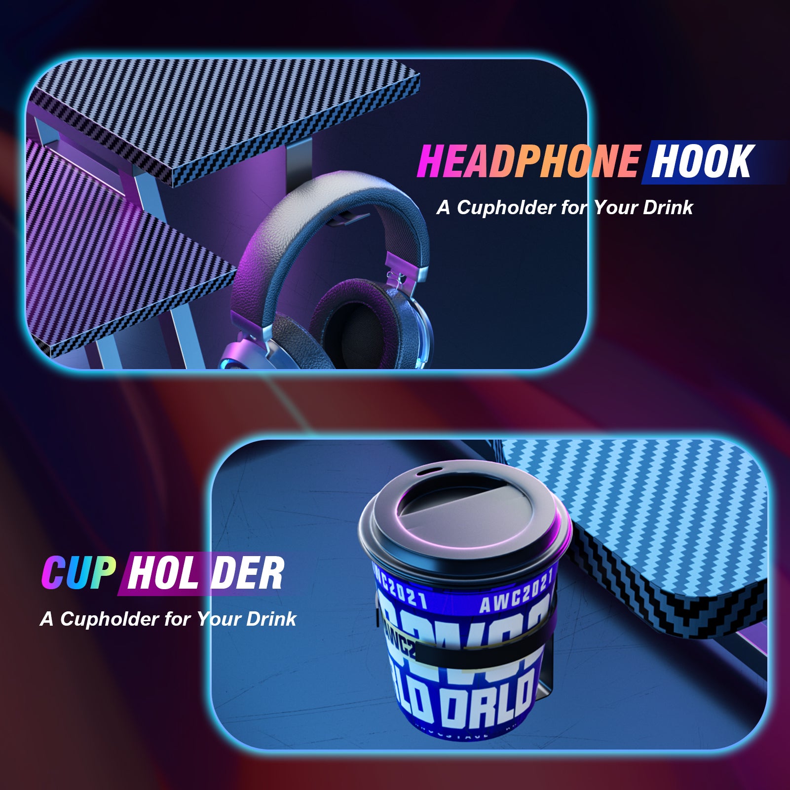 TACTICAL STORAGE & ERGONOMICS: Every inch is designed for efficiency. The elevated monitor stand frees up valuable play space and improves posture. Two additional desktop shelves, a cup holder, and a headphone hook ensure all your gear is deployed within instant reach.