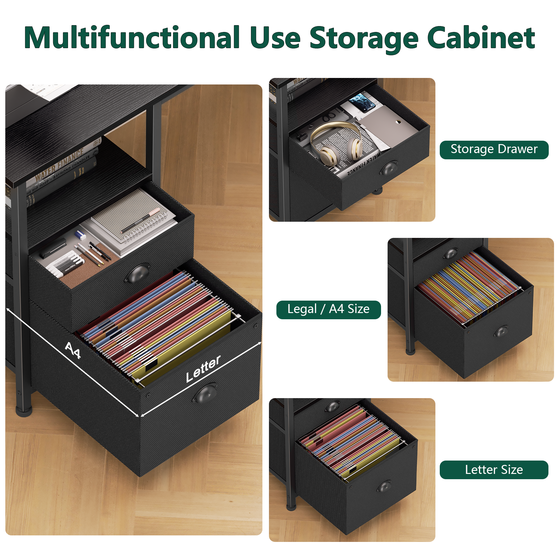 -- Includes a fabric drawer and file cabinet for organized storage.