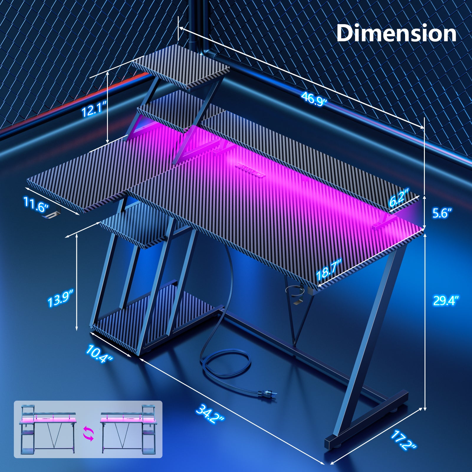 Satifur 47" Carbon Fiber Gaming Desk L-Shaped Computer Desk, RGB Lights & Power Outlets, Black