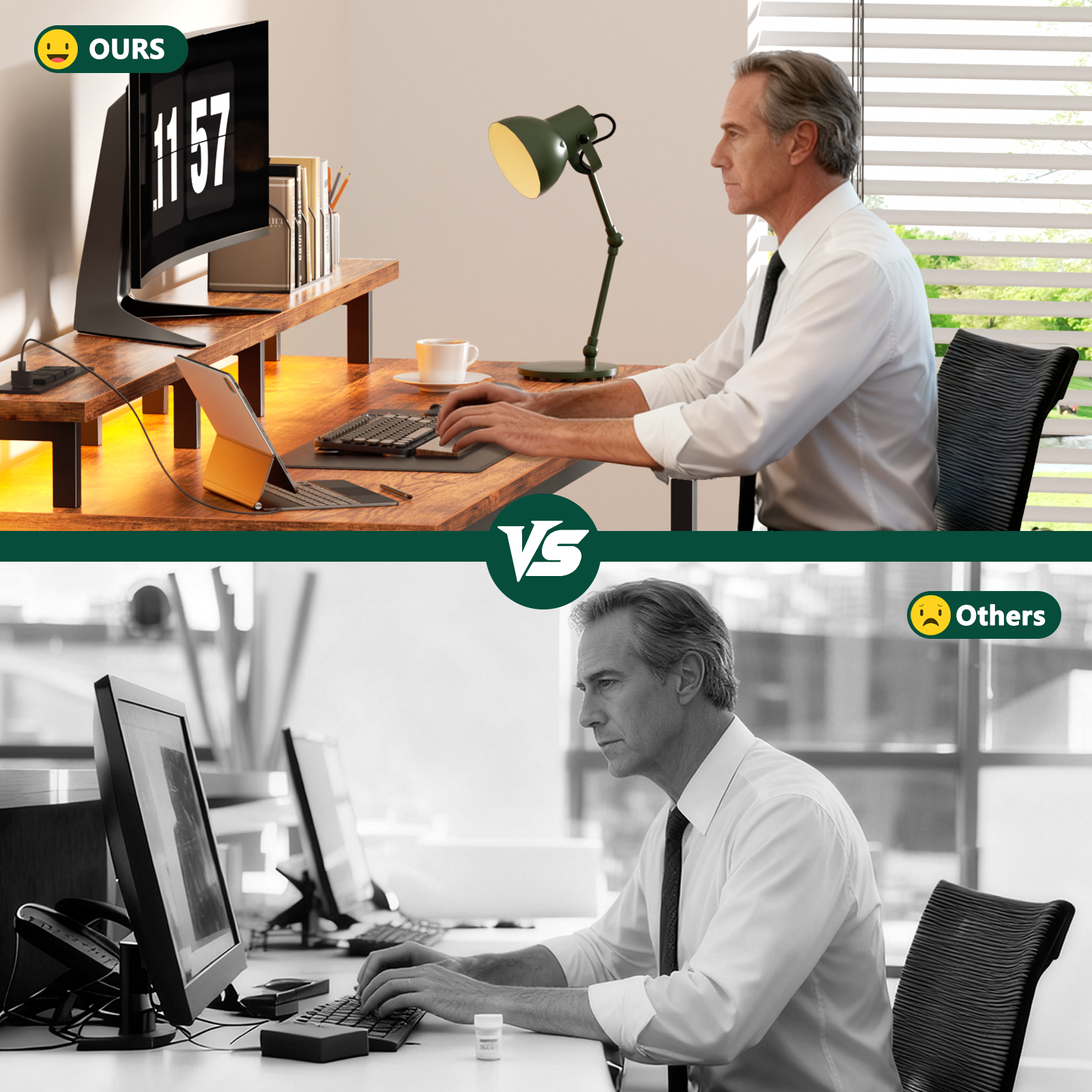 Ergonomic Design: A spacious, raised monitor stand helps reduce neck strain and provides additional desk space.