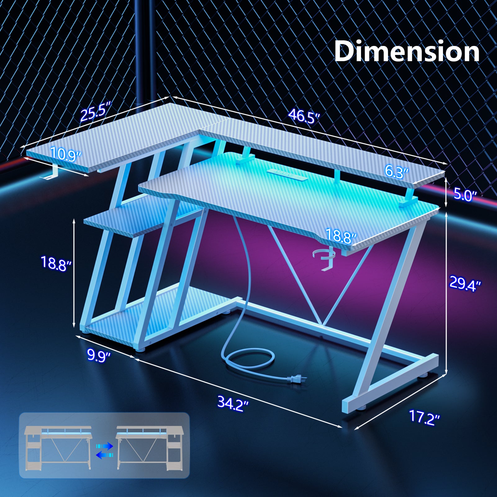 Satifur 47" Pro L-Shaped Gaming Desk White, RGB LED, Power Hub & Monitor Riser for Ultimate Setup