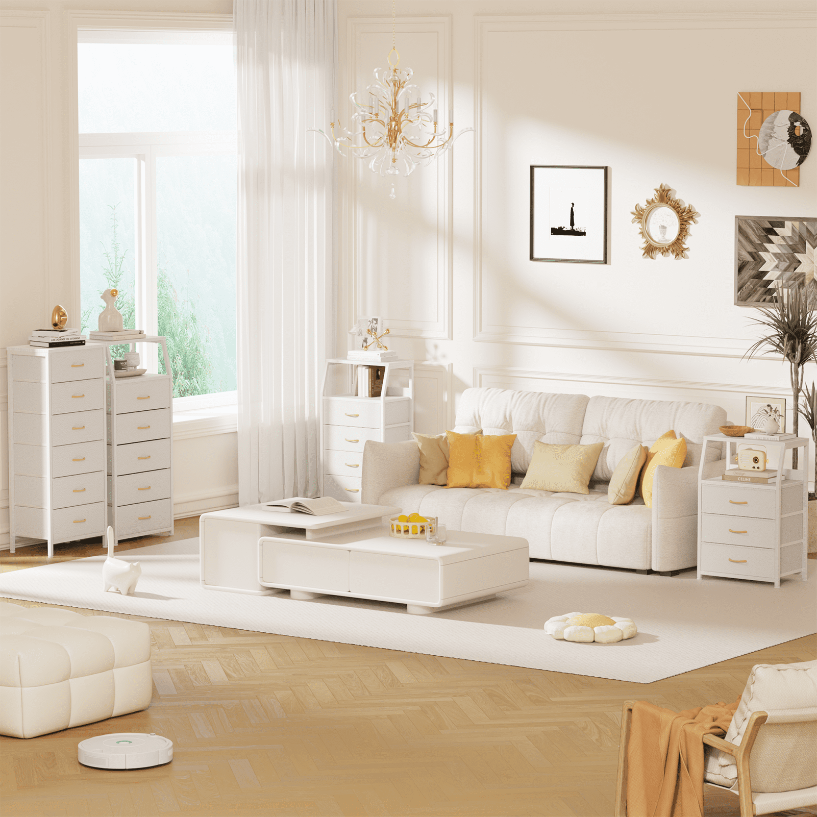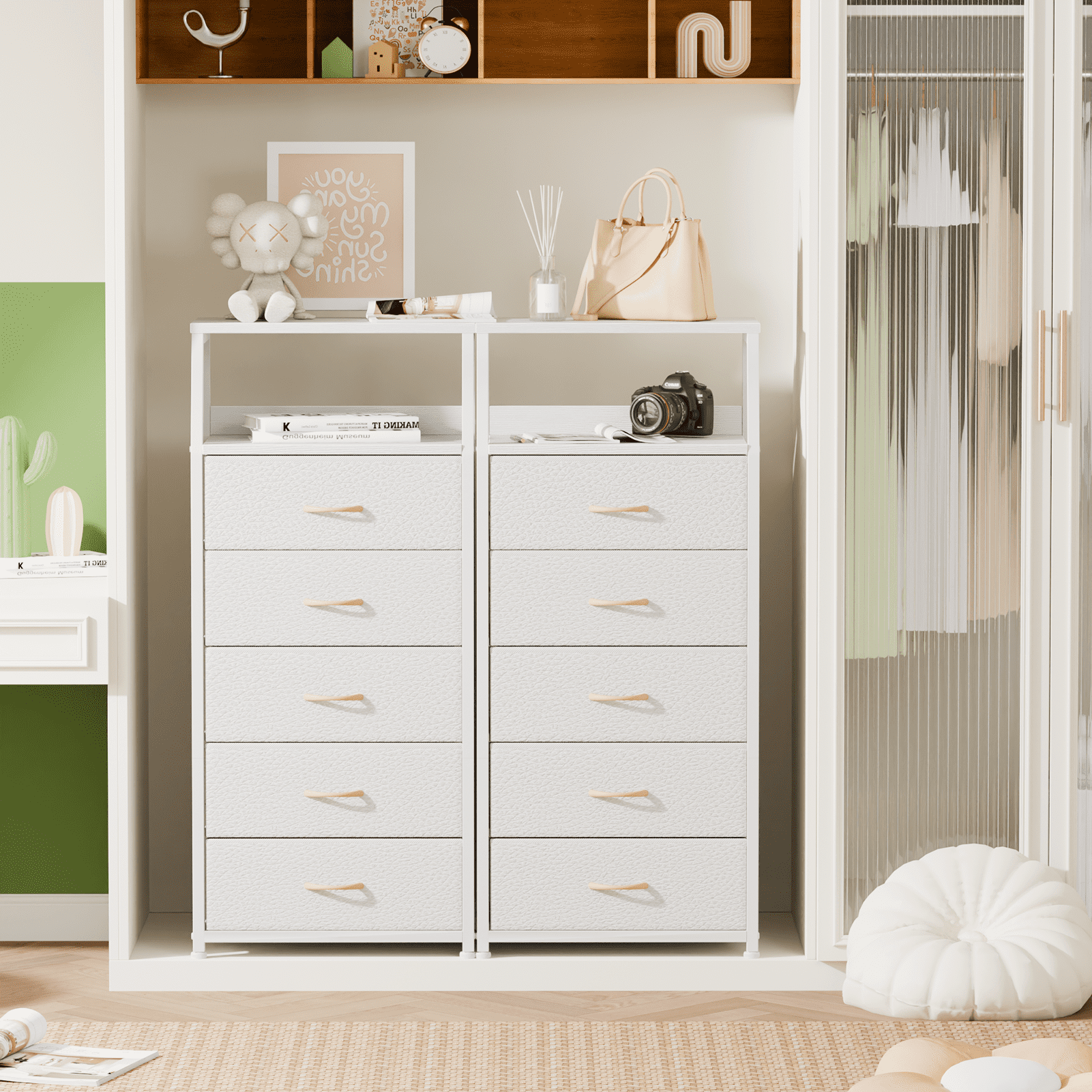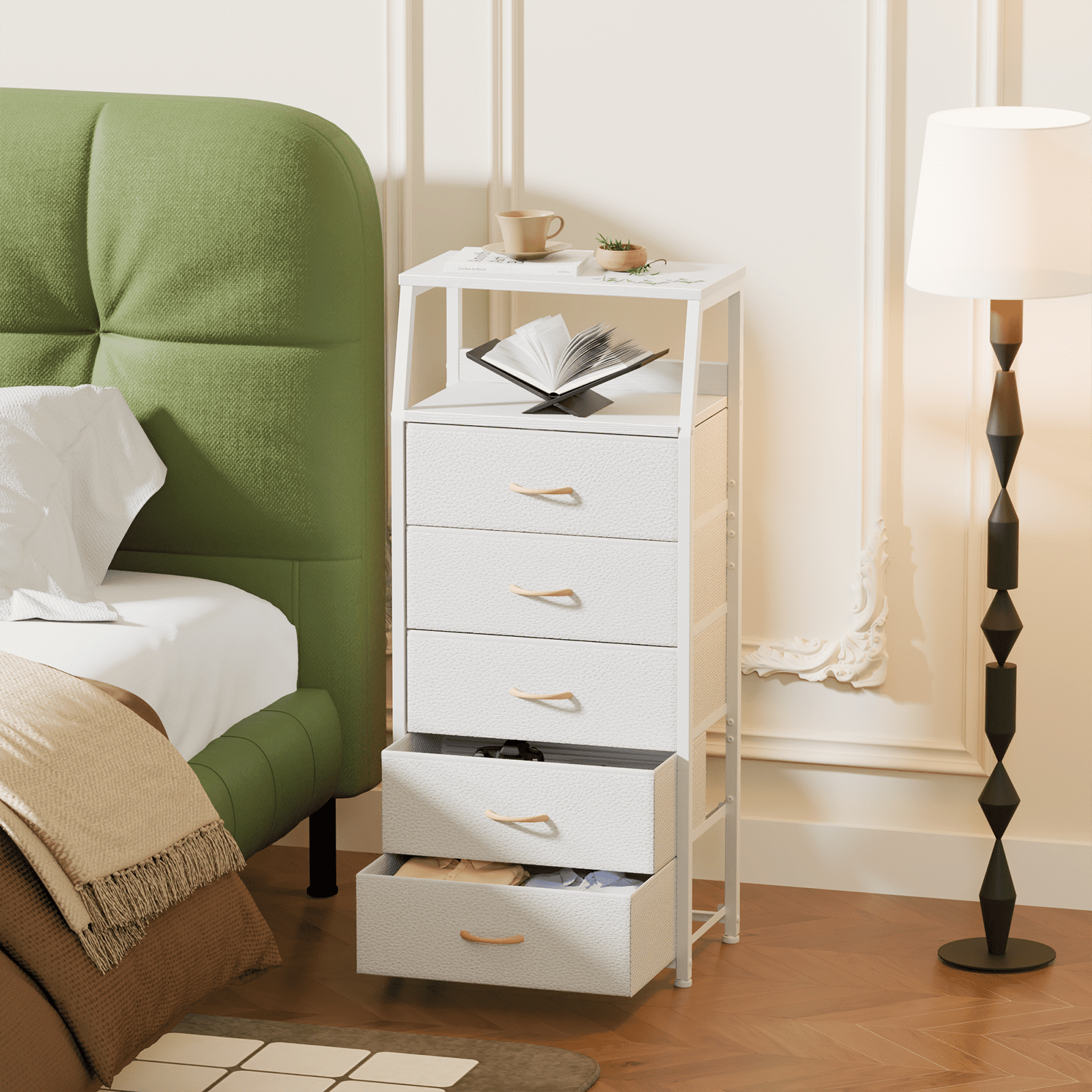 Satifur 5-Drawer Nightstand,Tall Fabric Dresser Storage End Table,for All Age,Metal Frame,White