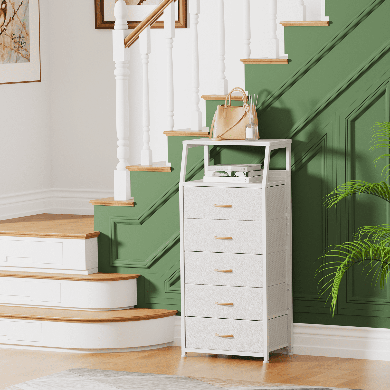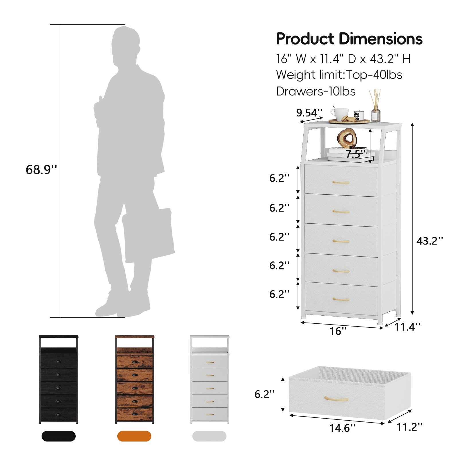 Keep your bedroom essentials within arm's reach with the Satifur Vertical Dresser wth Drawers.This Nightstand is made from strong steel and fabric drawers.Thanks to the 5 spacious drawers and wooden top,this end table can help you to keep your table lamps, remote, books and other stuffs organized. The simple and stylish design with a nice white finish fits any room.Add the Satifur dressers to cart and make your bedroom awesome! Specification:Color: WhiteMaterial: MDF+Fabric+MetalFrame Material: MetalProduct Dimensions: 11.4"D x 16"W x 43.2"HAge Group: All agePackage include: Wooden board, Cloth drawer, Screws, Manual Satifur 5-Drawer Nightstand,Tall Fabric Dresser Storage End Table,White: