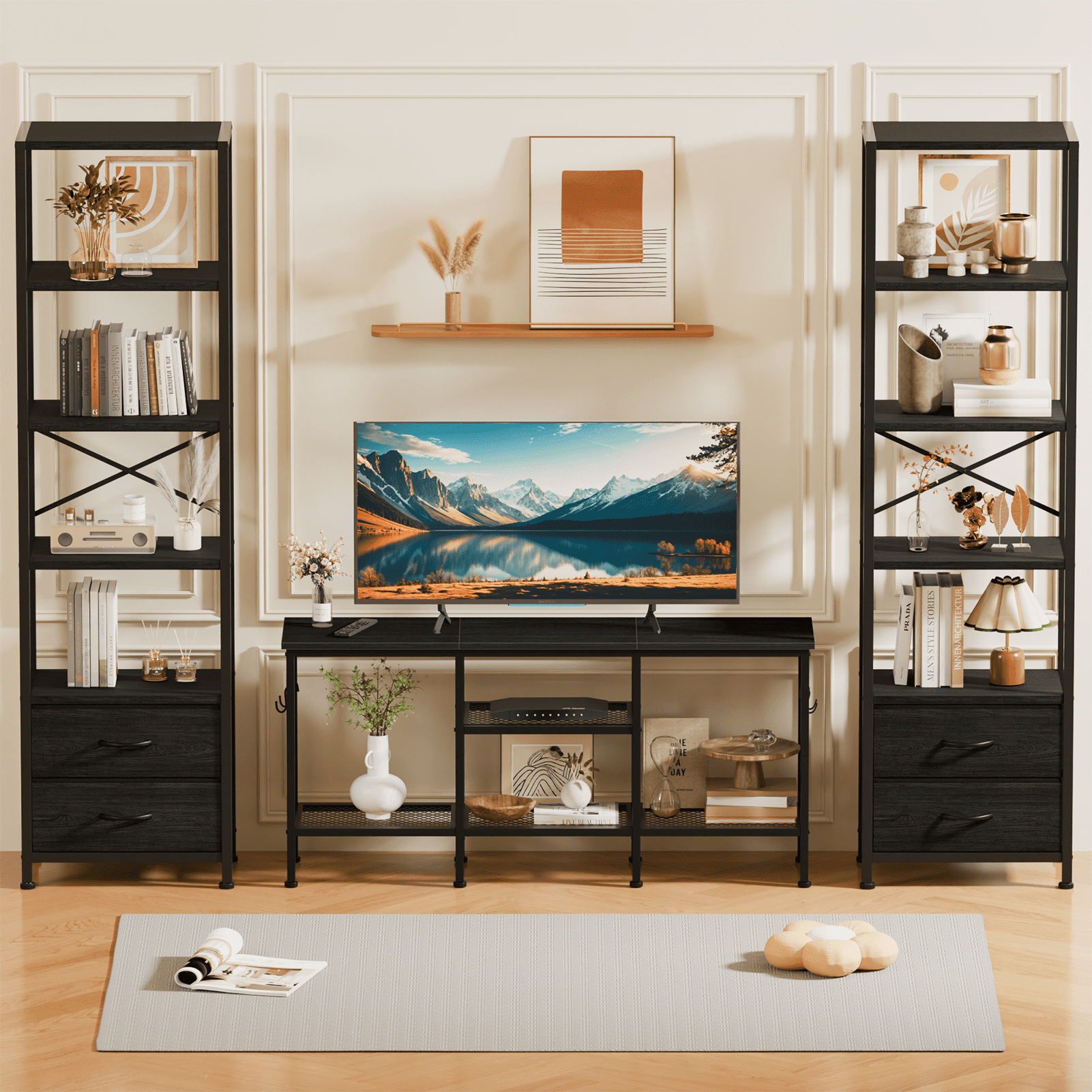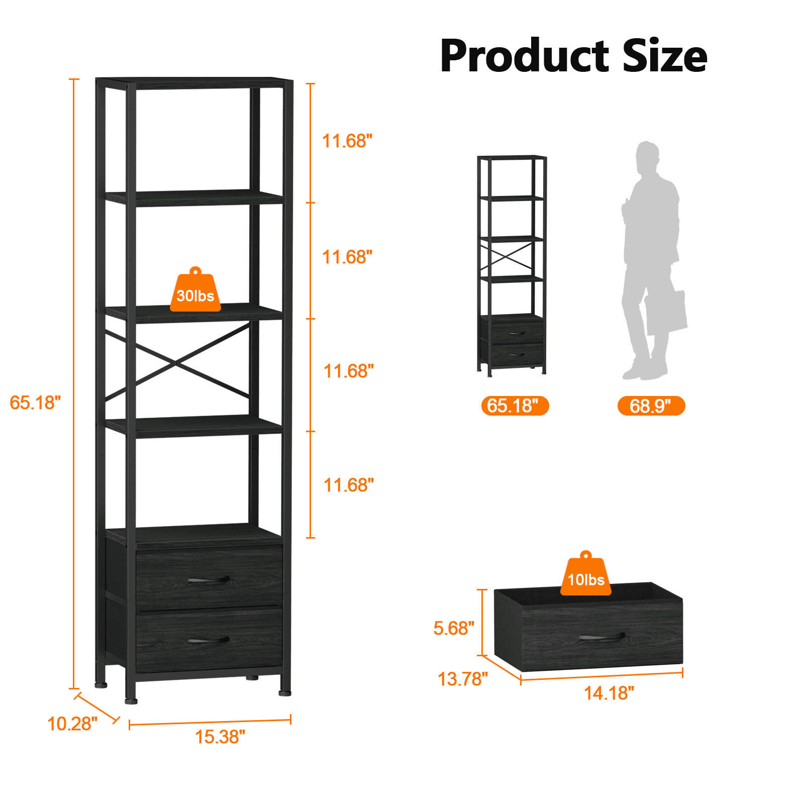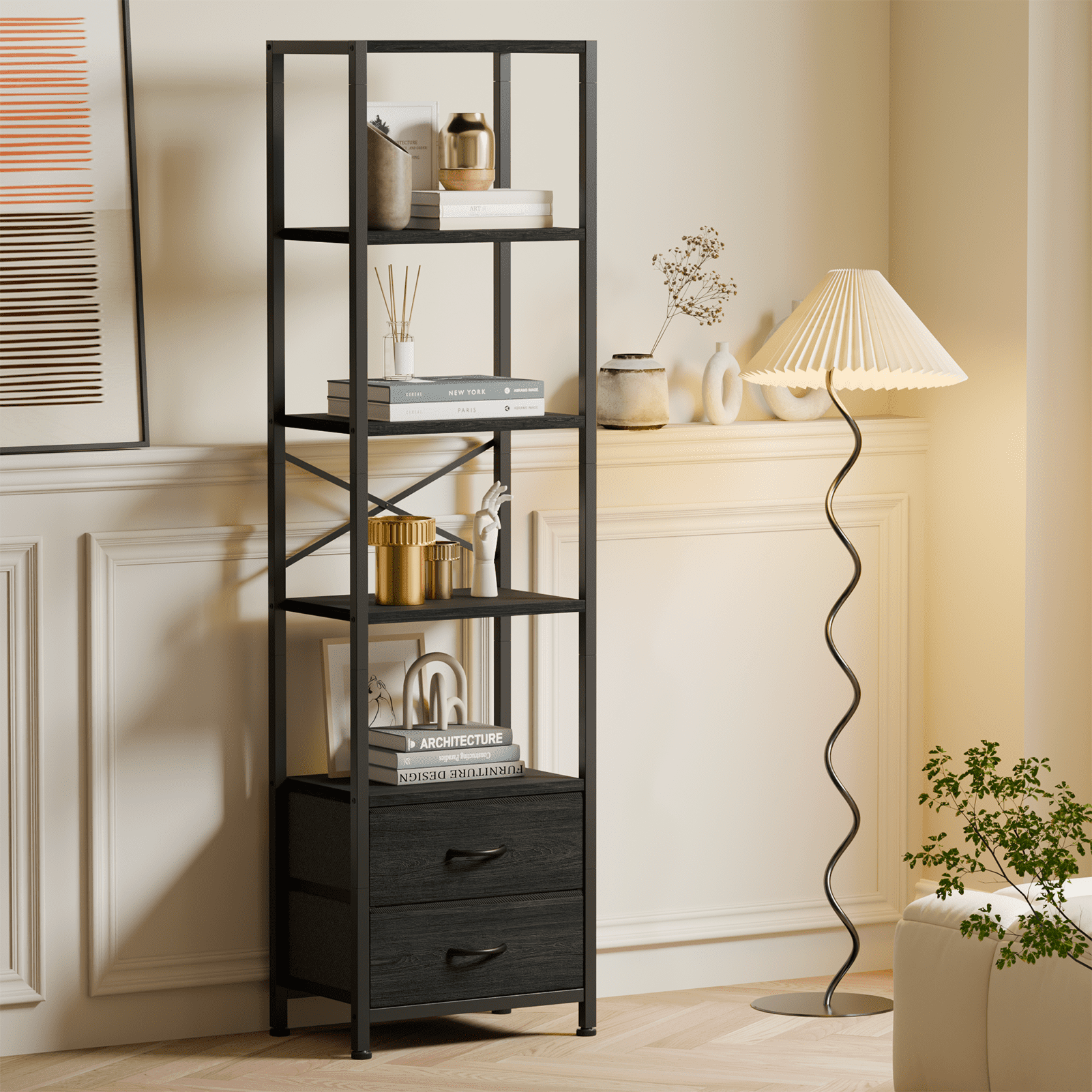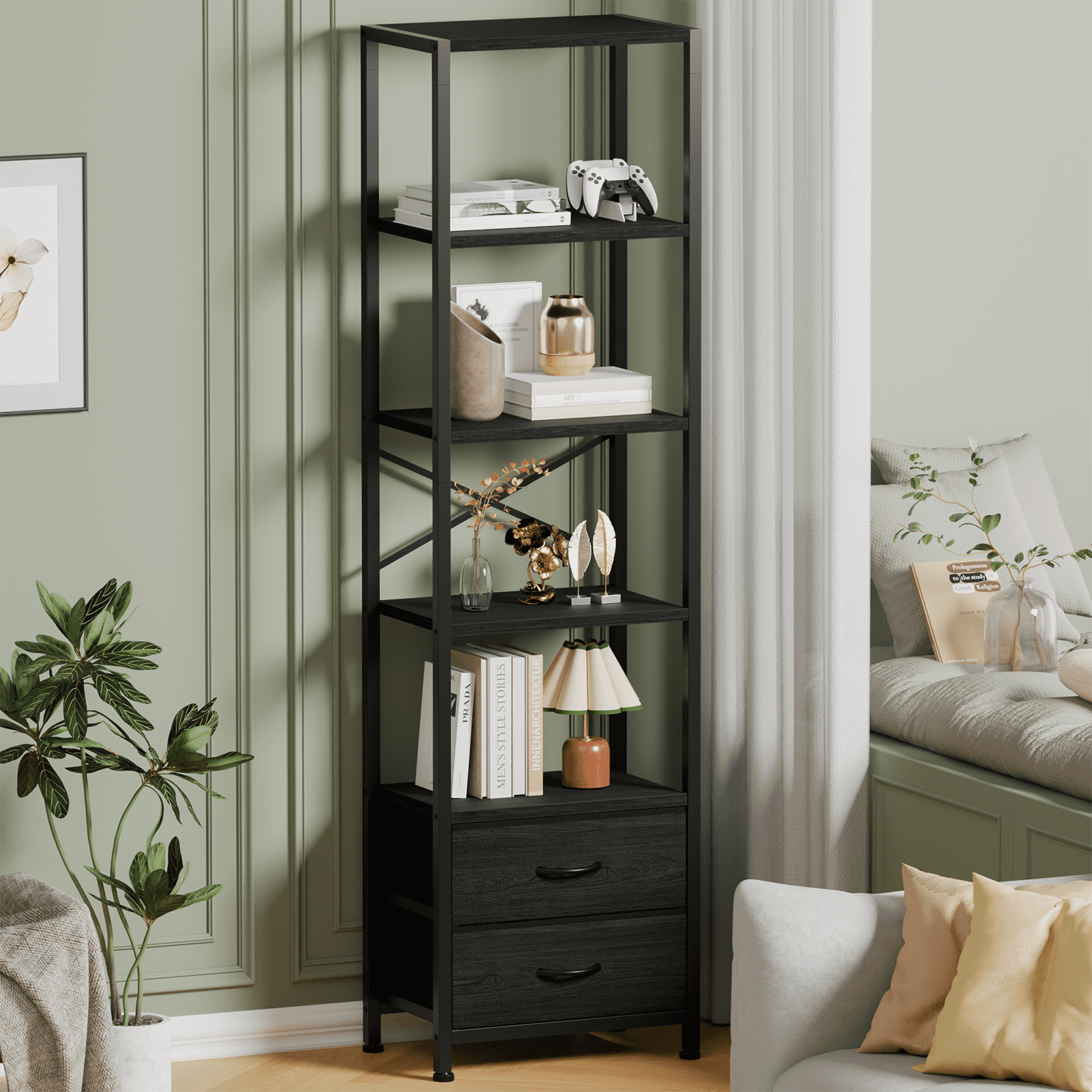 Satifur 5-Tier Bookshelf and Bookcase with 2 Removable Drawers, Narrow Display Shelf for Living Room, Black Oak