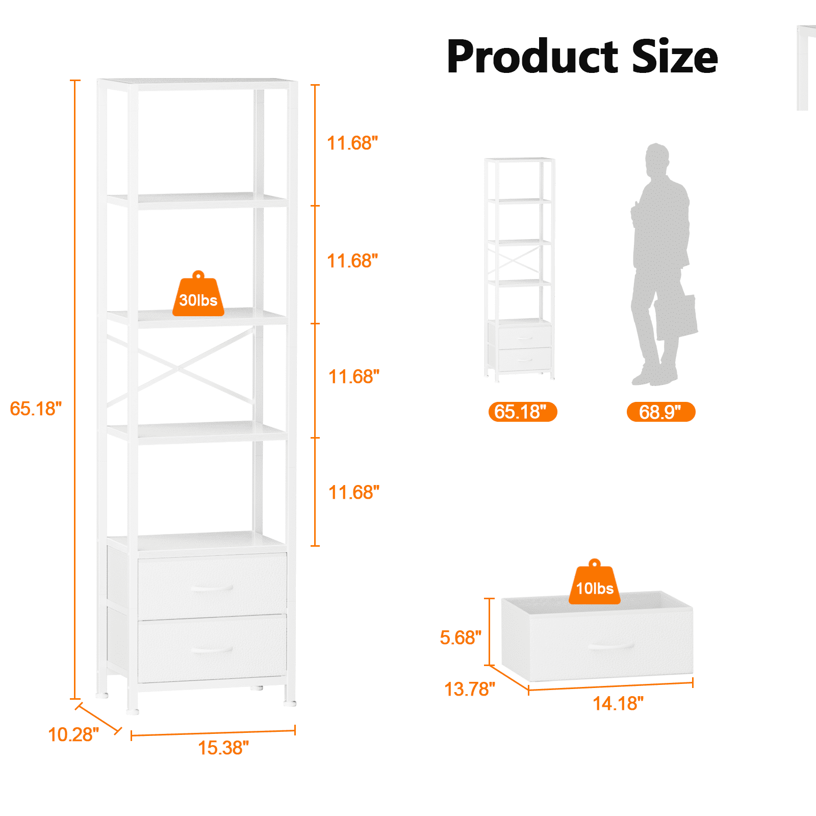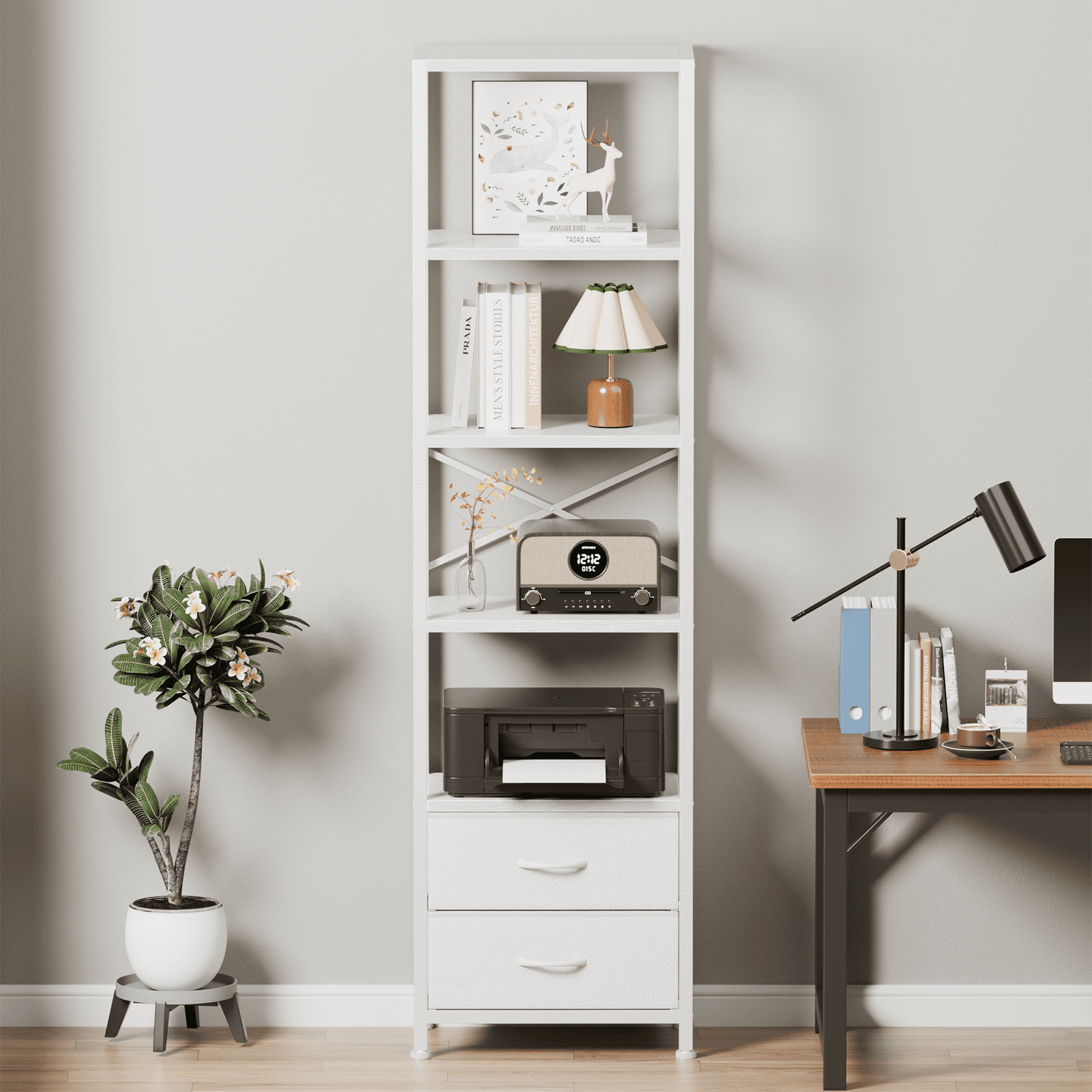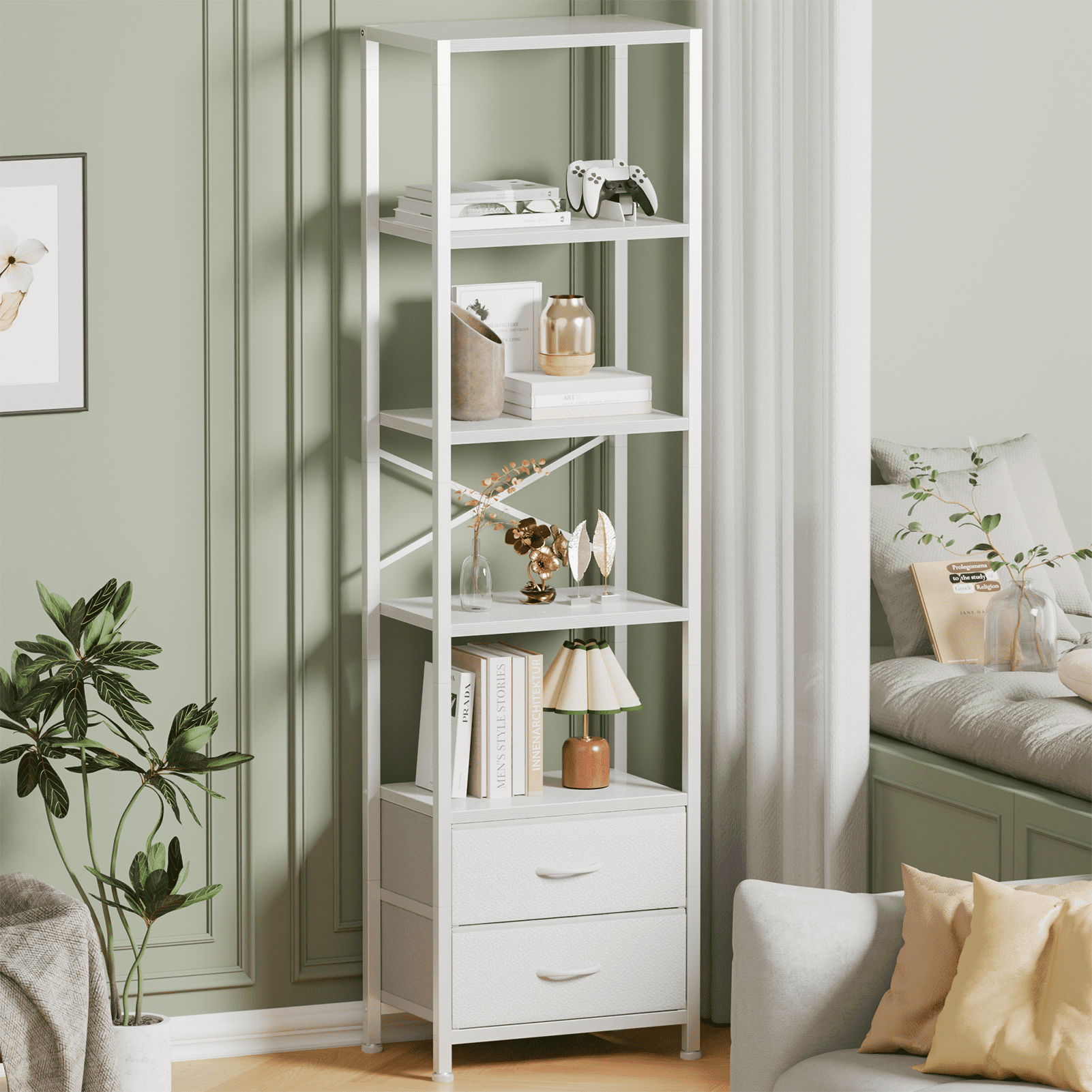 Satifur 5-Tier Bookshelf and Bookcase with 2 Removable Drawers, Narrow Display Shelf for Living Room, White