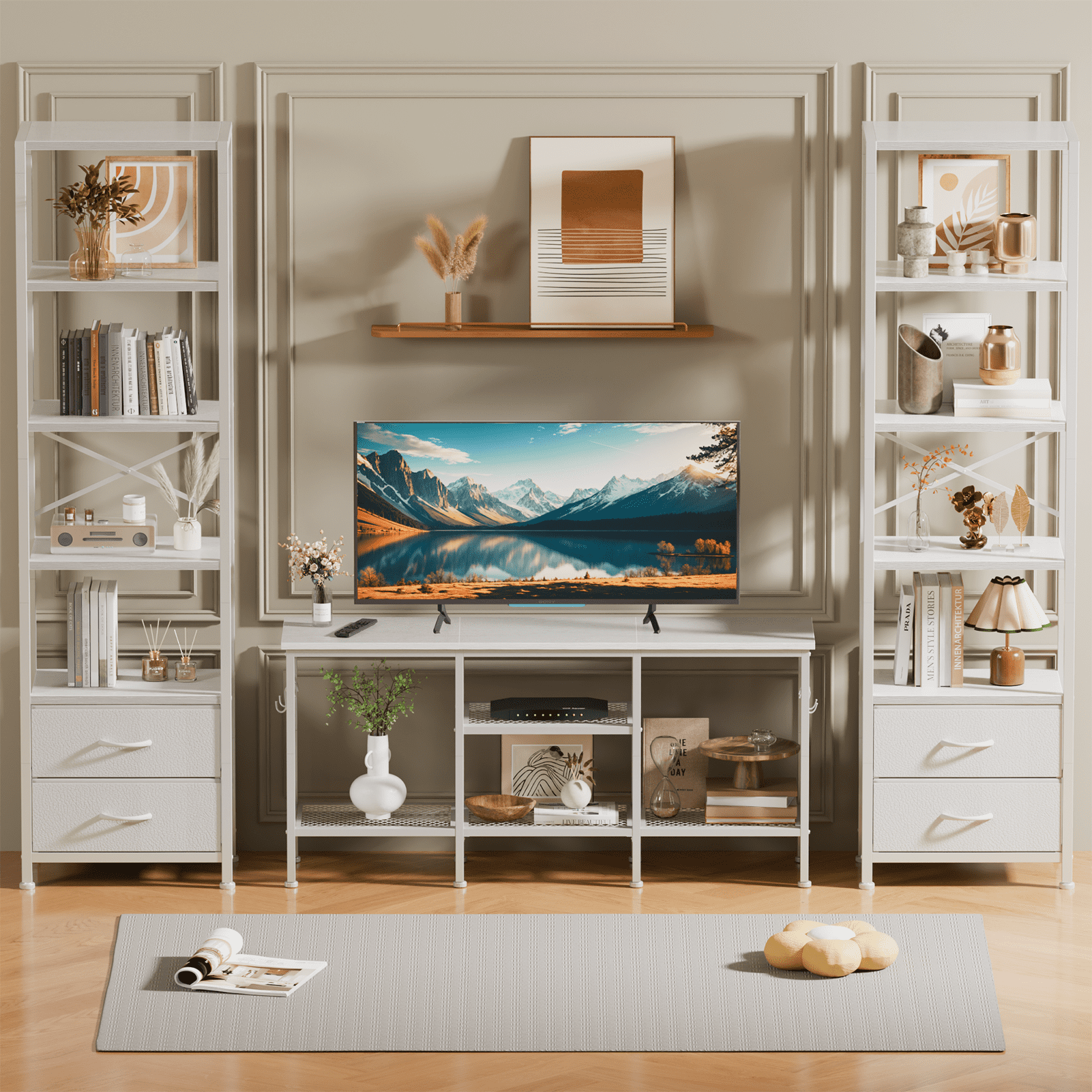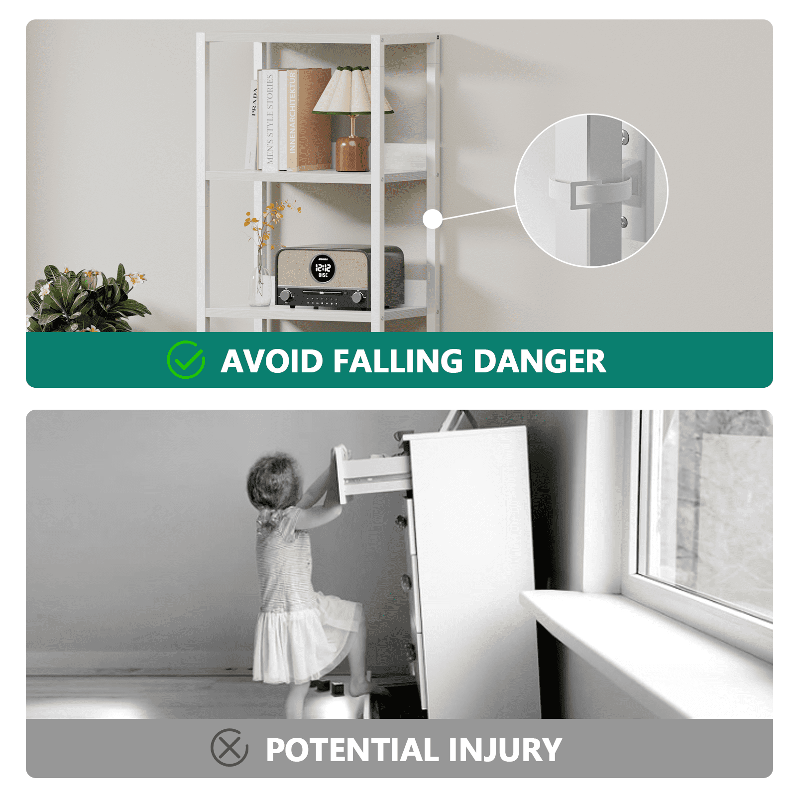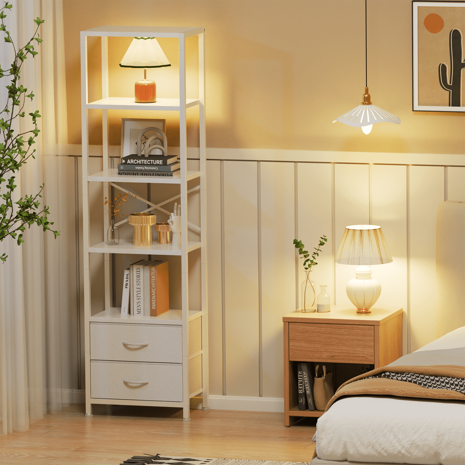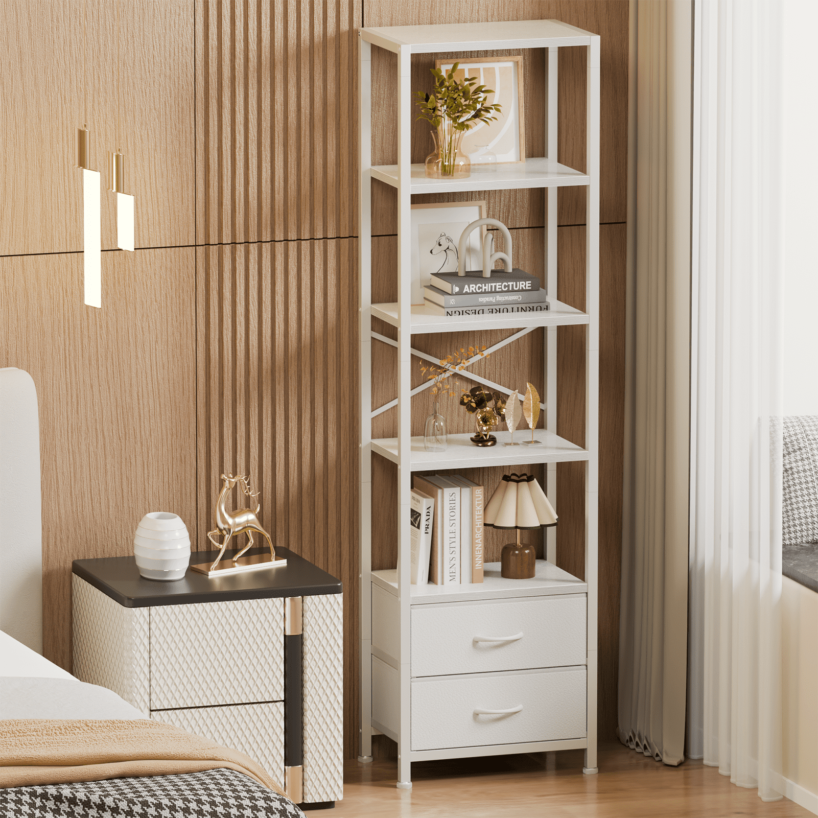 Satifur 5-Tier Bookshelf and Bookcase with 2 Removable Drawers, Narrow Display Shelf for Living Room, White