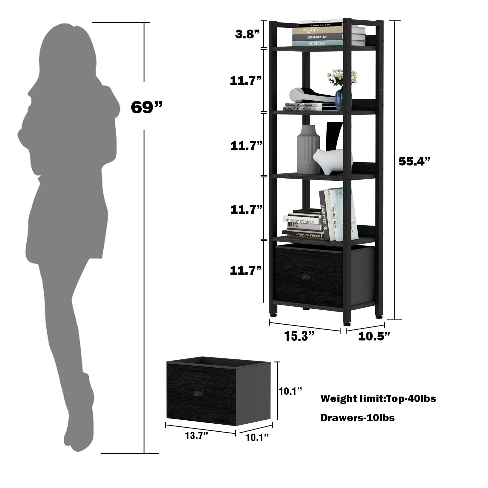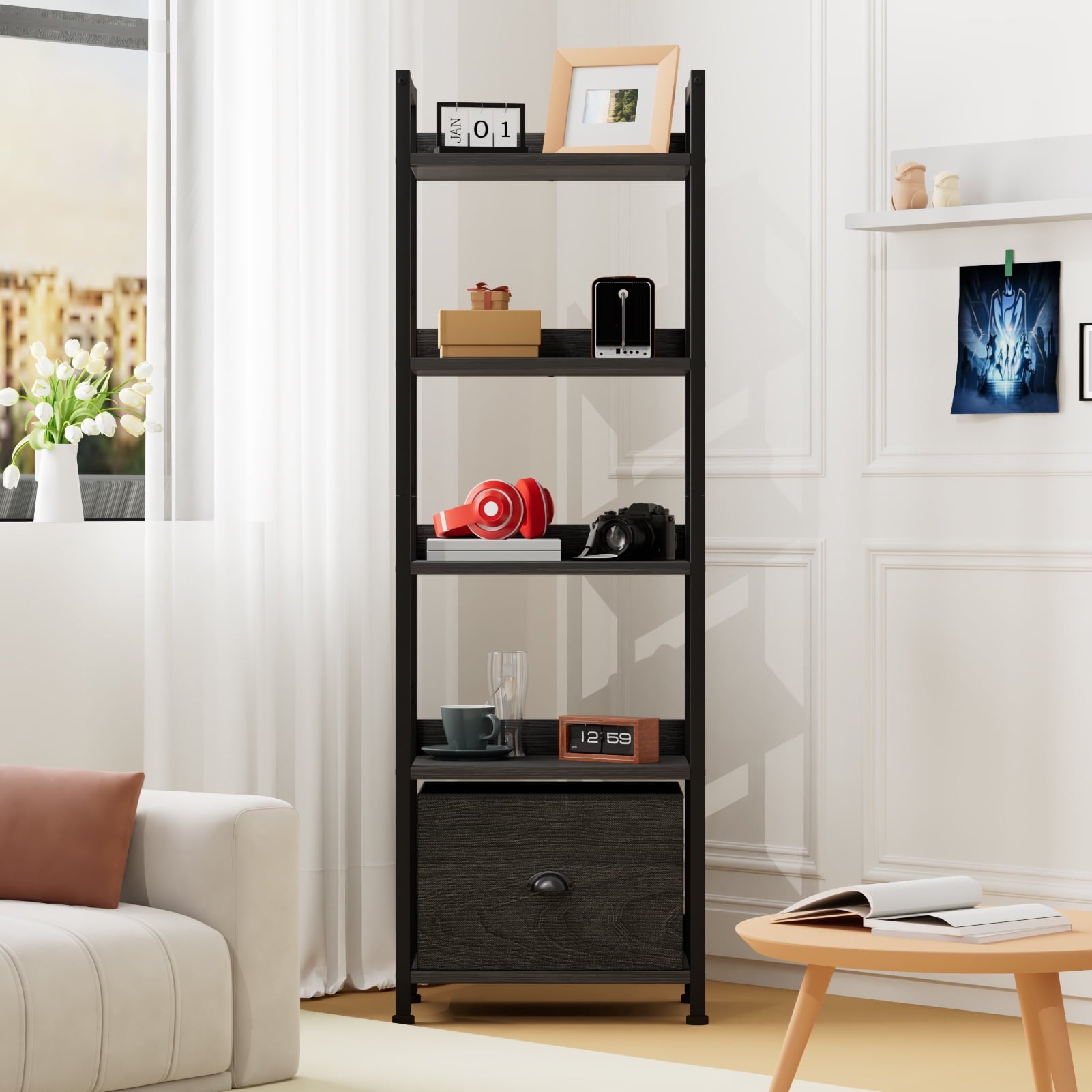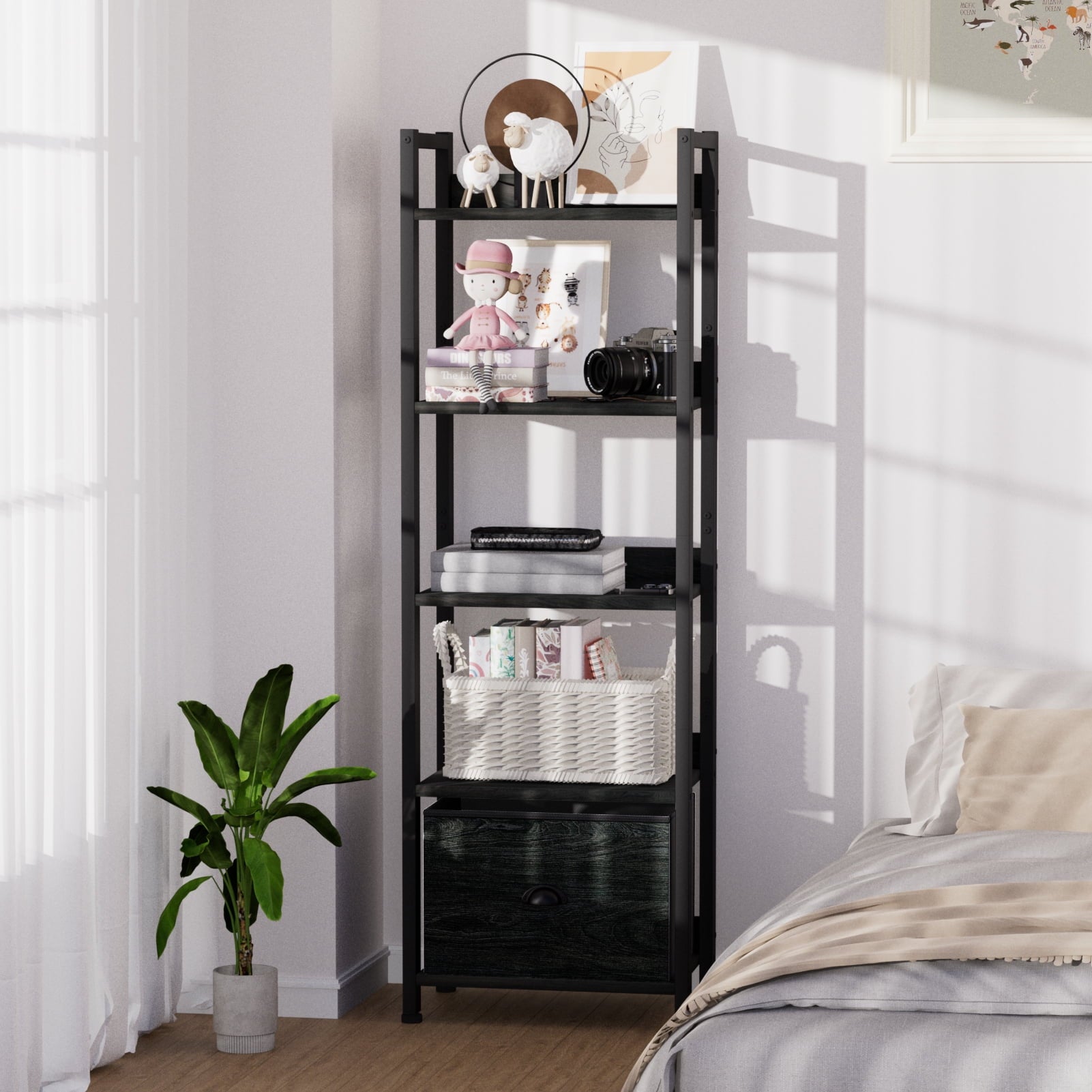 Satifur 5 Tier Ladder Bookcase with Removable Drawer Tall Standing Bookshelf,Black Oak