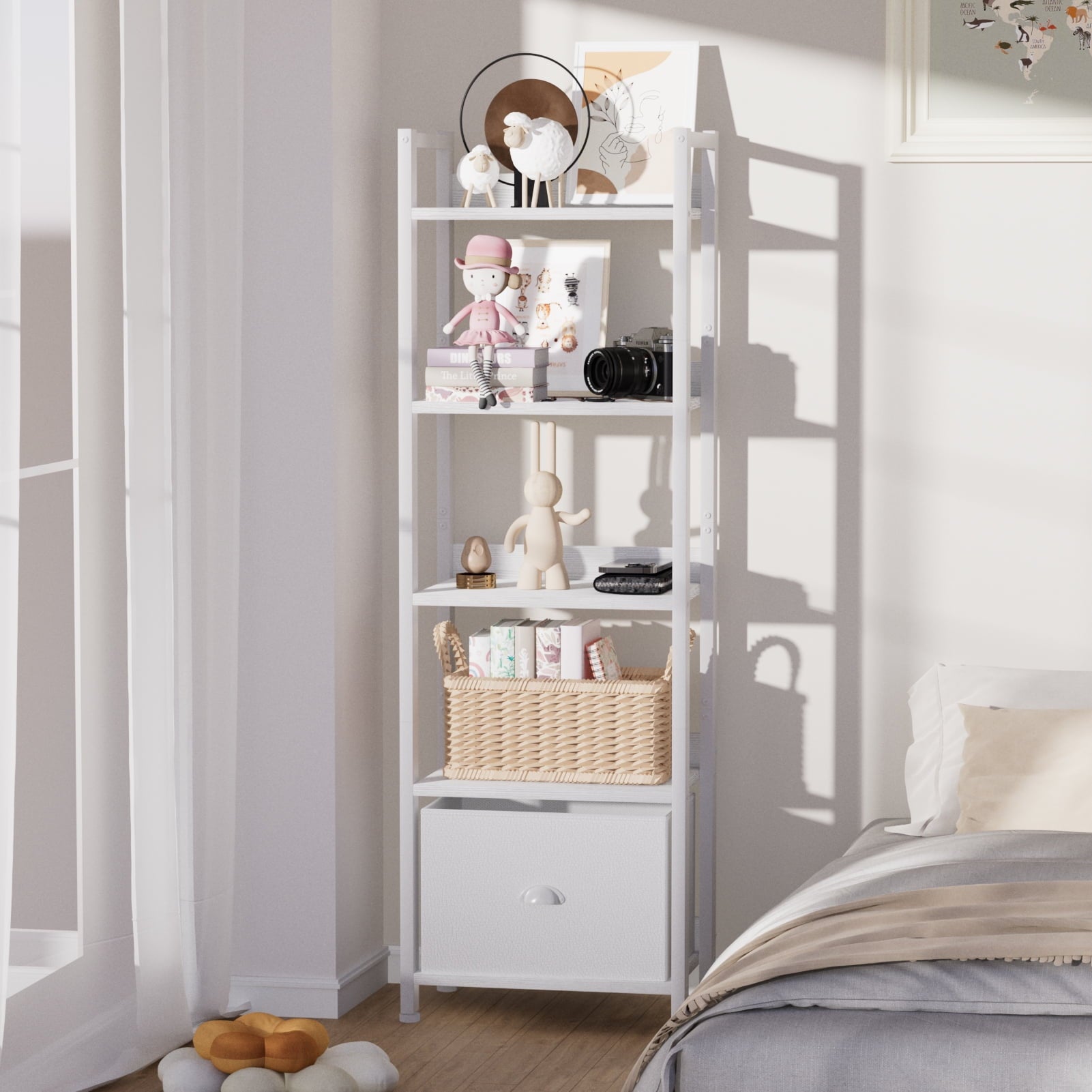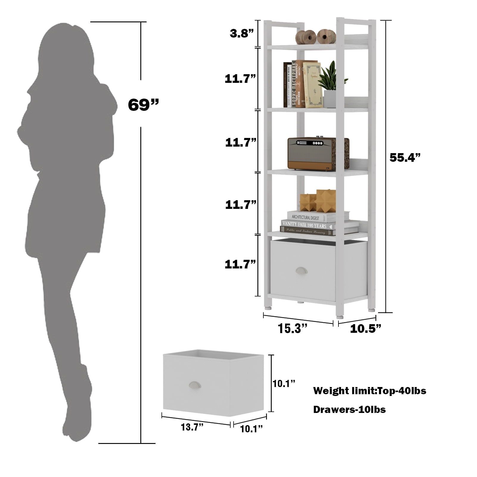 5 tier Height adjustable shelf and a removable fabric drawer