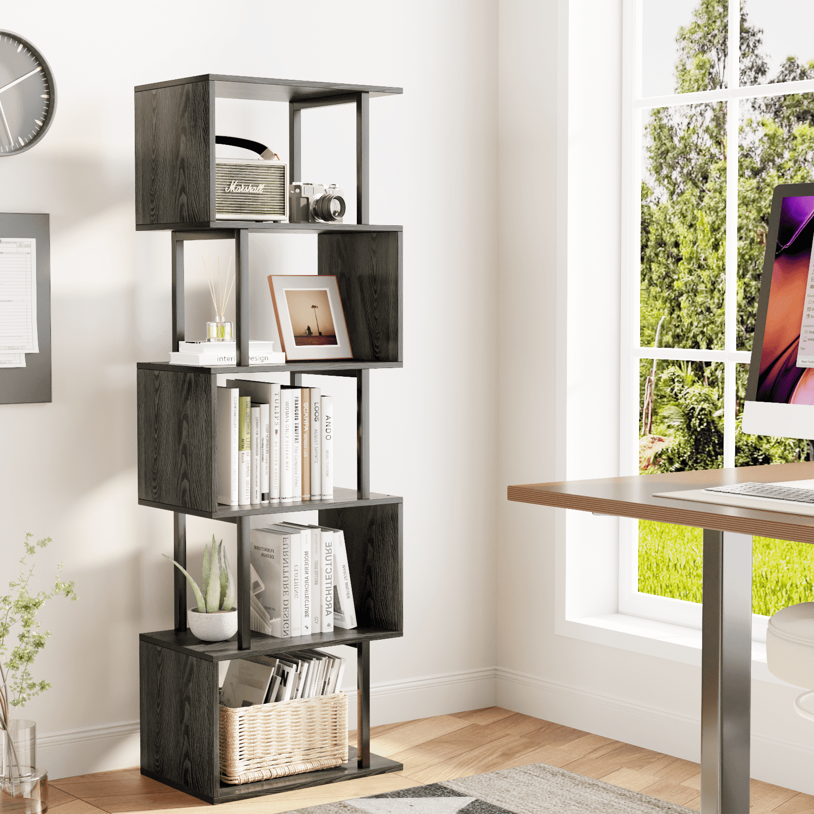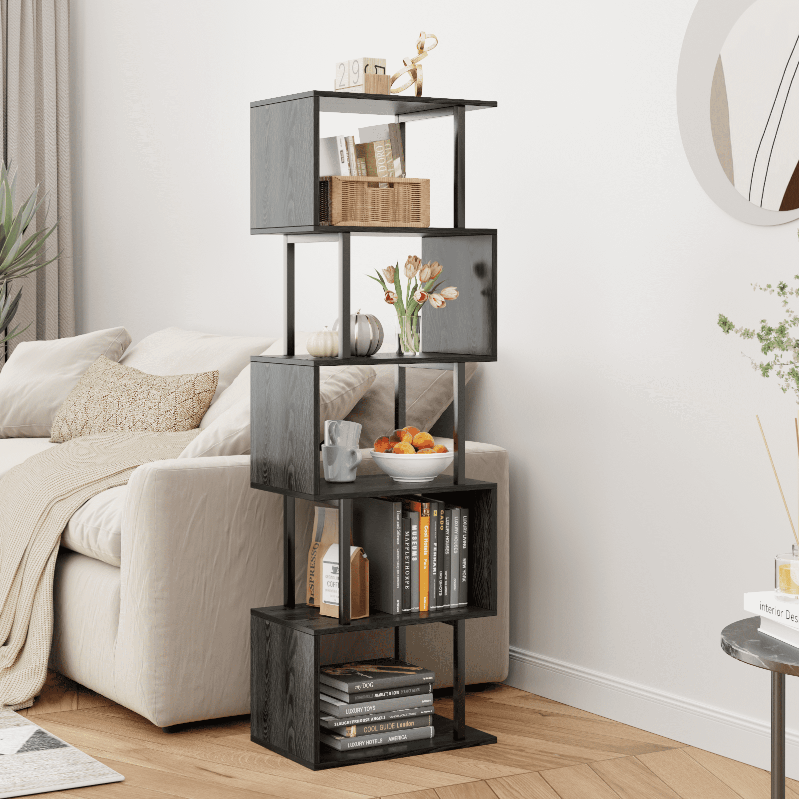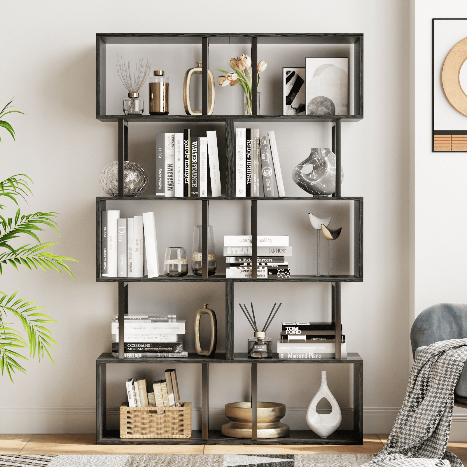 Discover the perfect blend of functionality and modern aesthetics with our unique geometric bookshelf. The S-shaped design not only makes this bookcase a work of art but also provides ample storage space to satisfy various daily storage needs. Elevate your living space with this tall black shelf that seamlessly organizes books, collectibles, plants, albums, and more in a neat and orderly manner.