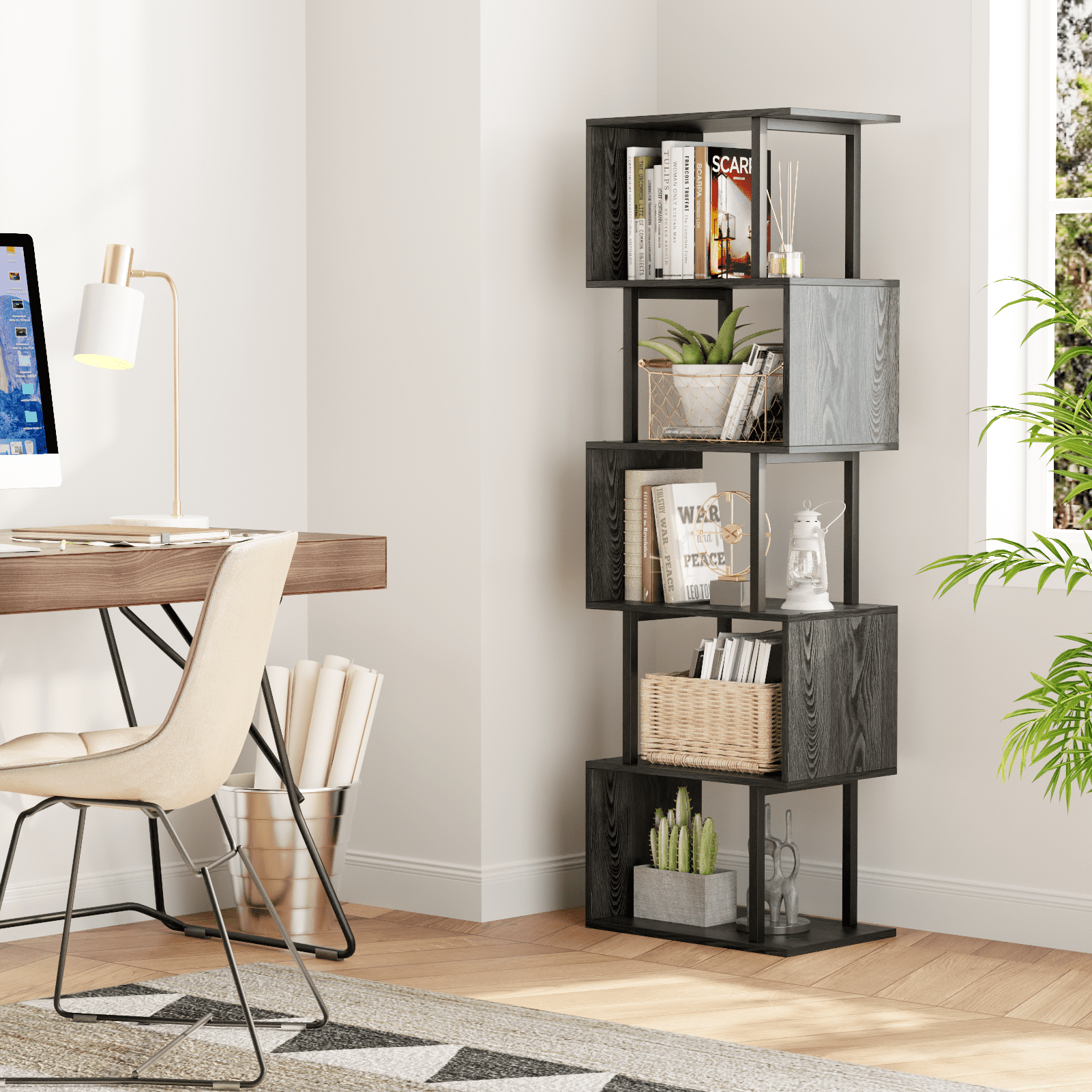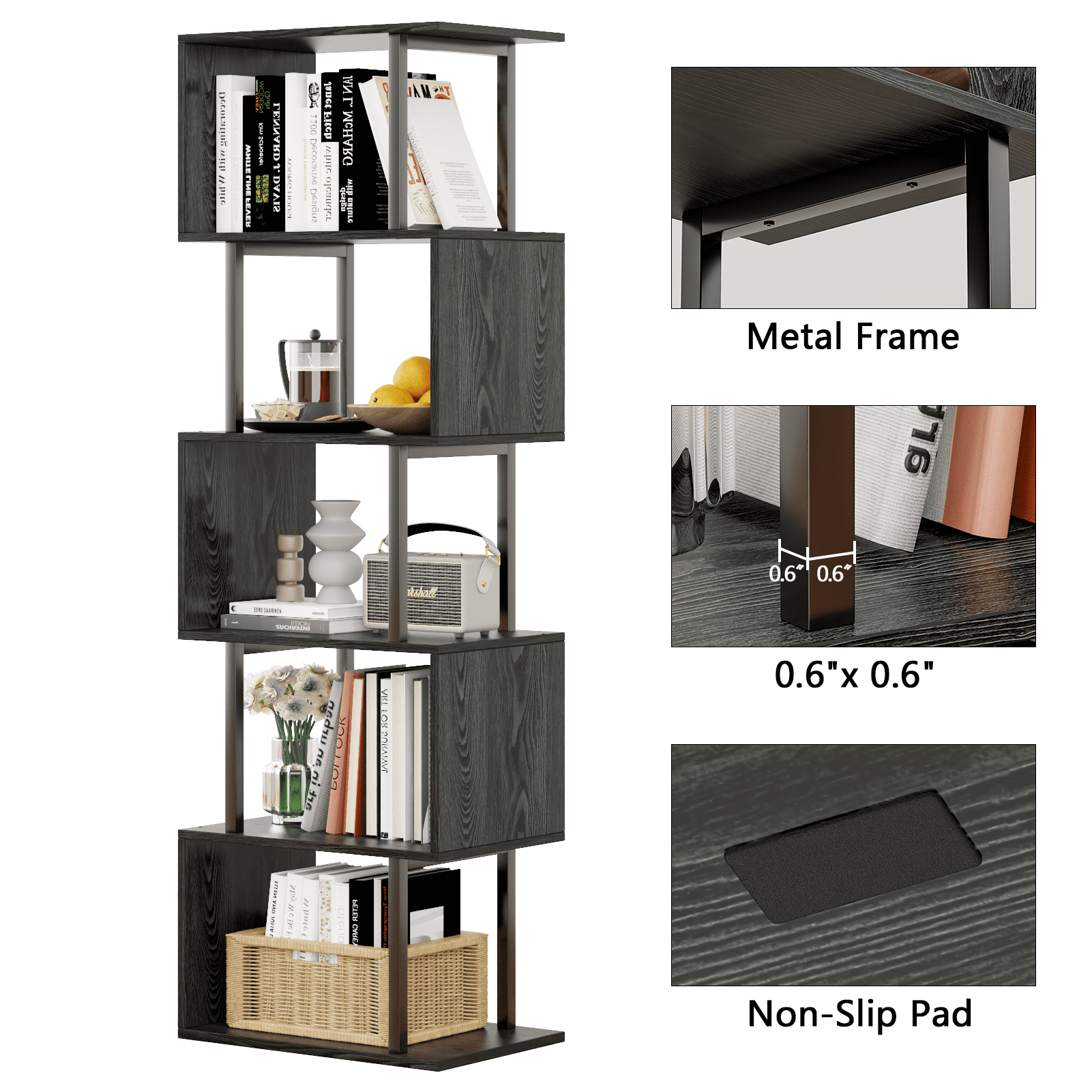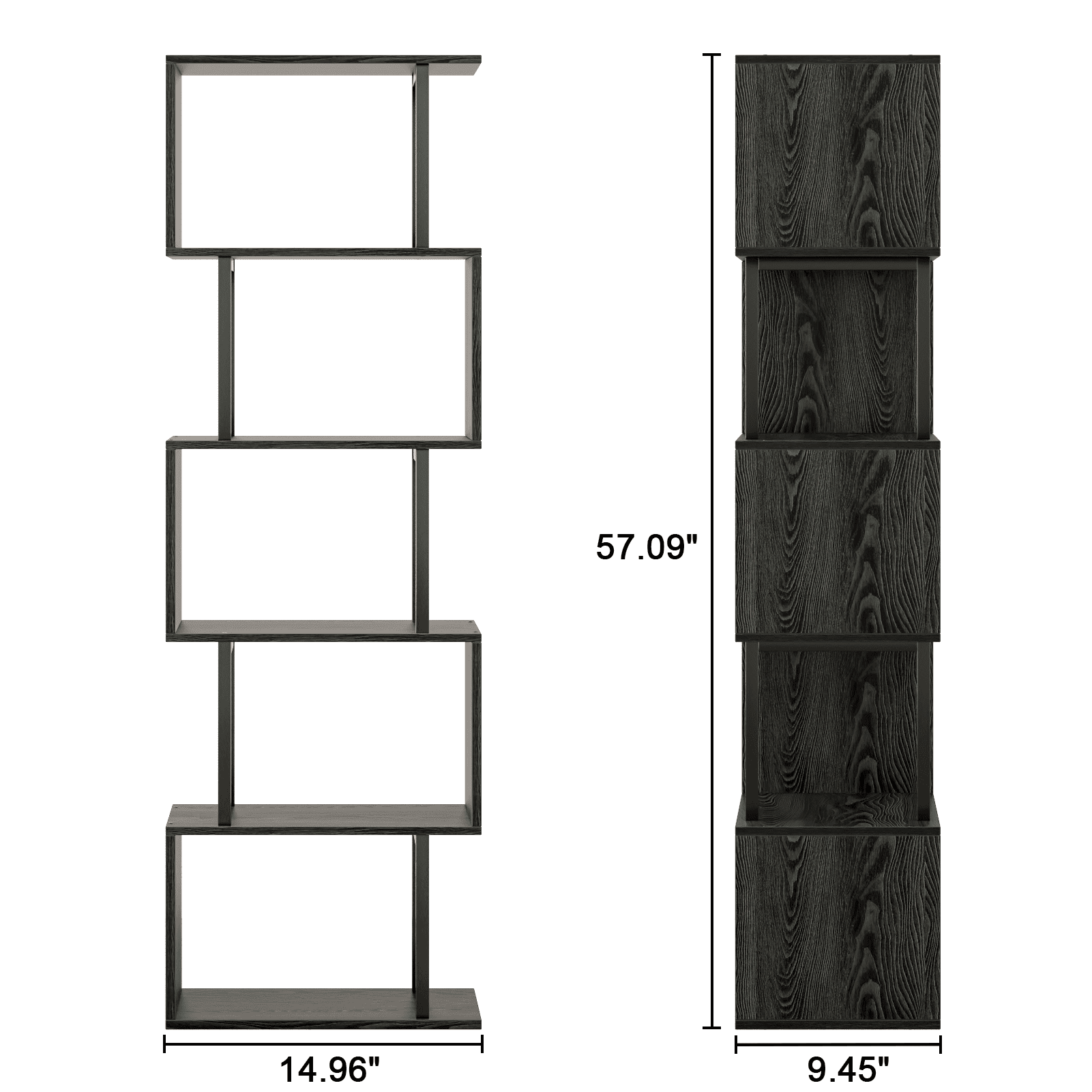 Satifur 5-Tier S-Shaped Geometric Bookcase, Industrial Freestanding Storage Shelving Unit,Black