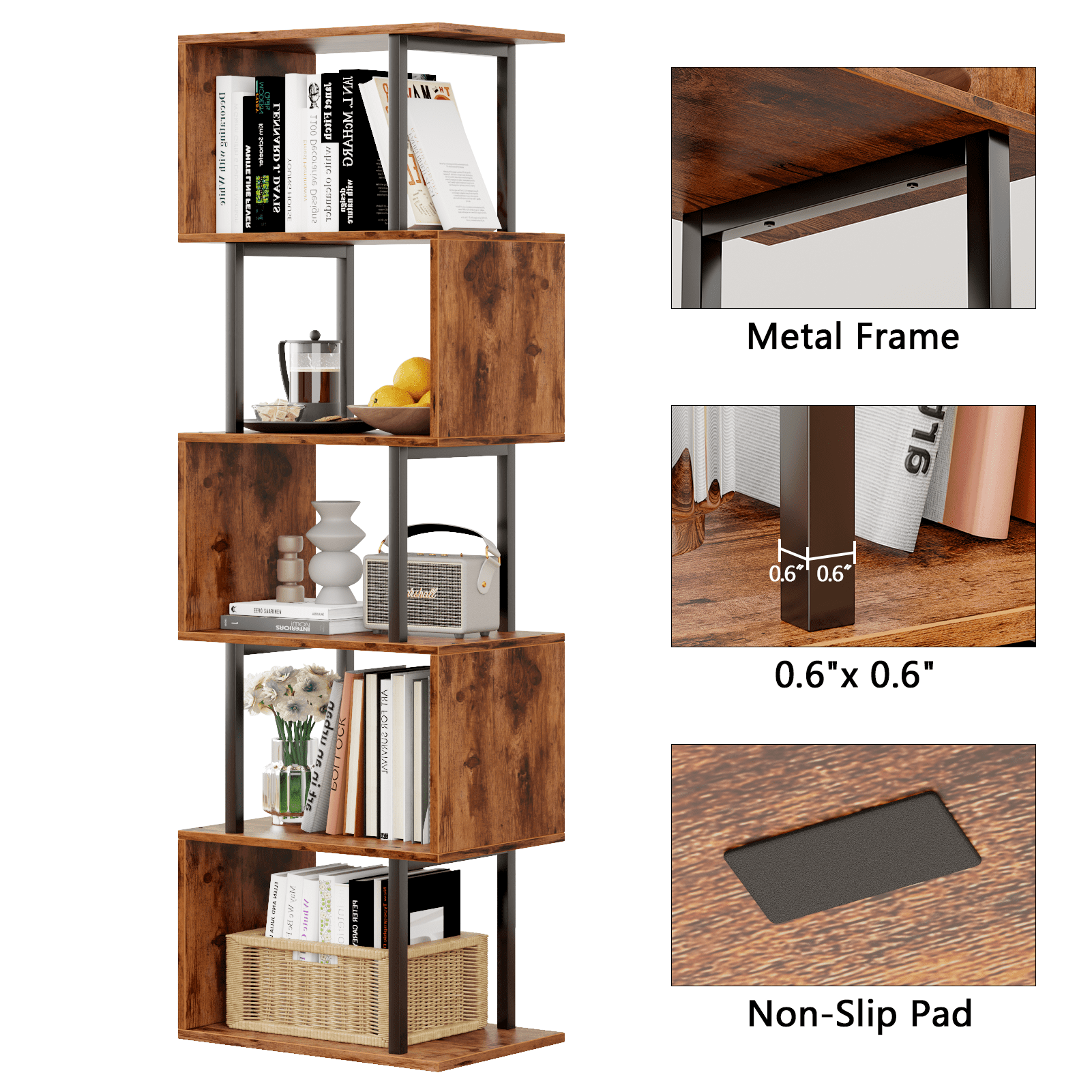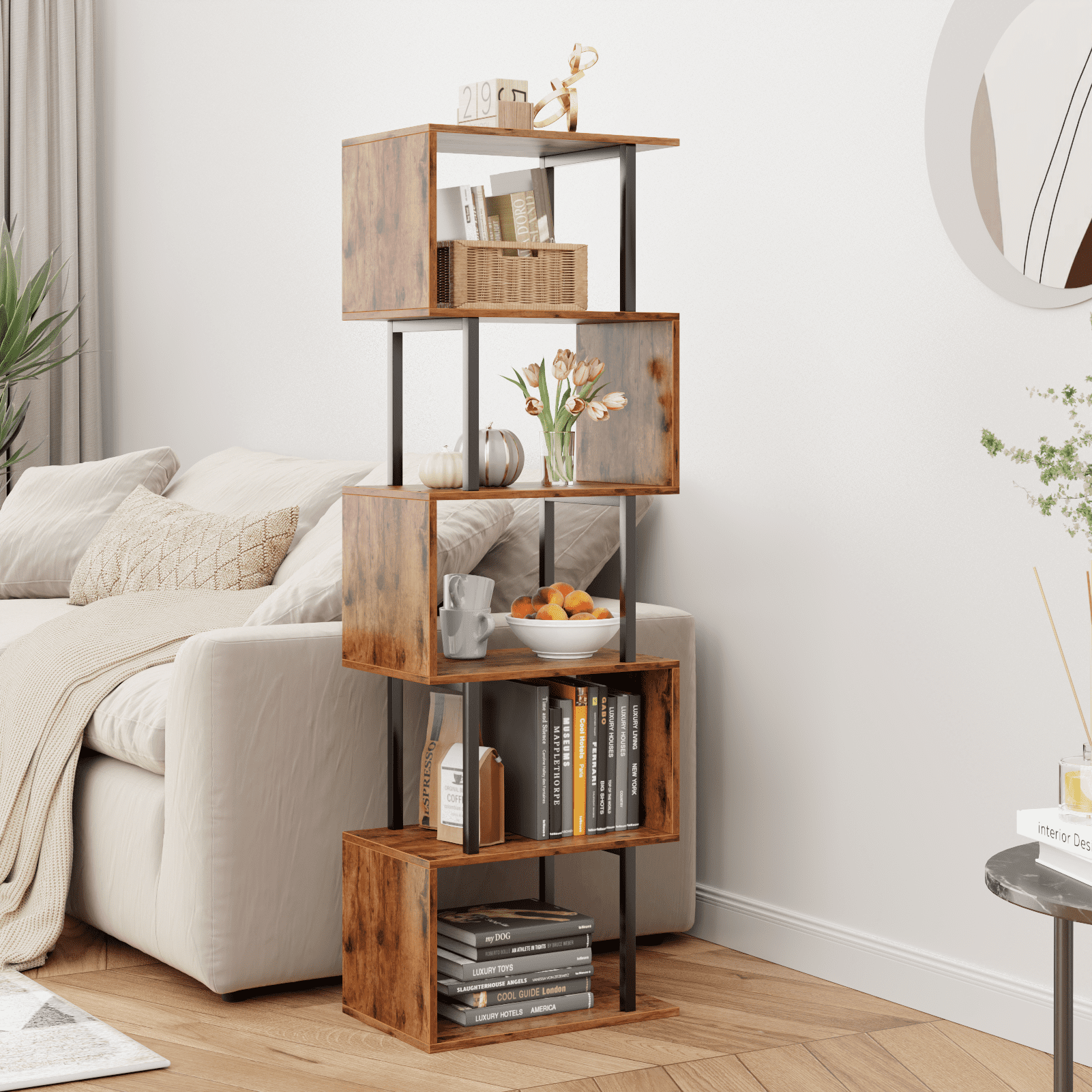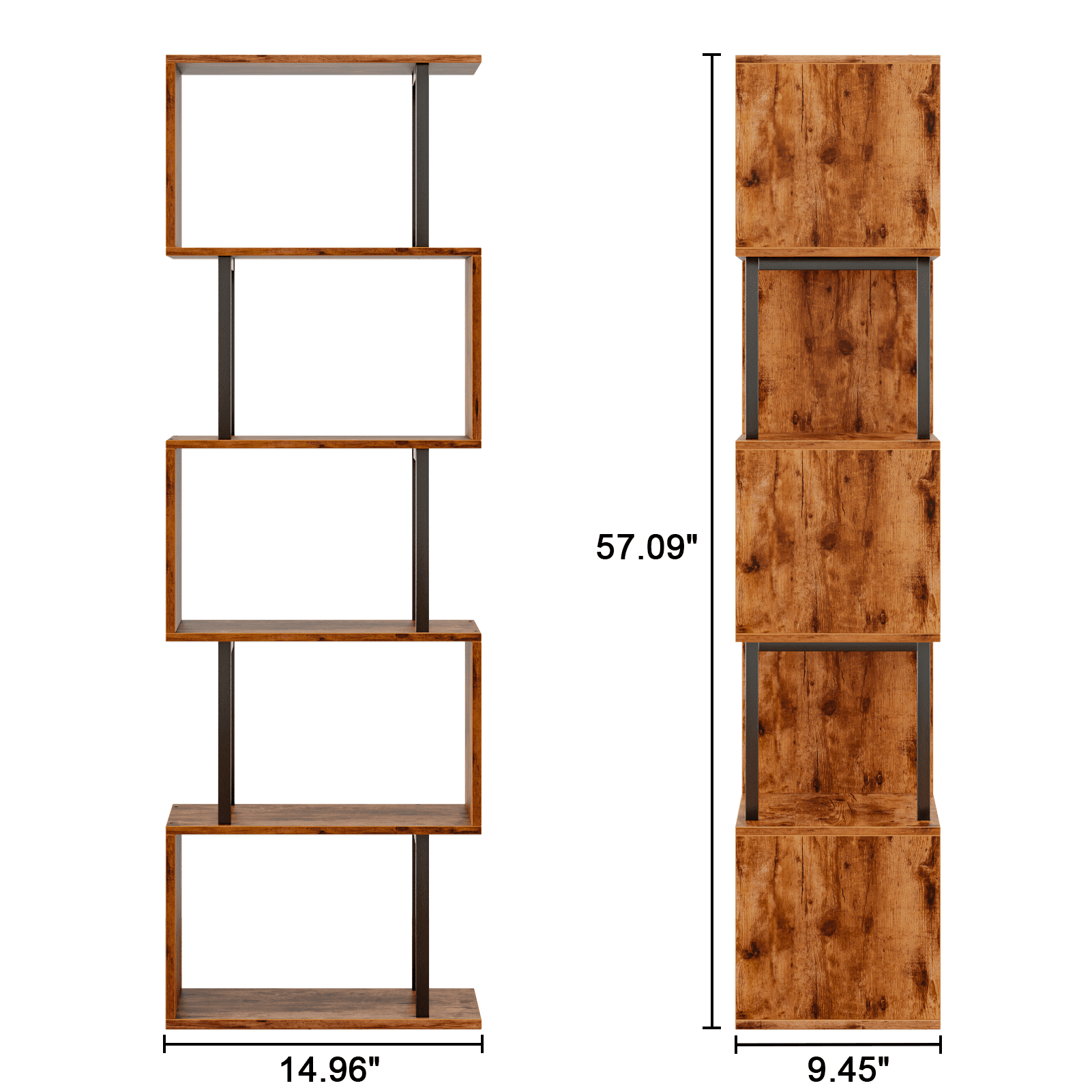Satifur 5-Tier S-Shaped Geometric Bookcase, Industrial Freestanding Storage Shelving Unit,Rustic Brown