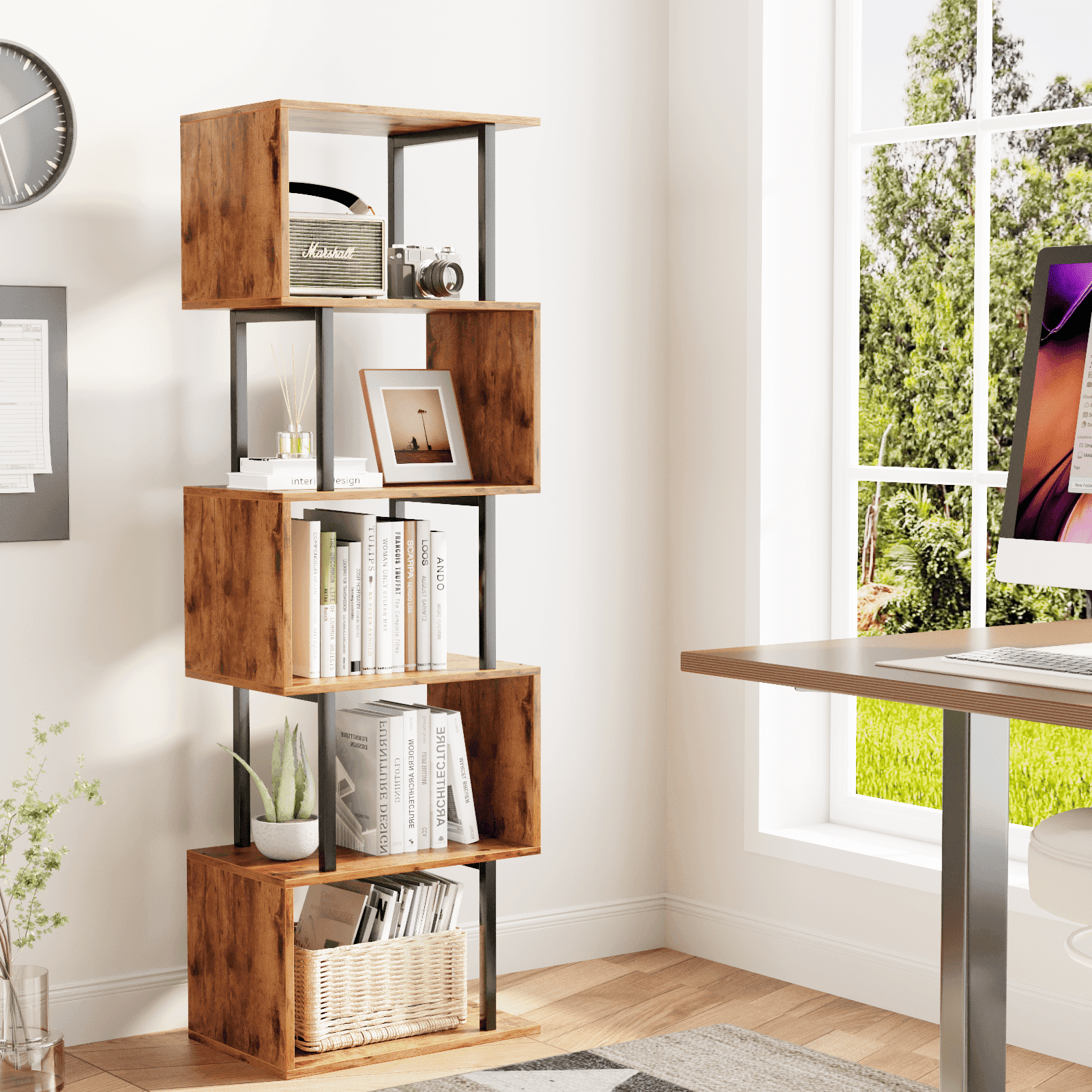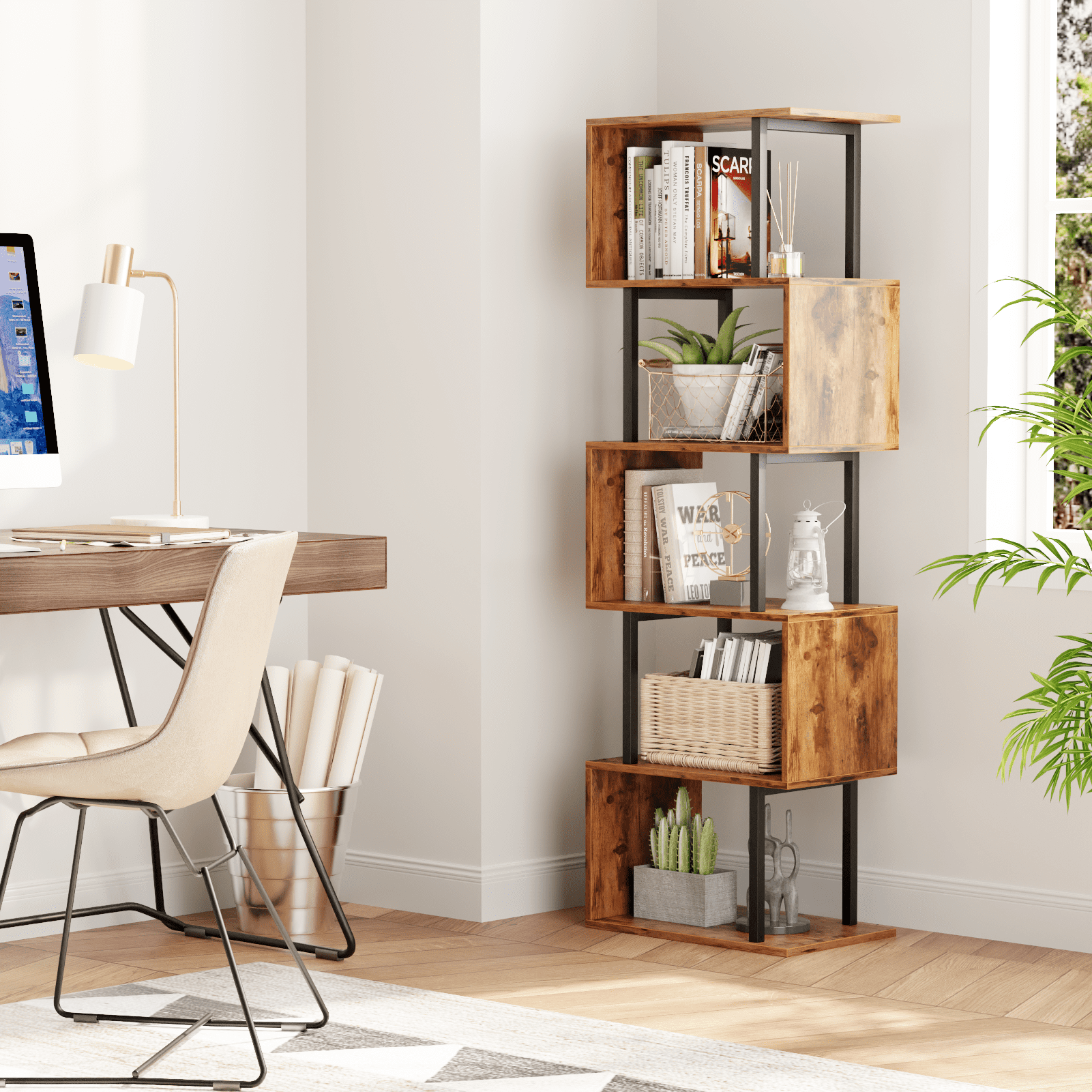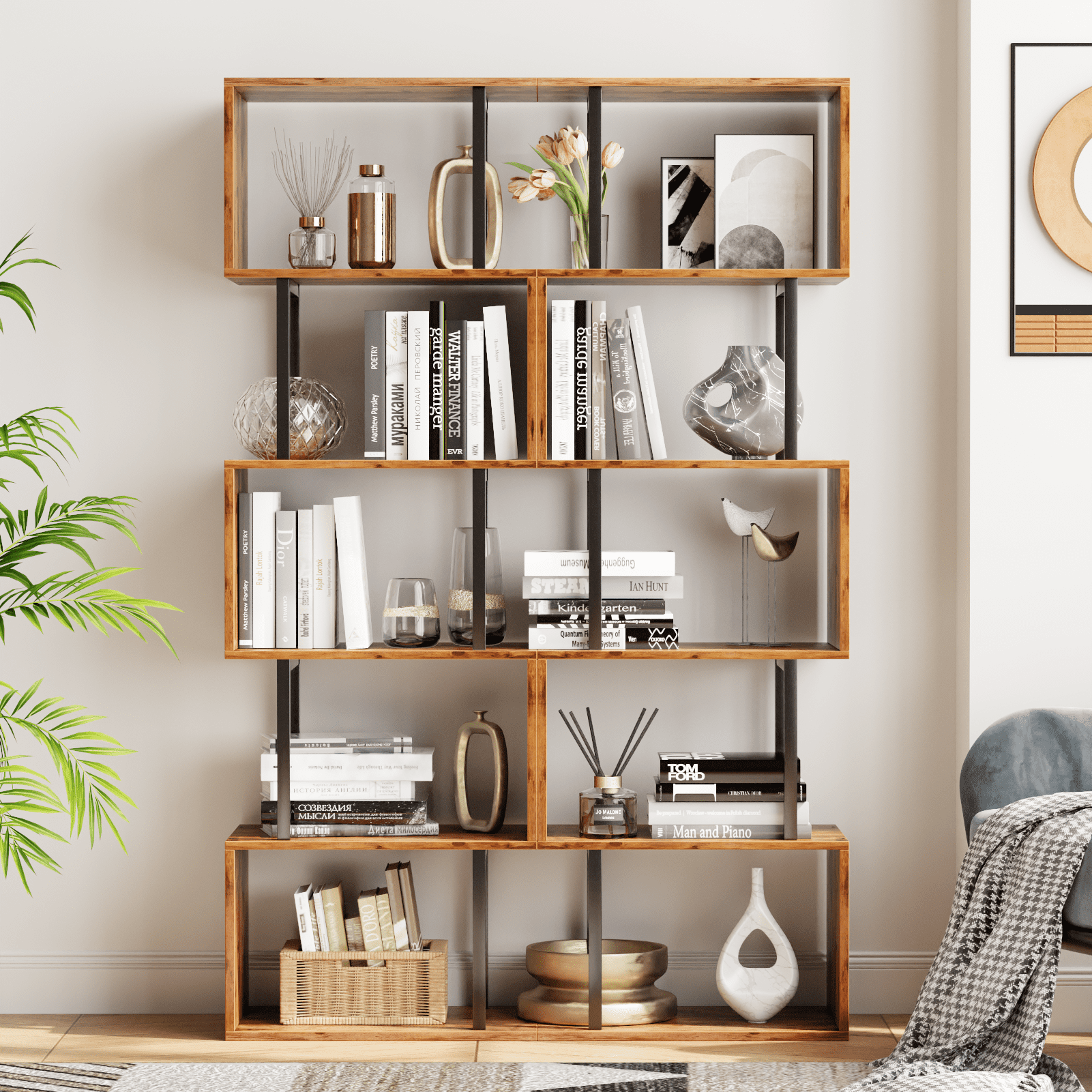 Satifur 5-Tier S-Shaped Geometric Bookcase, Industrial Freestanding Storage Shelving Unit,Rustic Brown