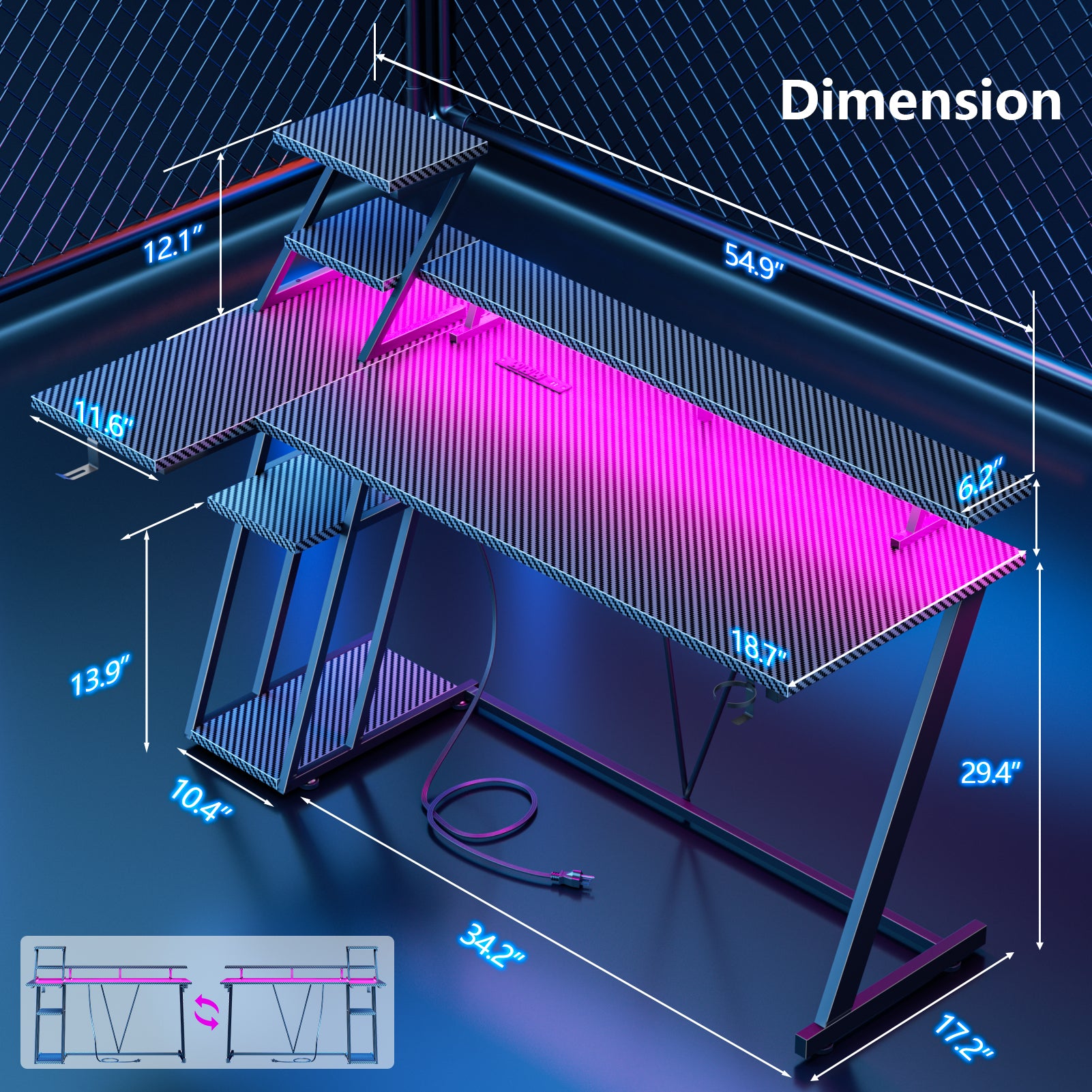 Satifur 55" Carbon Fiber Gaming Desk L-Shaped Computer Desk, RGB Lights & Power Outlets, Black