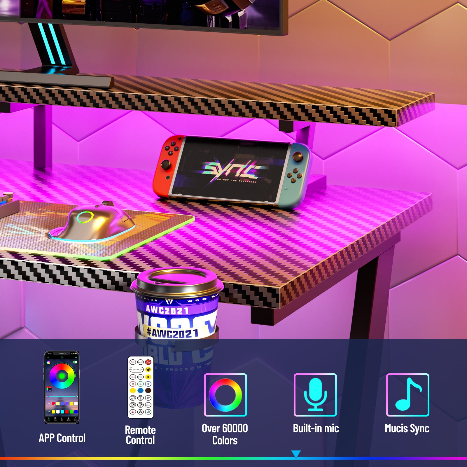 FULLY IMMERSIVE RGB ATMOSPHERE: Command the lighting with remote or APP control. The vibrant RGB LED strips sync with your gameplay, transforming your space into a truly immersive arena that enhances focus and intensity.