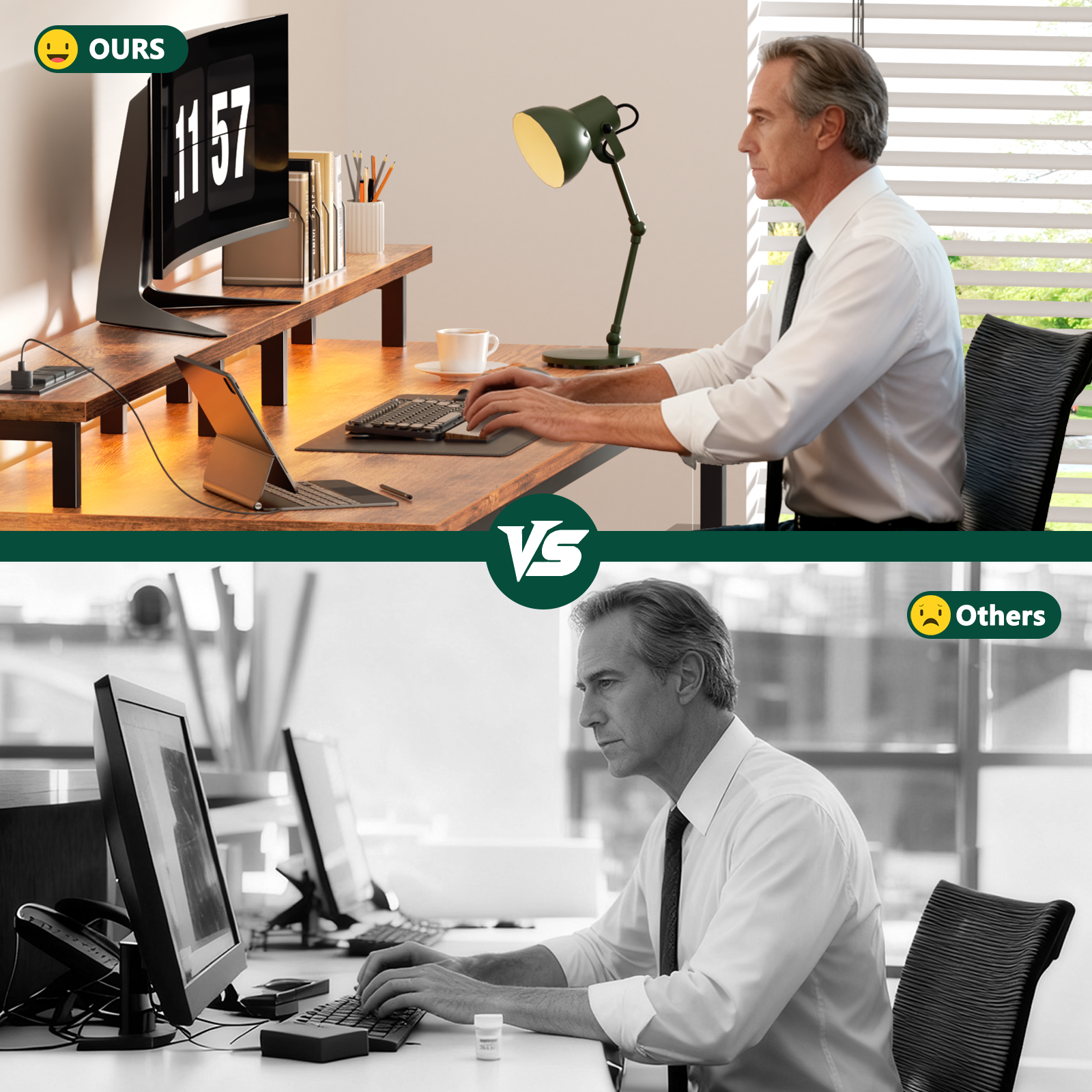 Ergonomic Design: A spacious, raised monitor stand helps reduce neck strain and provides additional desk space.
