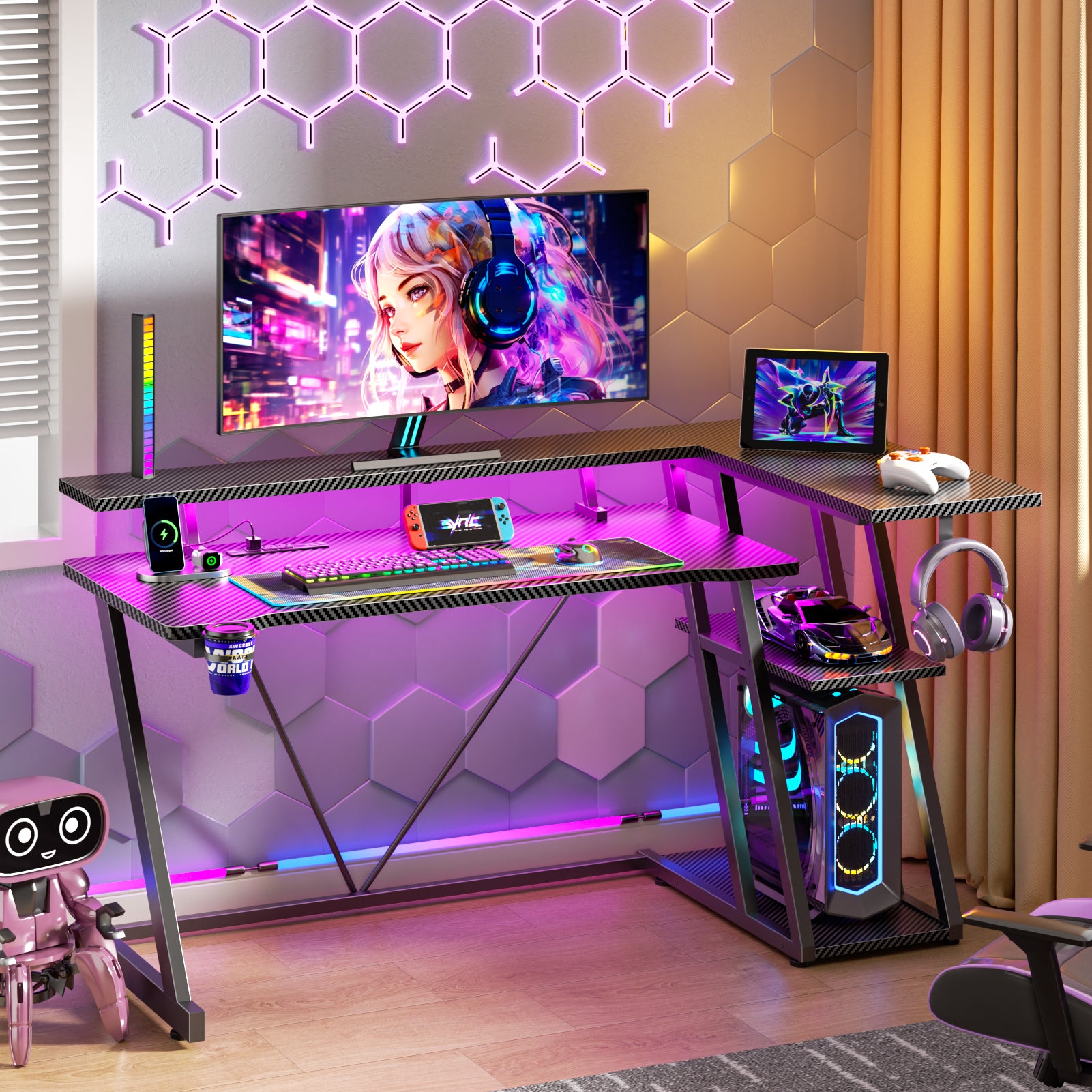DEPLOY TACTICAL STORAGE: Your arsenal, organized. The raised monitor stand frees up desk real estate for large mouse pads, while the included headphone hook, cup holder, and 3-tier shelves keep all essentials at your fingertips mid-game.