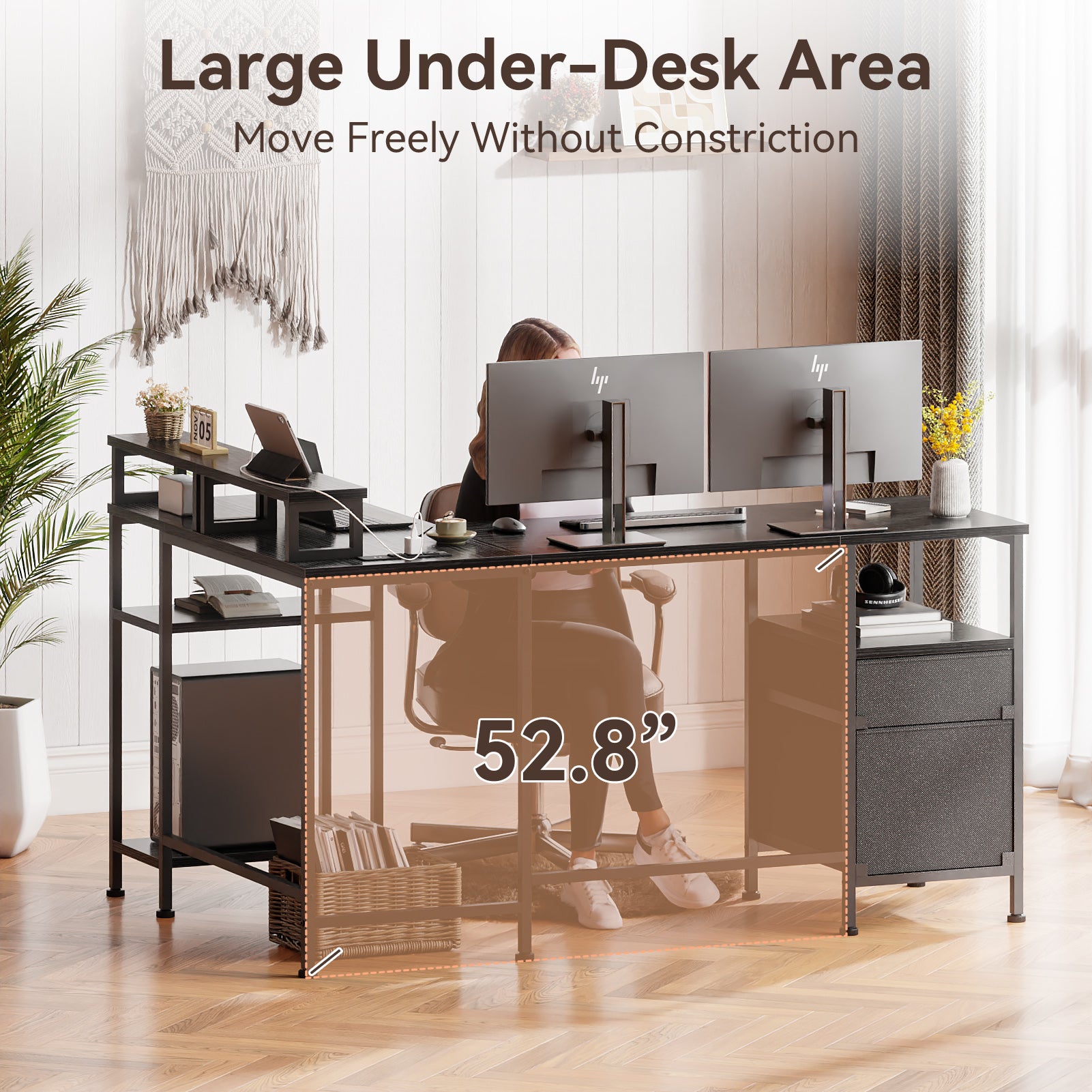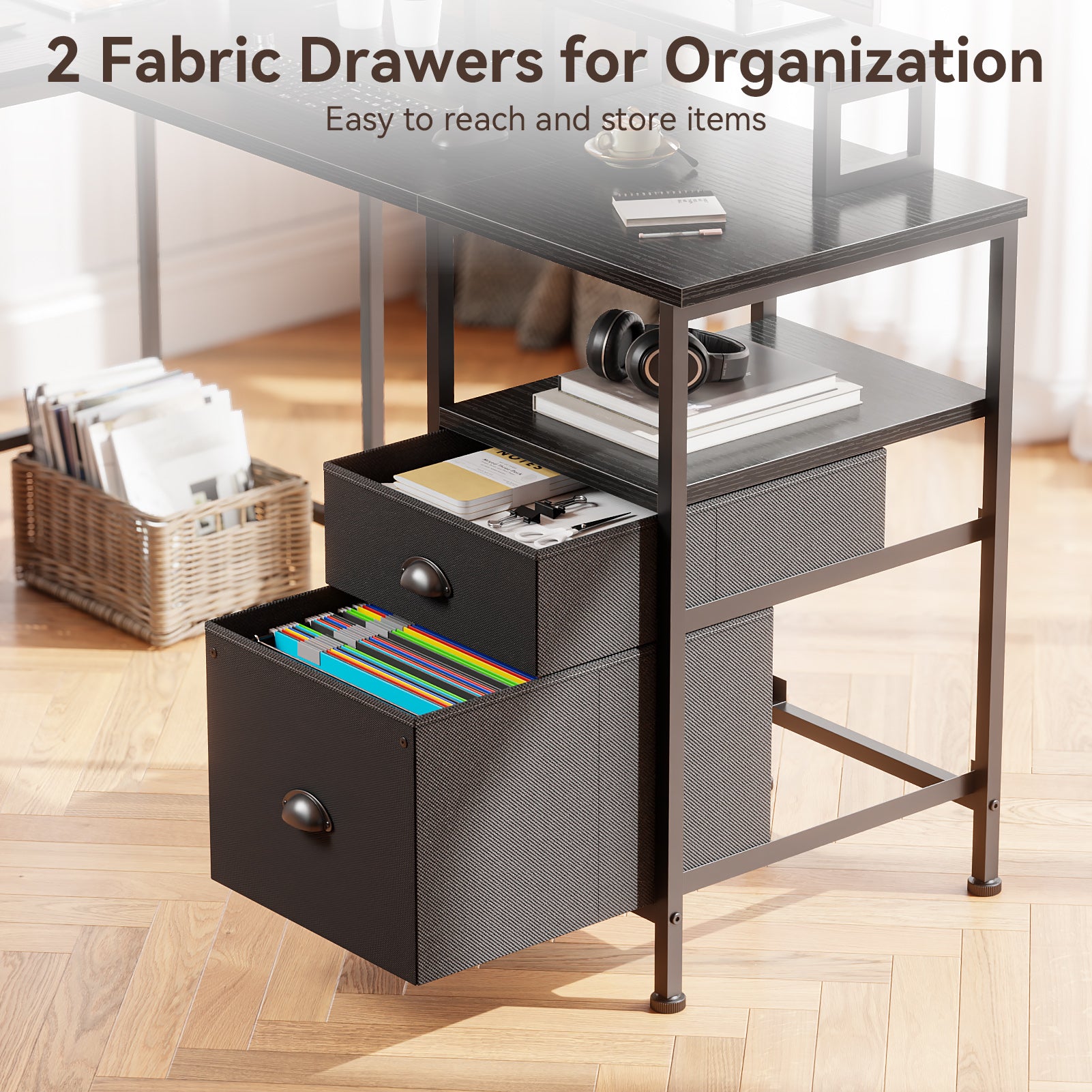 Ample Storage Solutions: The L-shaped desk includes a fabric file drawer and two-tier storage shelves, accommodating letter/A4/legal size files while keeping your workspace organized and dust-free.