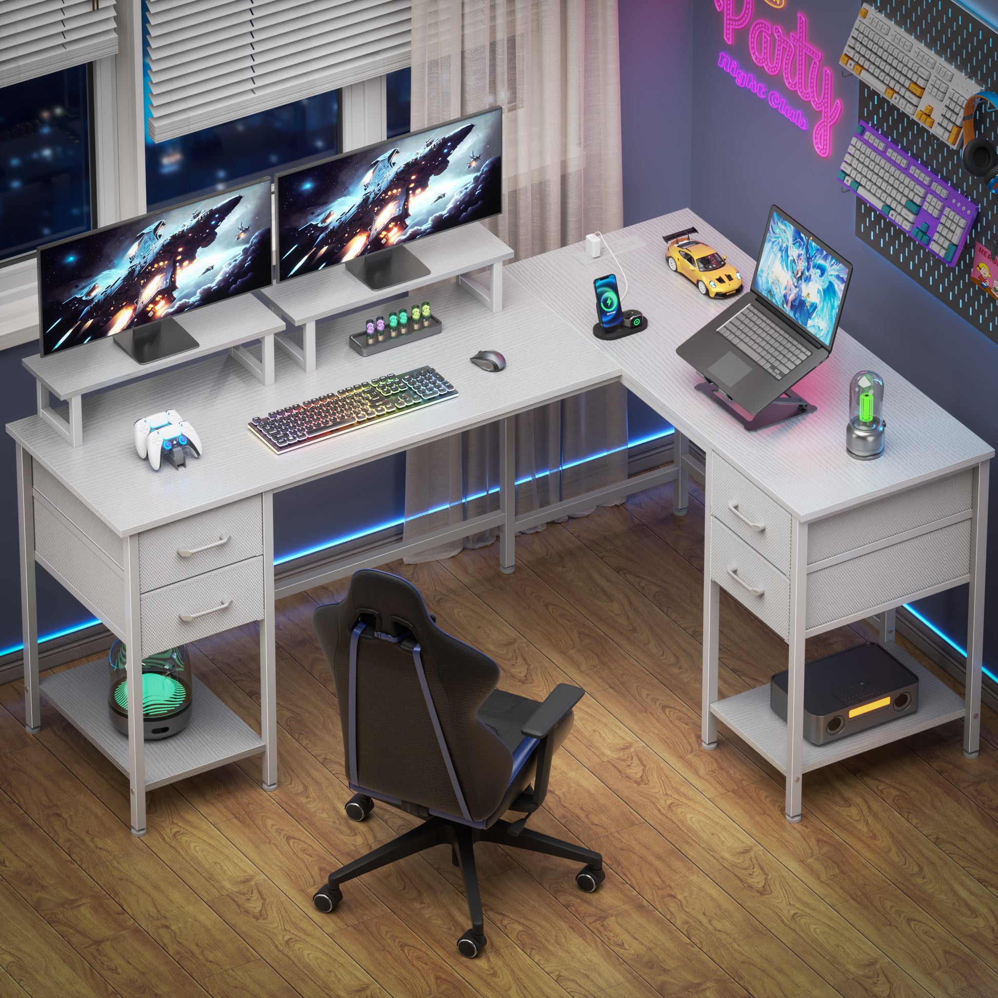 Satifur 59" L-Shaped Desk with Power Outlets, 4 Fabric Drawers & 2 Monitor Stands, Convertible Two Person Home Office Desk, White