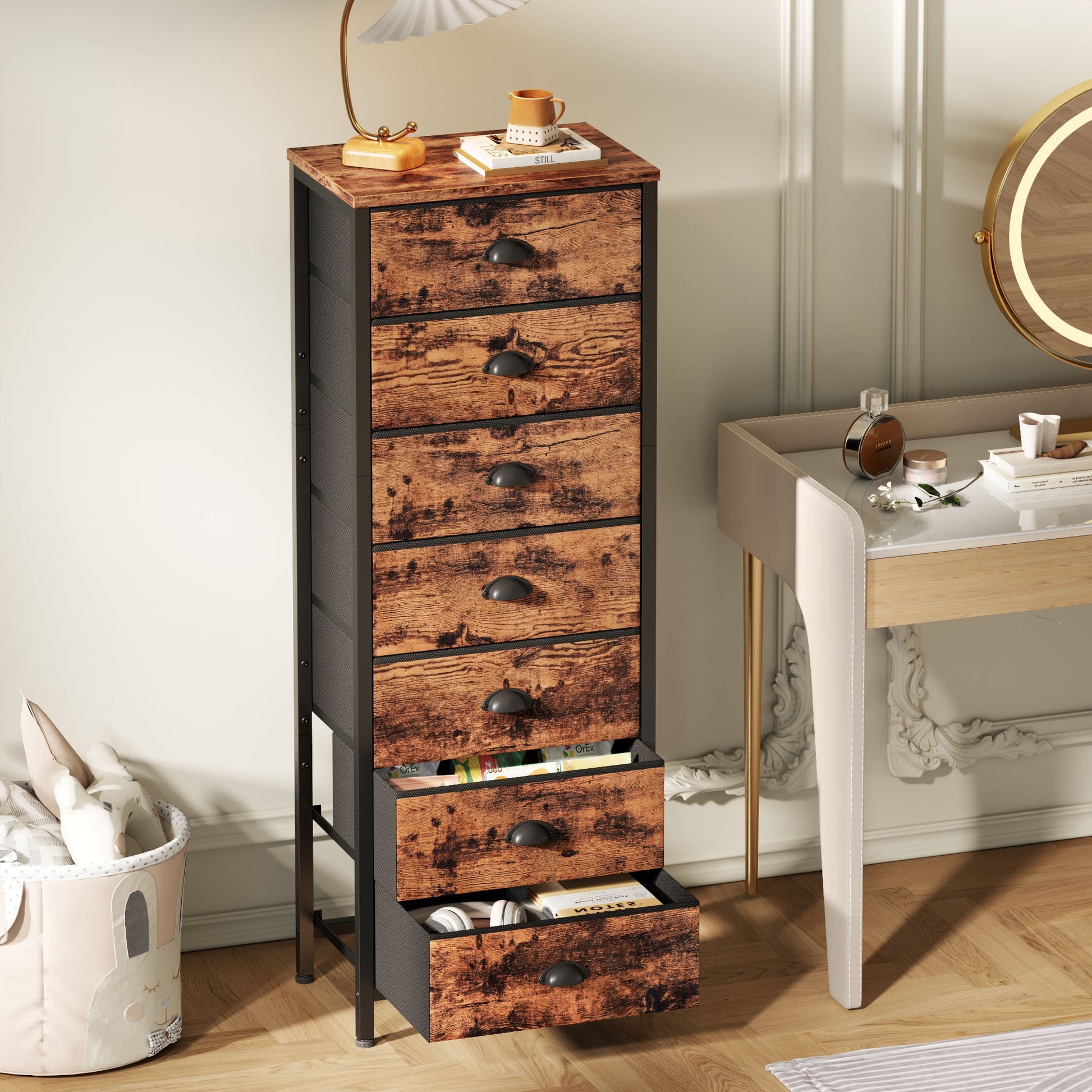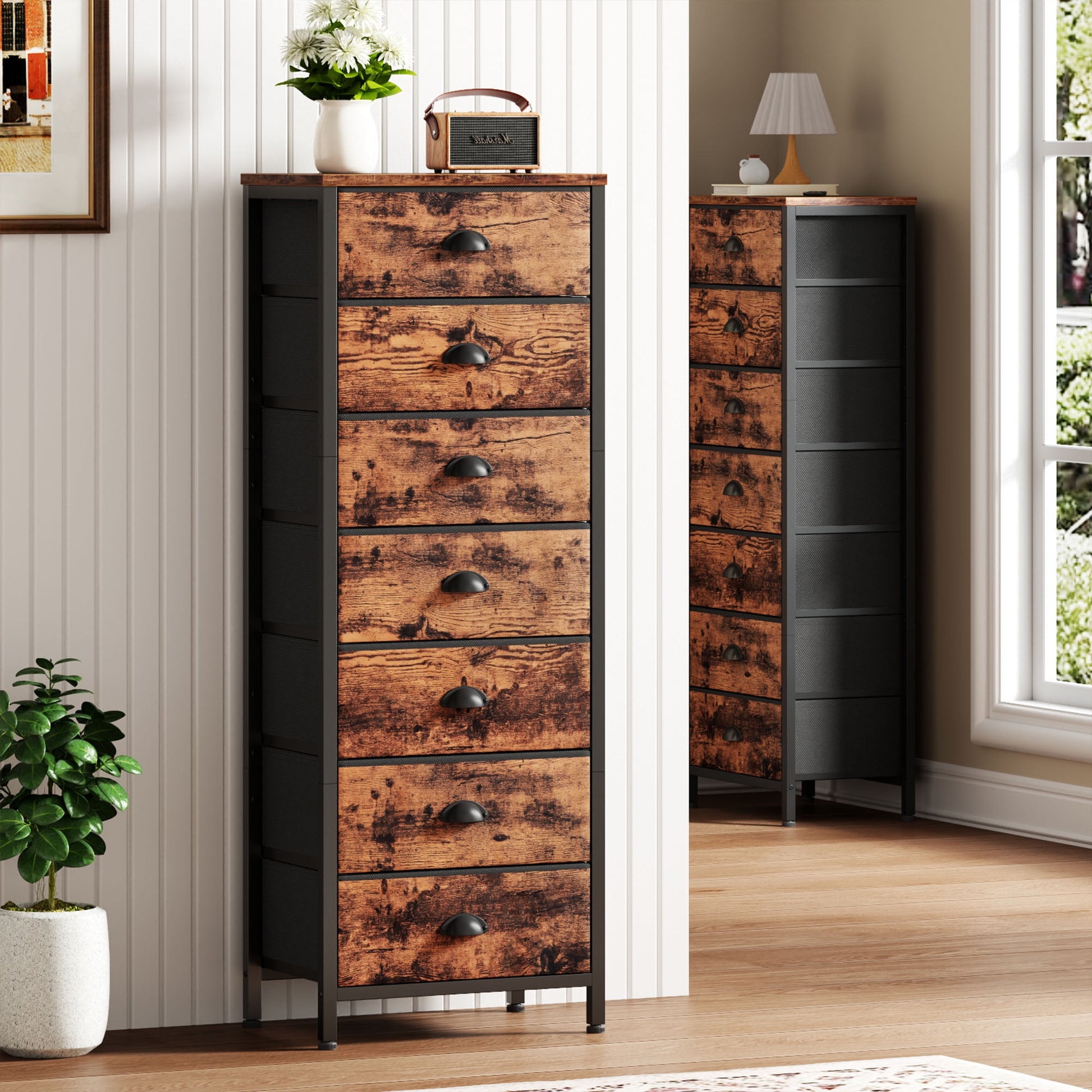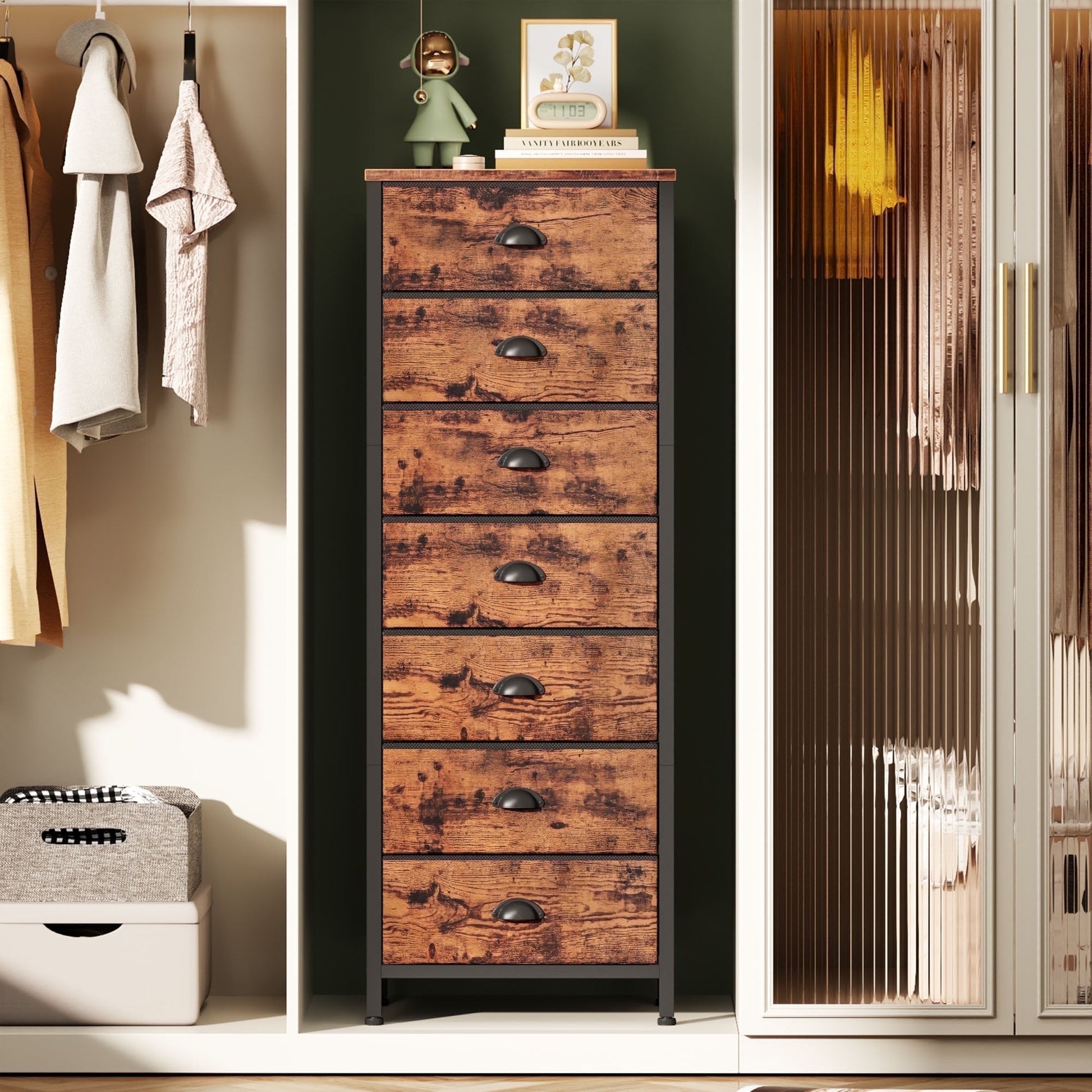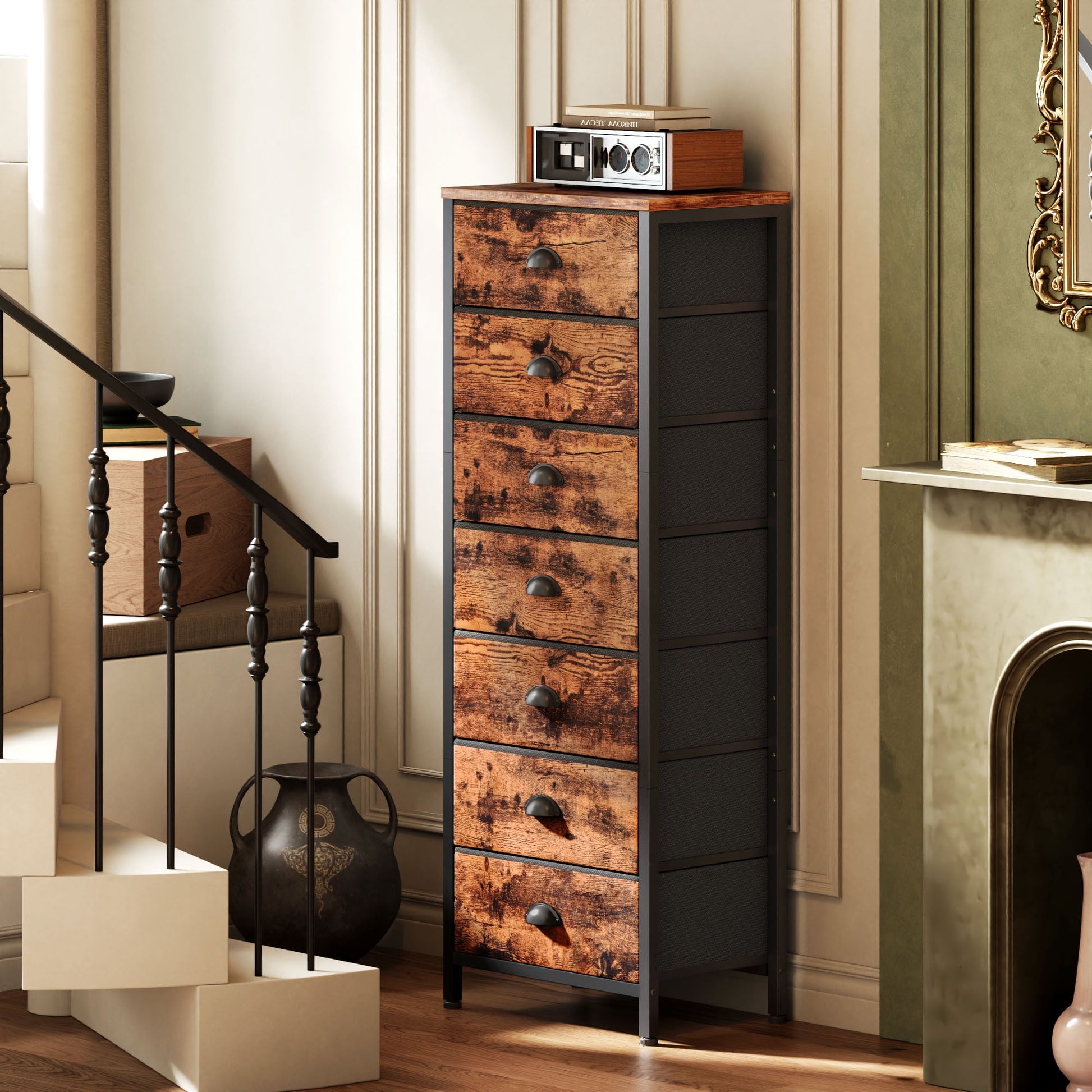 Satifur 7-Drawer Tall Dresser Bedside Fabric Nightstand with Storage,Rustic Brown