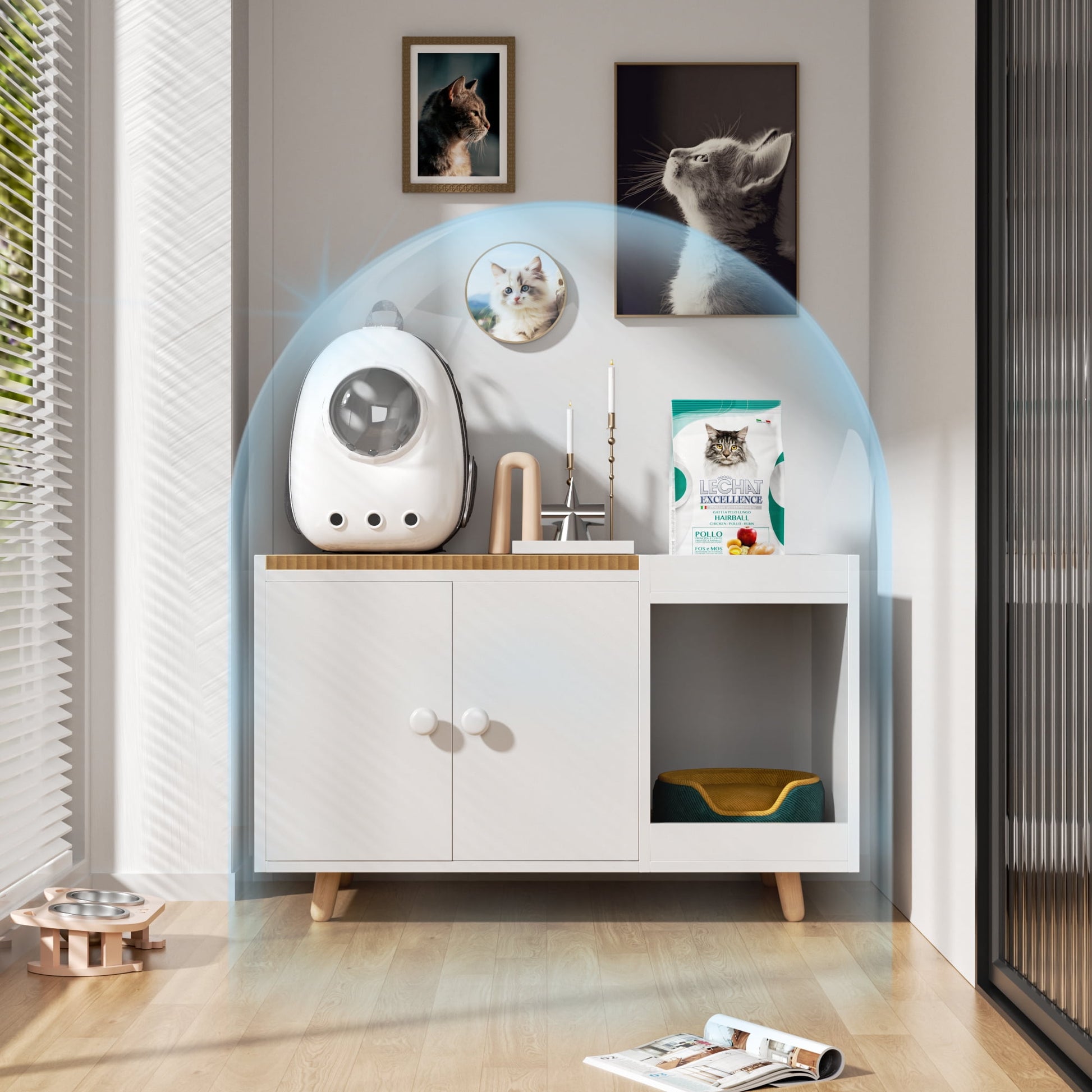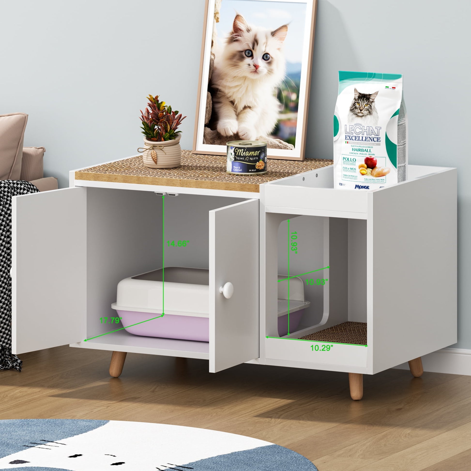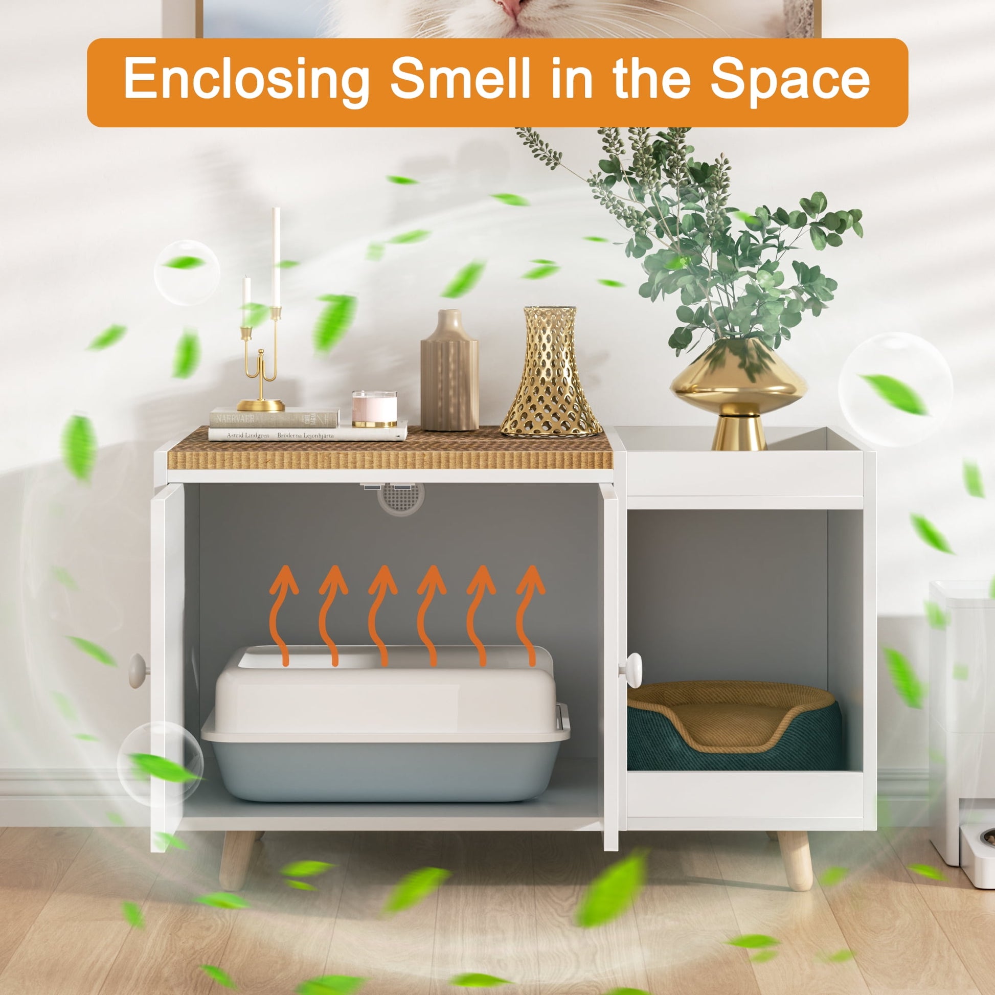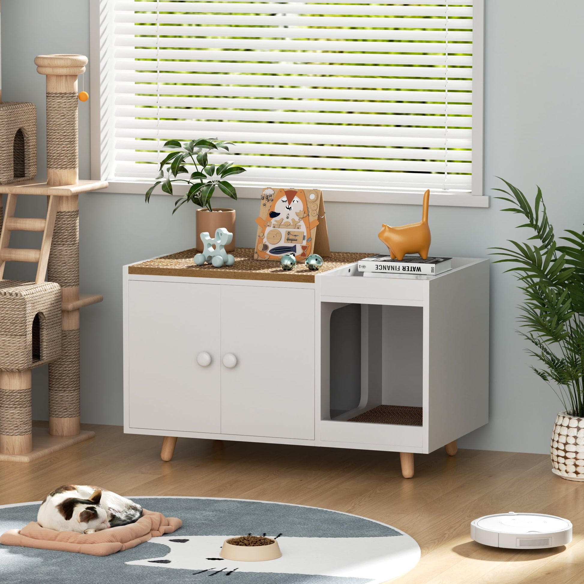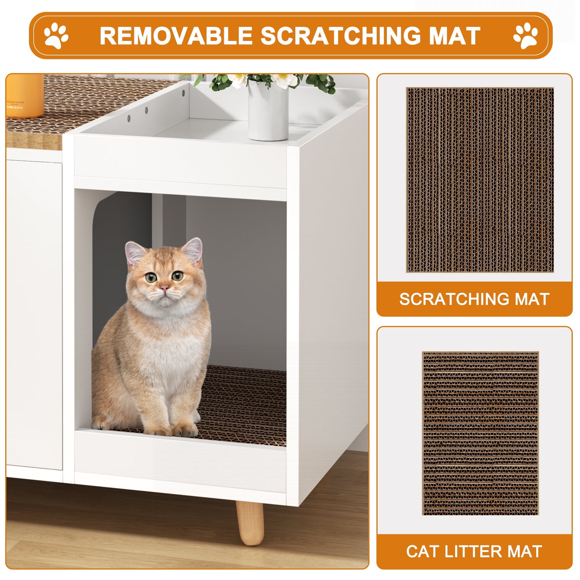 Upgrade your cat¡¯s space with the Satifur Cat Litter Box Enclosure, designed to combine practicality and style. This versatile furniture piece hides litter boxes discreetly while offering two removable scratching boards to satisfy your cat¡¯s natural instincts. Crafted with durable engineered wood, it supports pets up to 100 lbs and fits most standard litter boxes. The sleek white finish seamlessly blends with modern d¨¦cor, and the built-in storage cabinet keeps supplies organized. Includes a washable mat for easy cleanup and tool-free assembly¡ªperfect for busy pet owners.