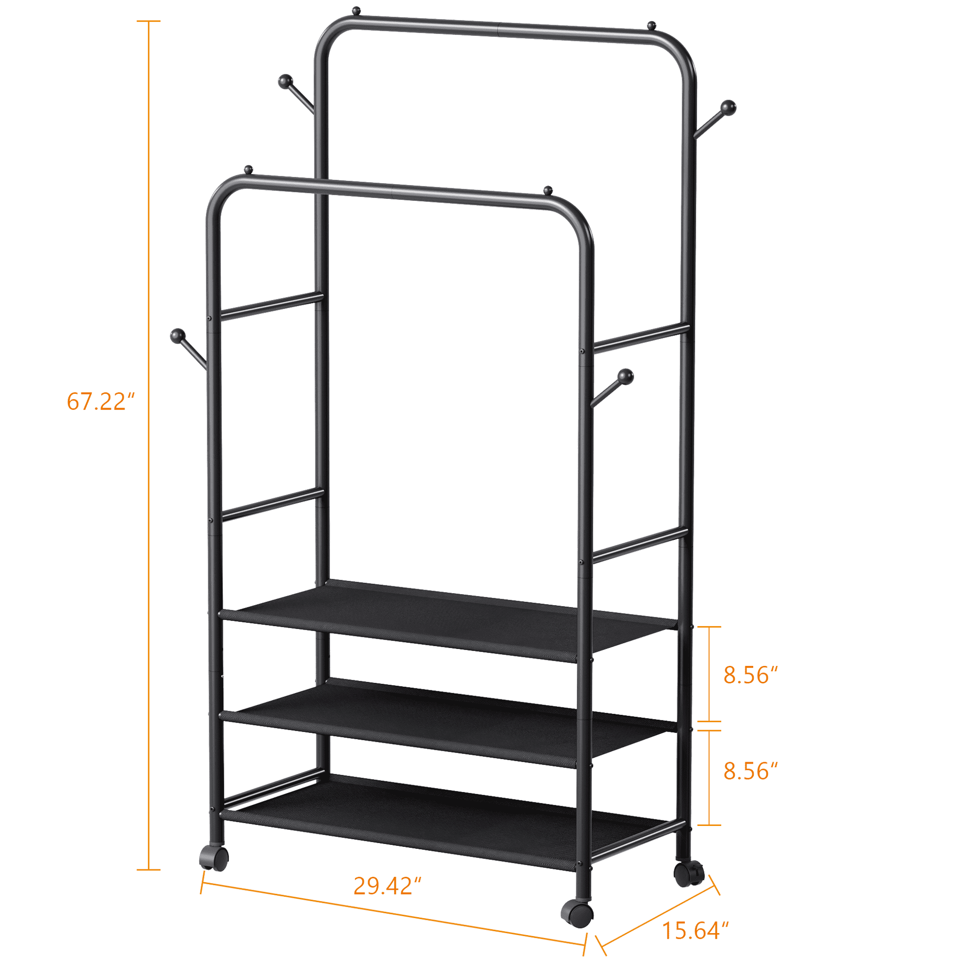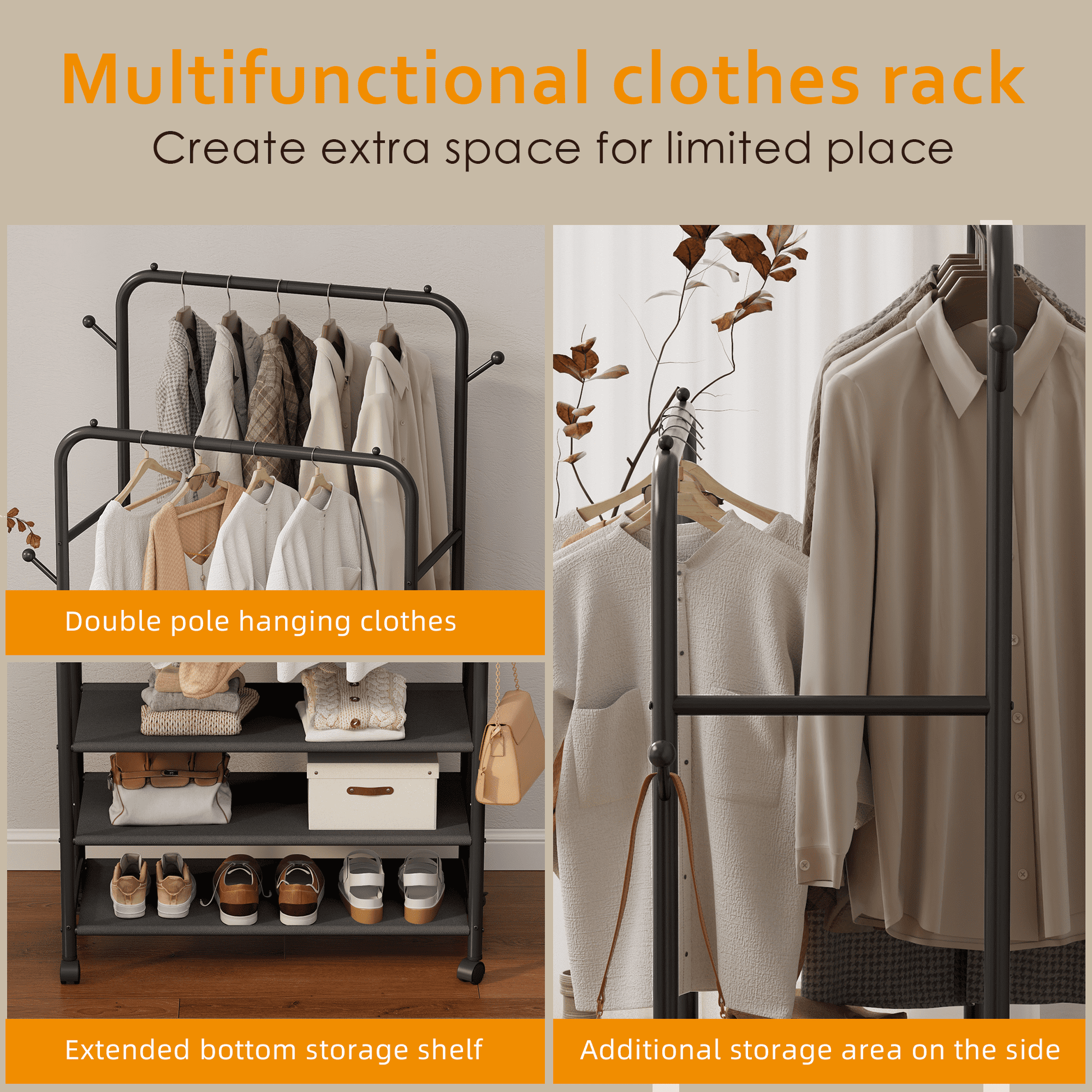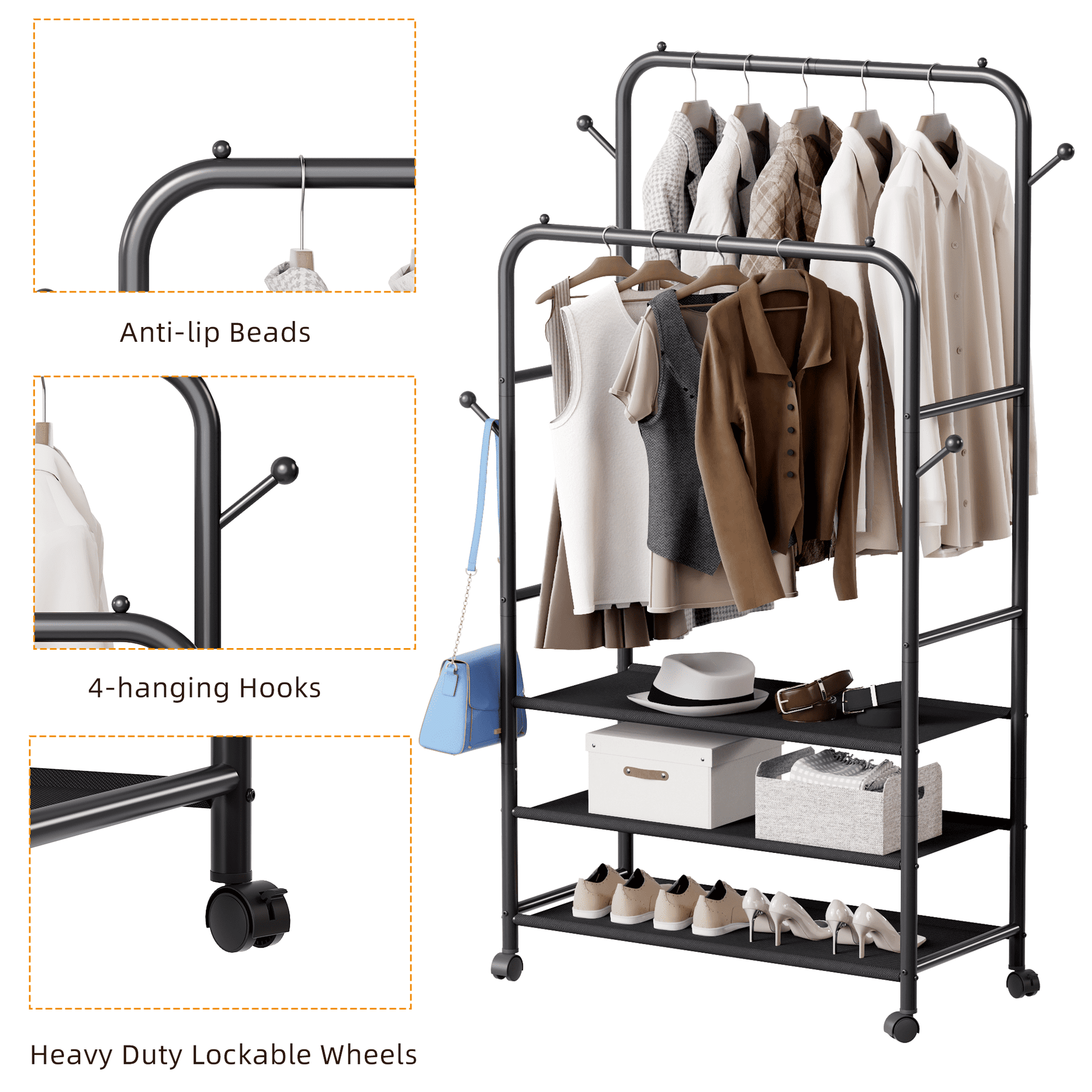 Satifur Clothes Rack with 3 Tiers Storage Shelves, Clothing and Shoes Racks, Garment Rack with Wheels, Multi-functional Double Rod Hanging Rack, Black