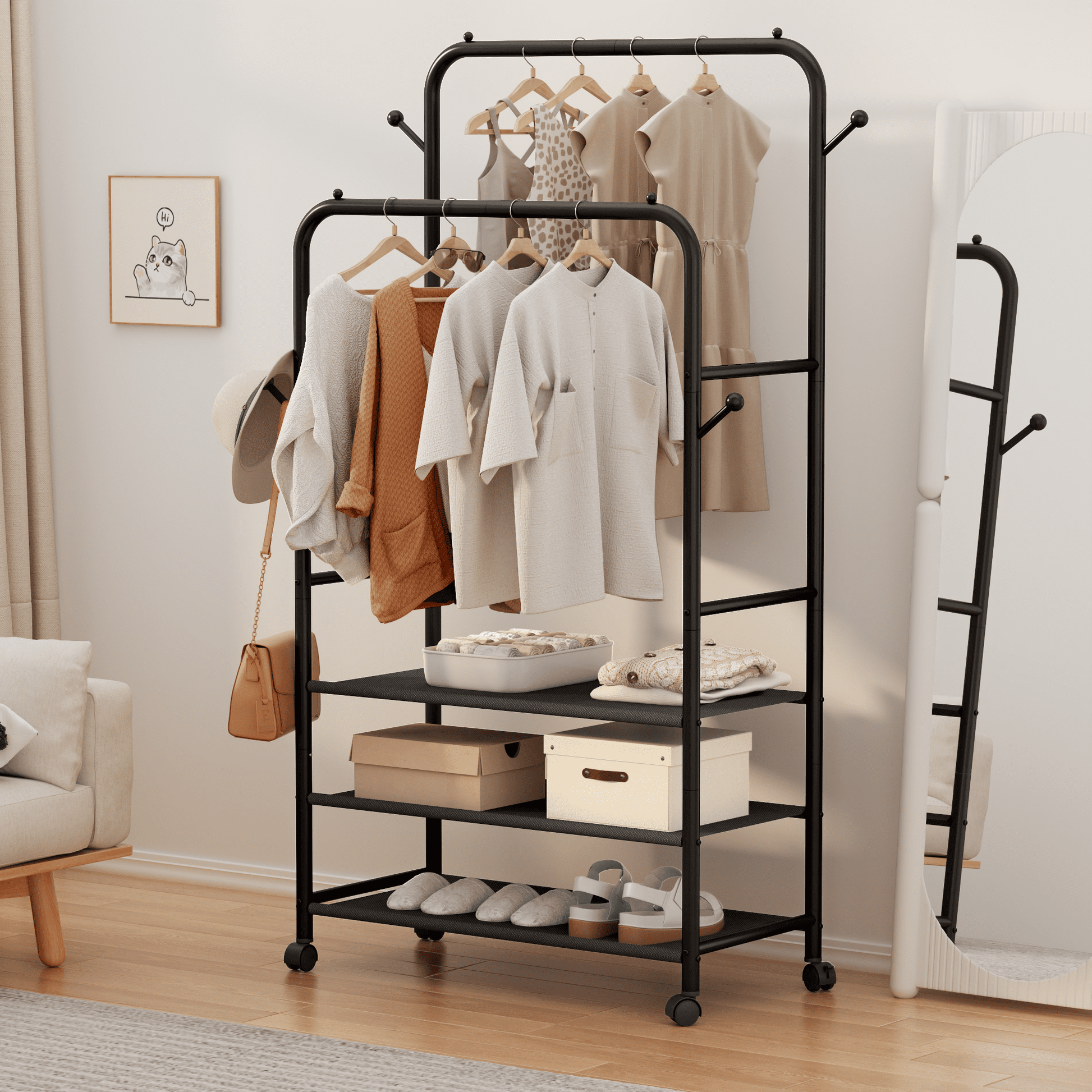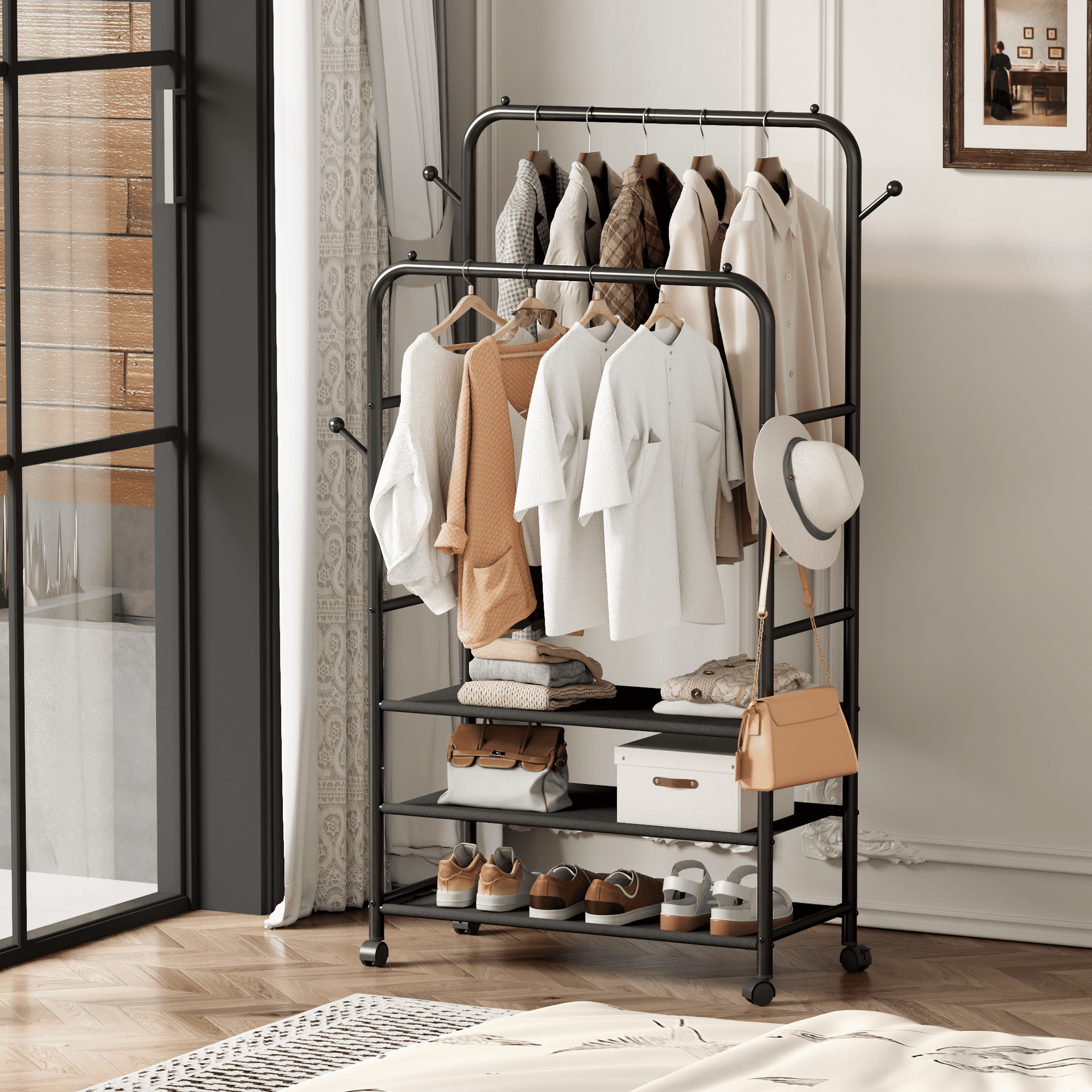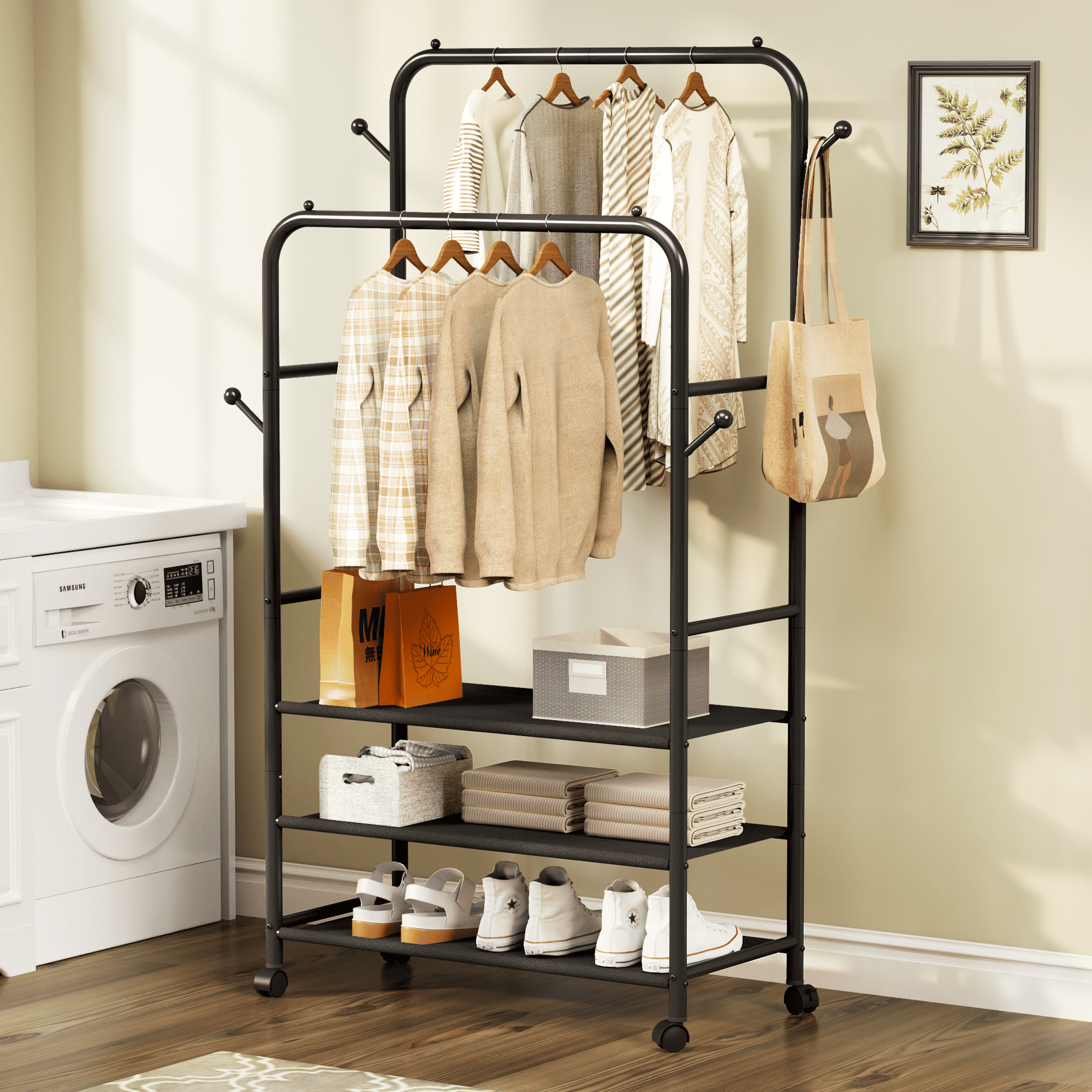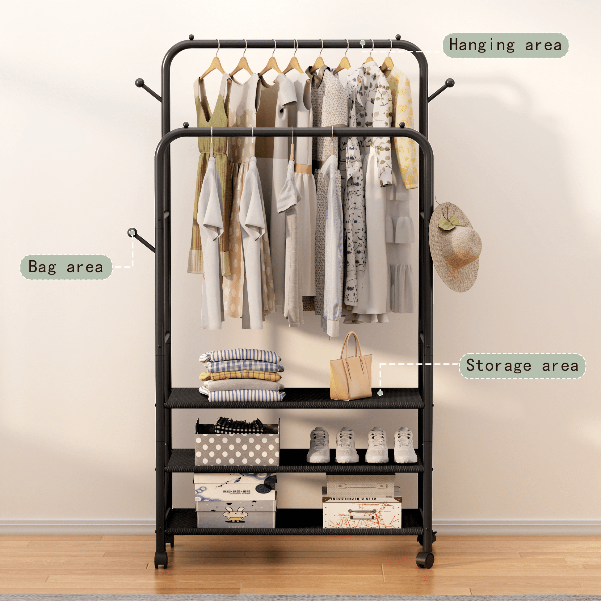 Satifur Clothes Rack with 3 Tiers Storage Shelves, Clothing and Shoes Racks, Garment Rack with Wheels, Multi-functional Double Rod Hanging Rack, Black