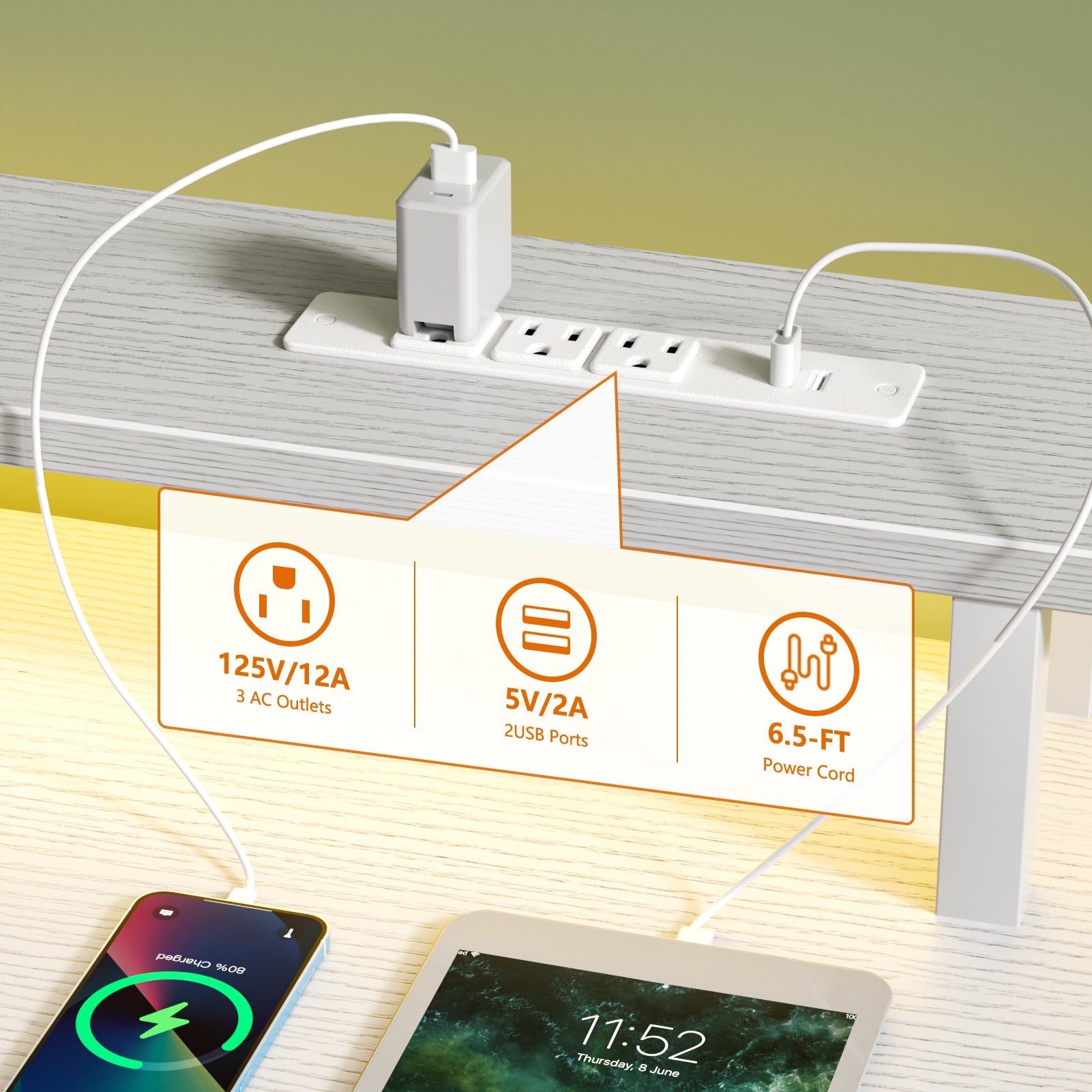 - 【Built-in Charging Station】The charging station includes 3 AC outlets (maximum 1500W) and 3 USB ports, capable of powering up to five devices simultaneously. Power outlets charge phones, tablets, laptops, and more. The 59-inch spacious desktop accommodates home office or gaming peripherals.
