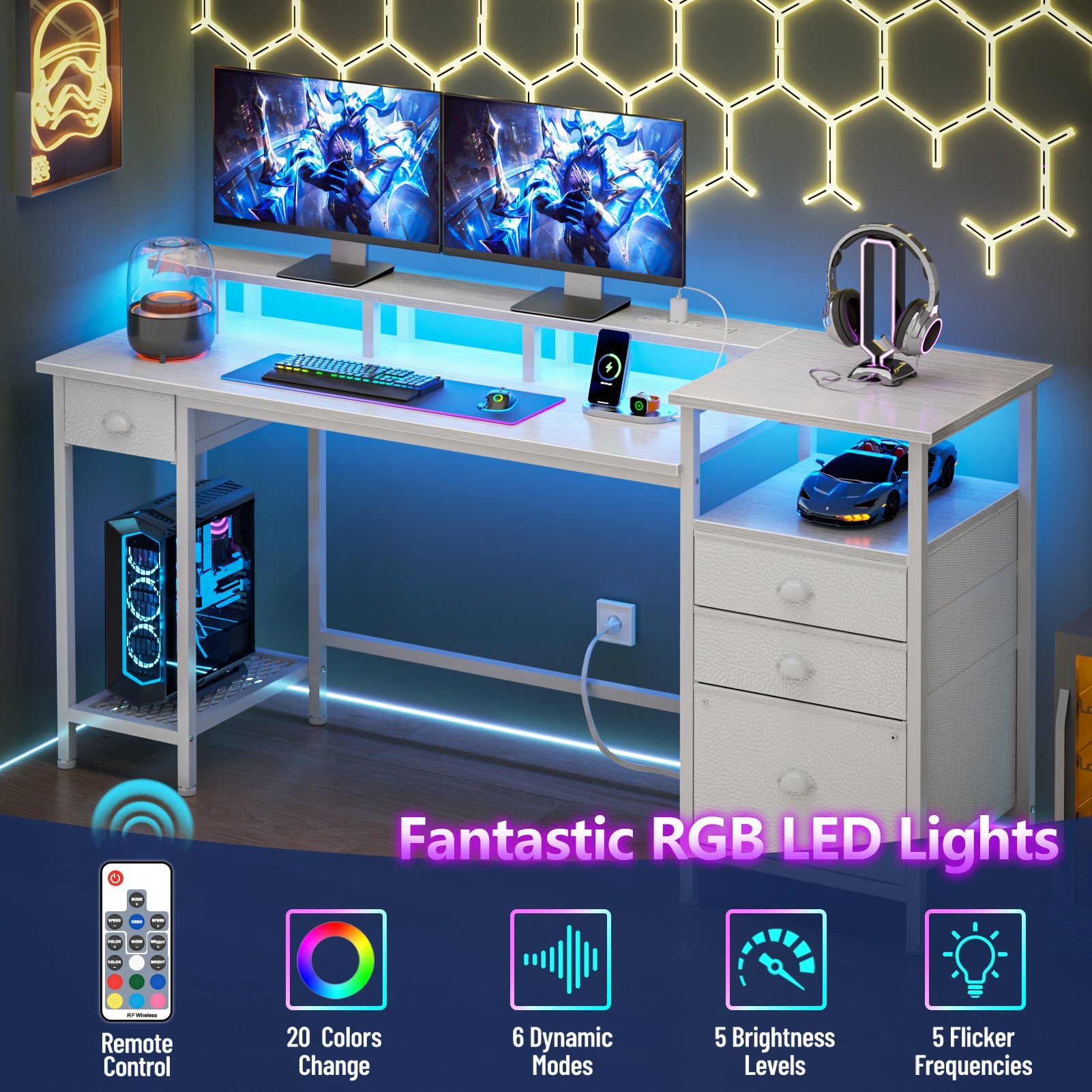 Satifur Computer Desk with 4 Drawers, 60 Inch Reversible Desk with Led Lights & Power Outlet, Home Office Desk with File Drawer & Monitor Stand, White