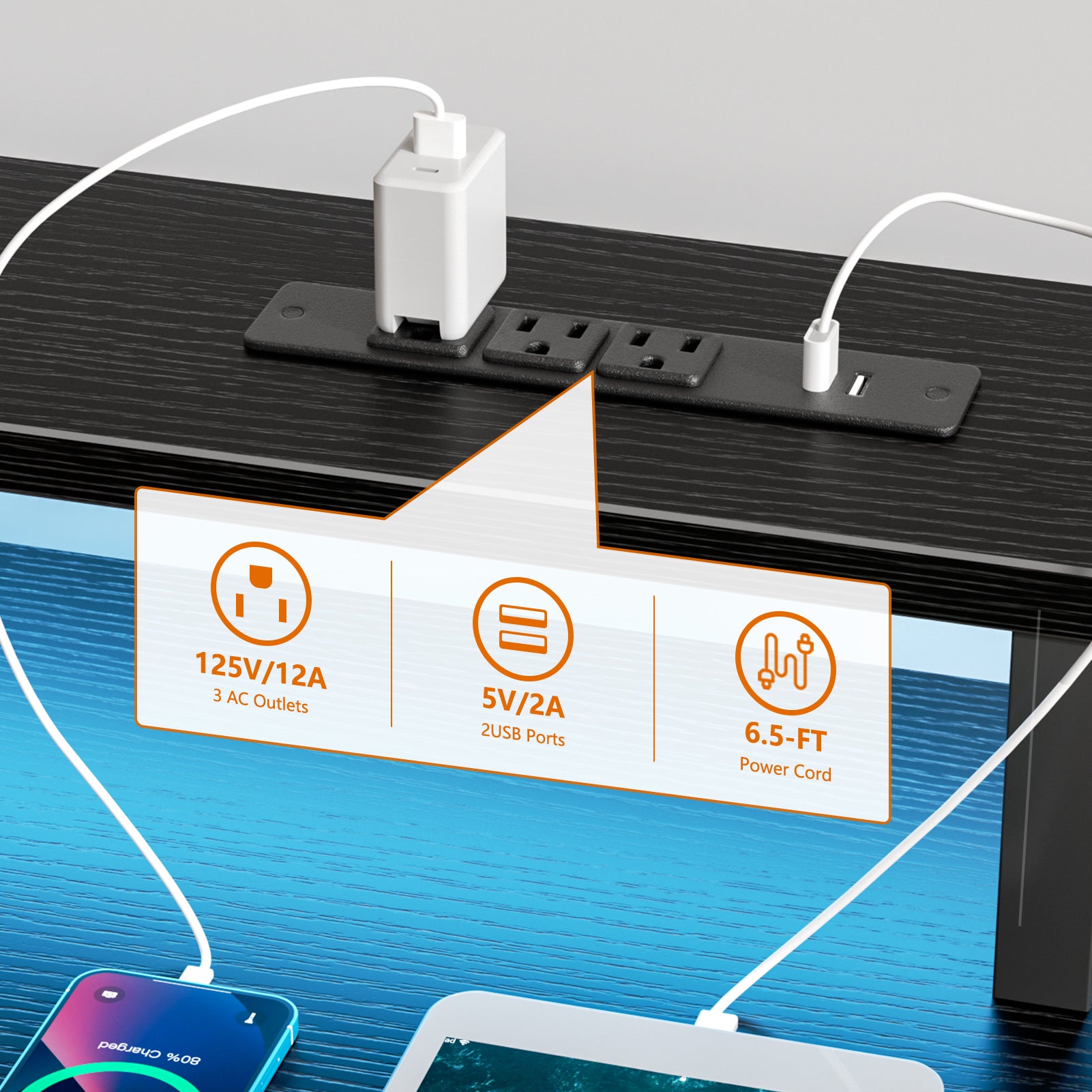 - 【Built-in Charging Station】The charging station includes 3 AC outlets (maximum 1500W) and 3 USB ports, capable of powering up to five devices simultaneously. Power outlets charge phones, tablets, laptops, and more. The 59-inch spacious desktop accommodates home office or gaming peripherals.