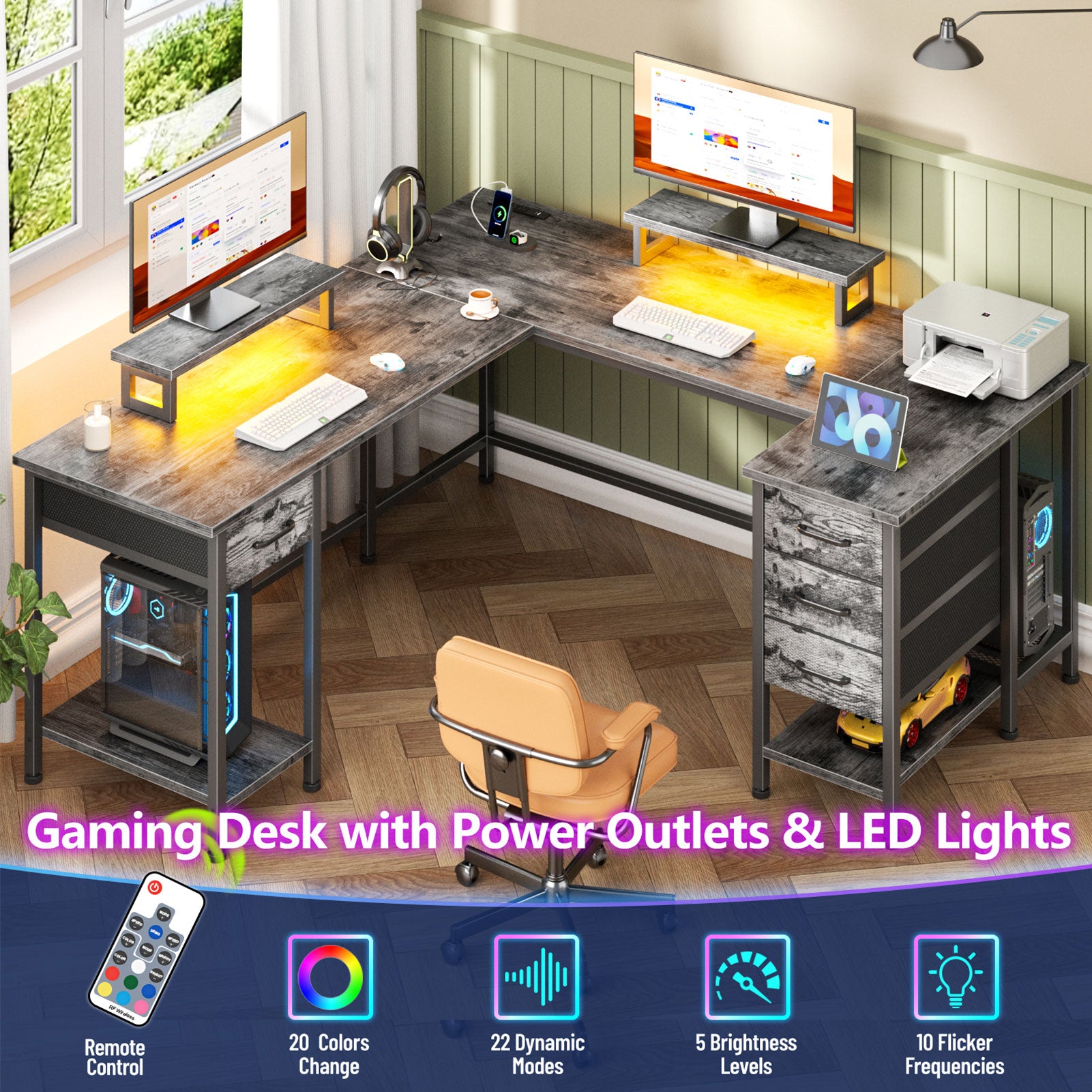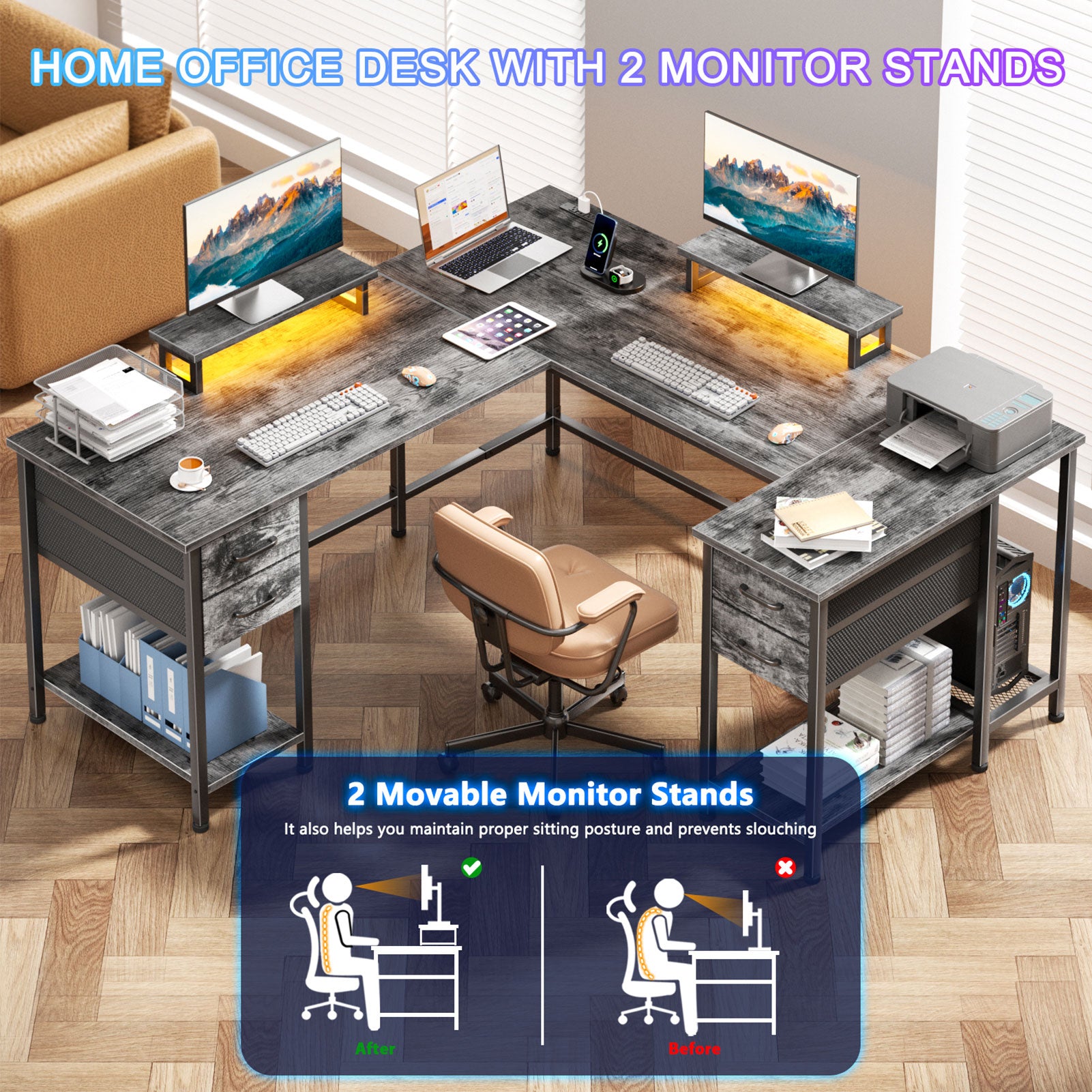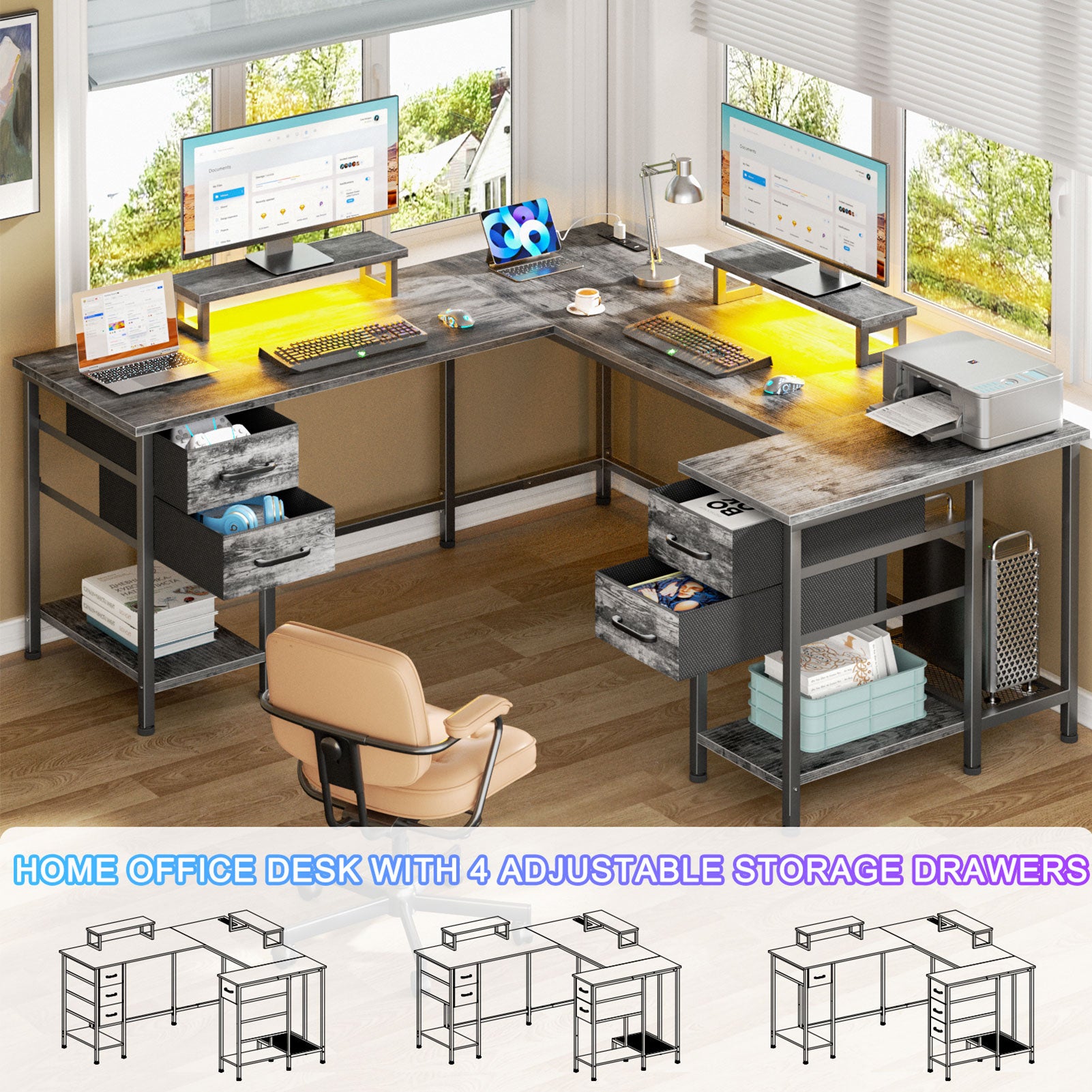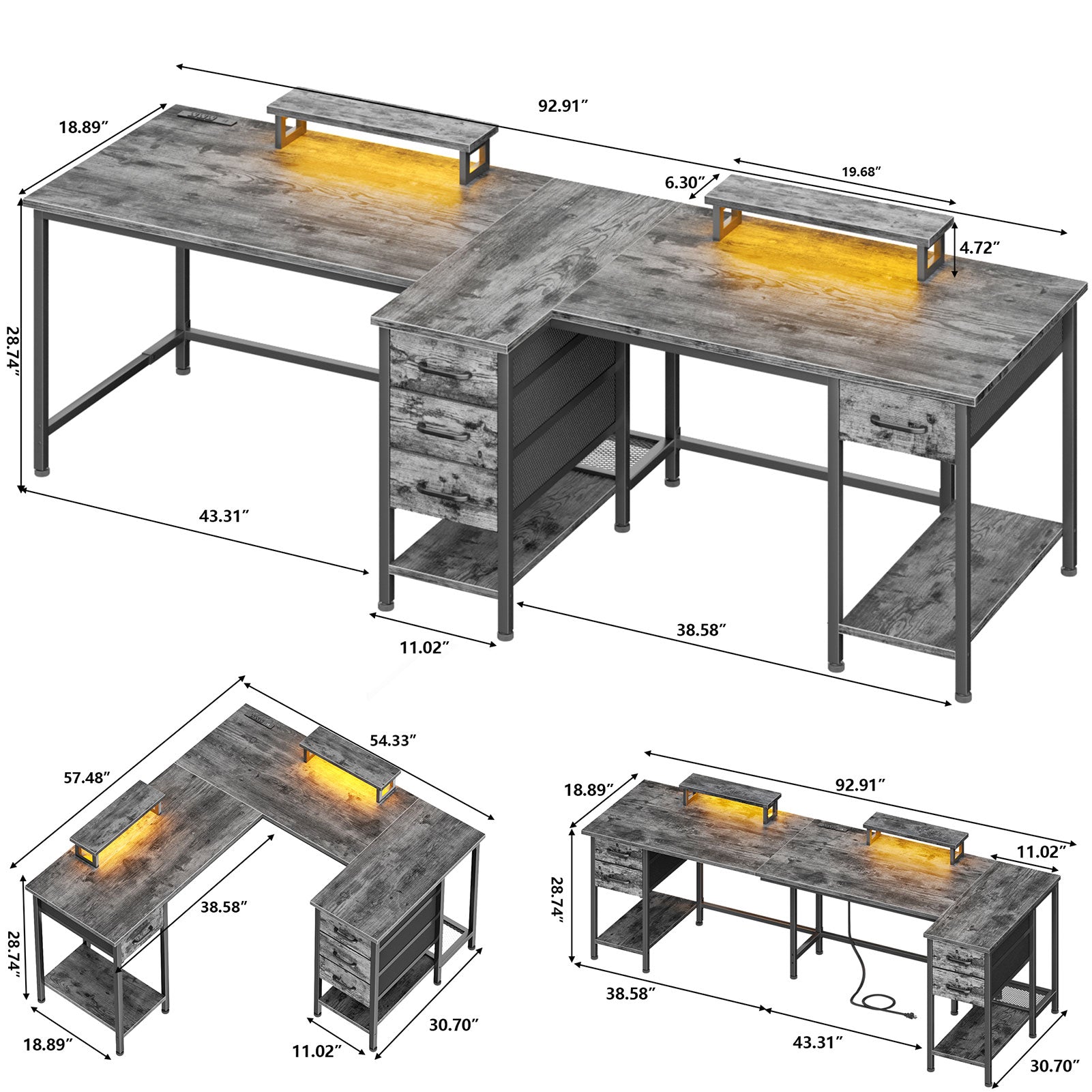 Satifur Computer Desk with Power Outlet & LED Light, Home Office Writting Desk for 2 Person 93" with Drawers & Monitor Stands, Grey