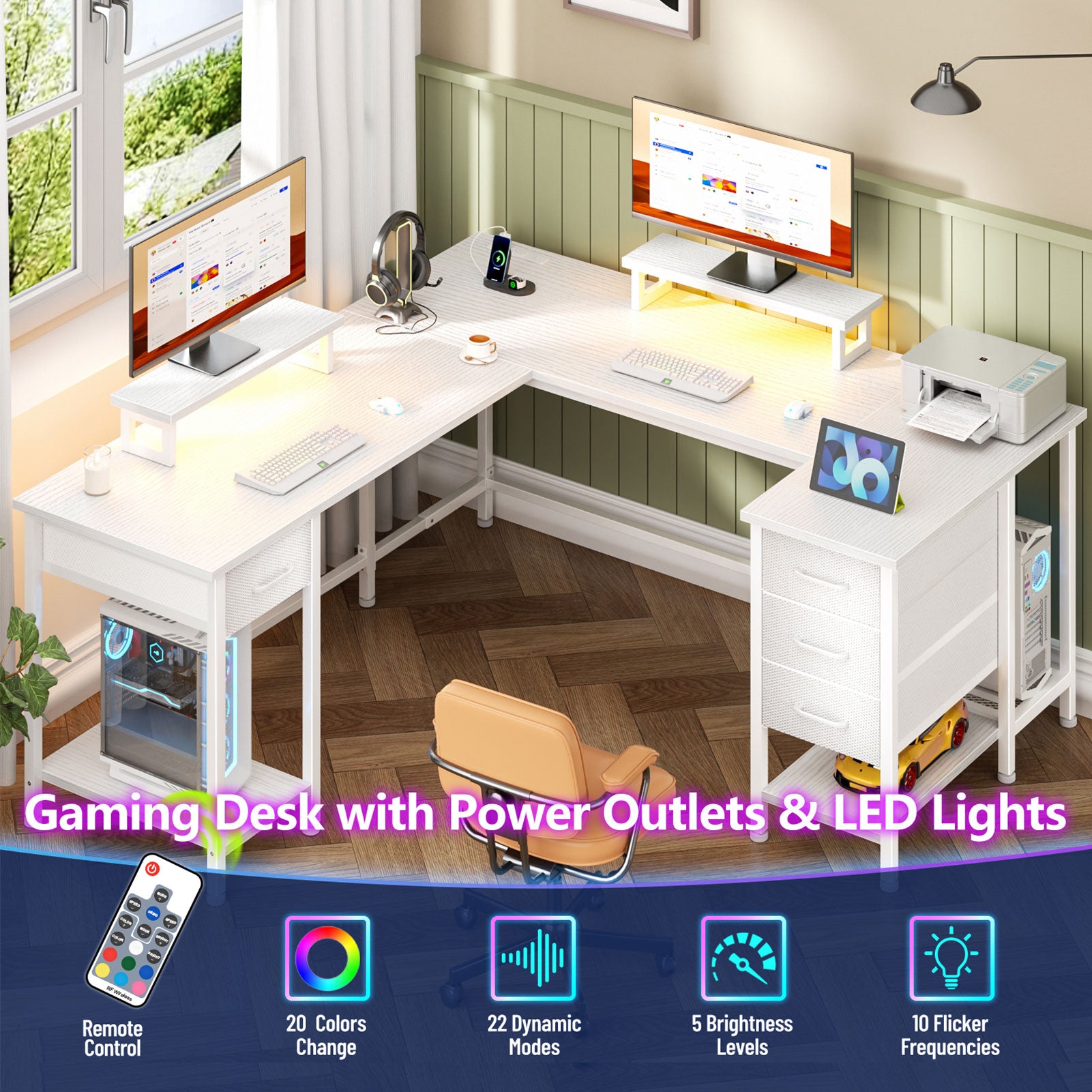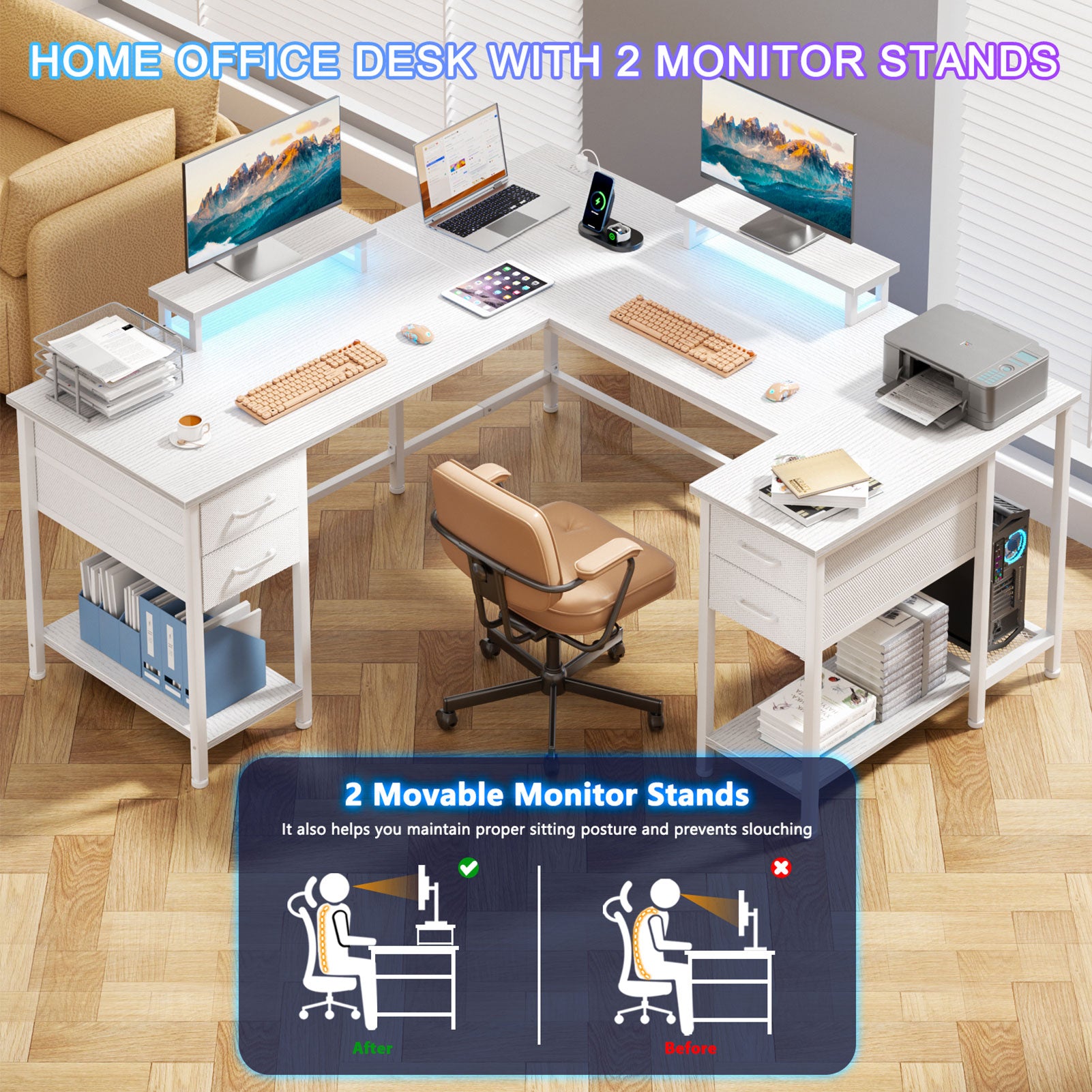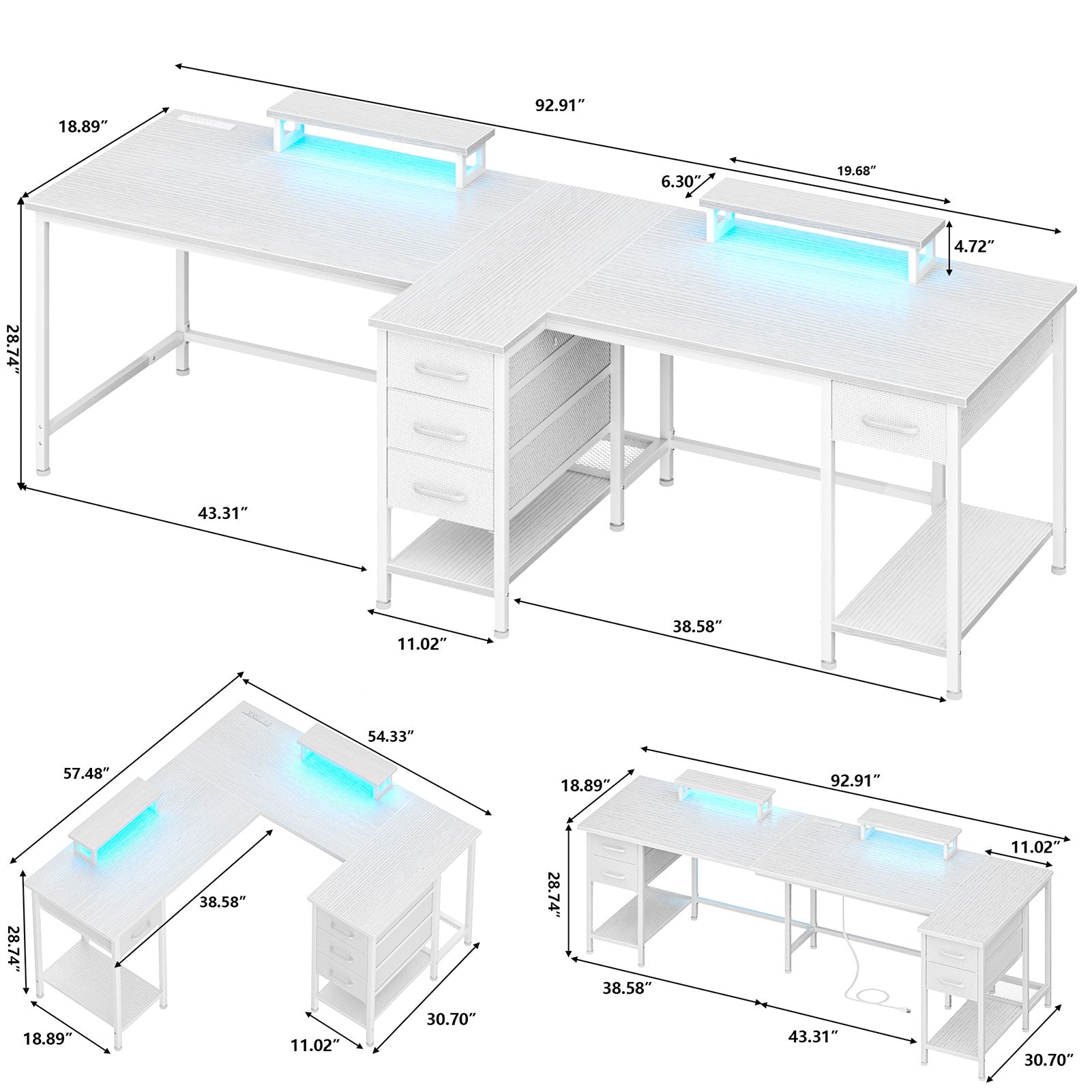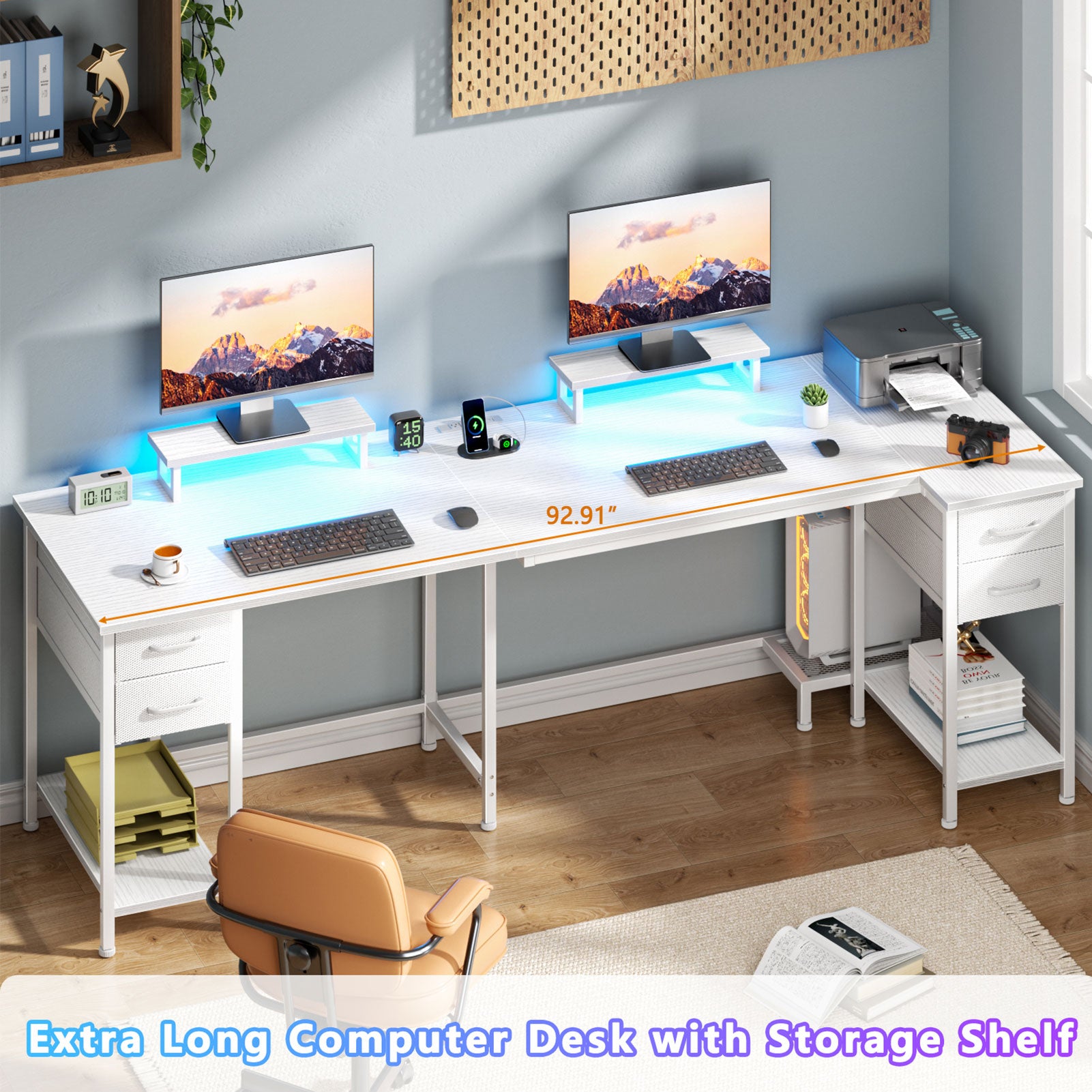 Satifur Computer Desk with Power Outlet & LED Light, Home Office Writting Desk for 2 Person 93" with Drawers & Monitor Stands, White