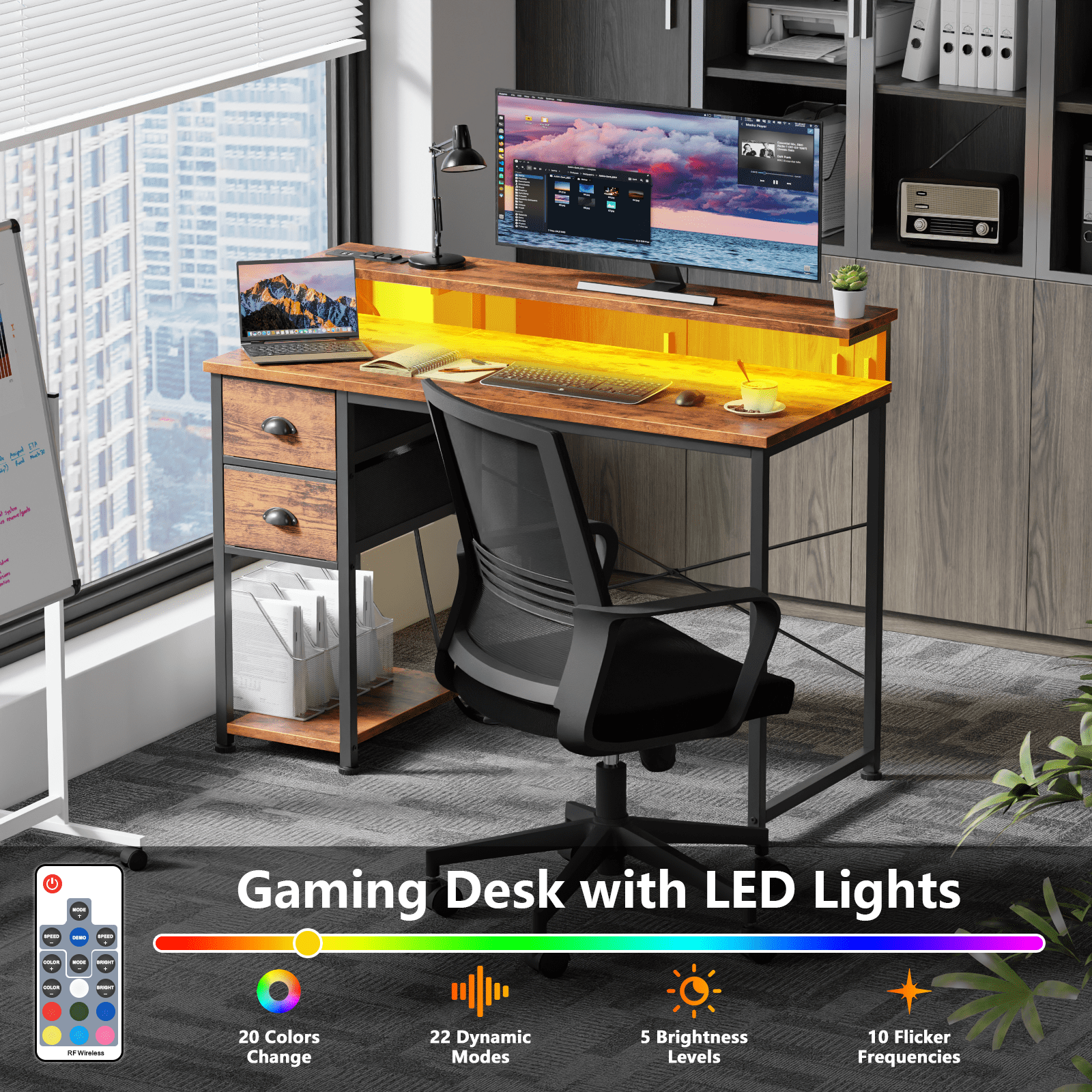 Satifur Computer Desk with Power Outlets & LED Lights, Home Office Desk with 2 Drawers, LED Change Colors Standing Gaming Desk, Rustic Brown-1