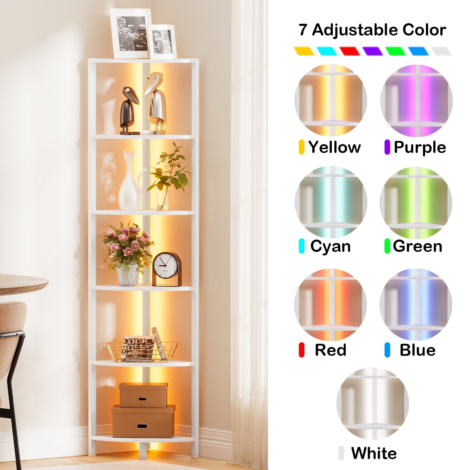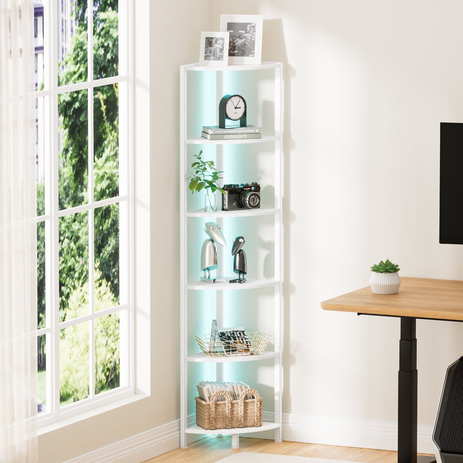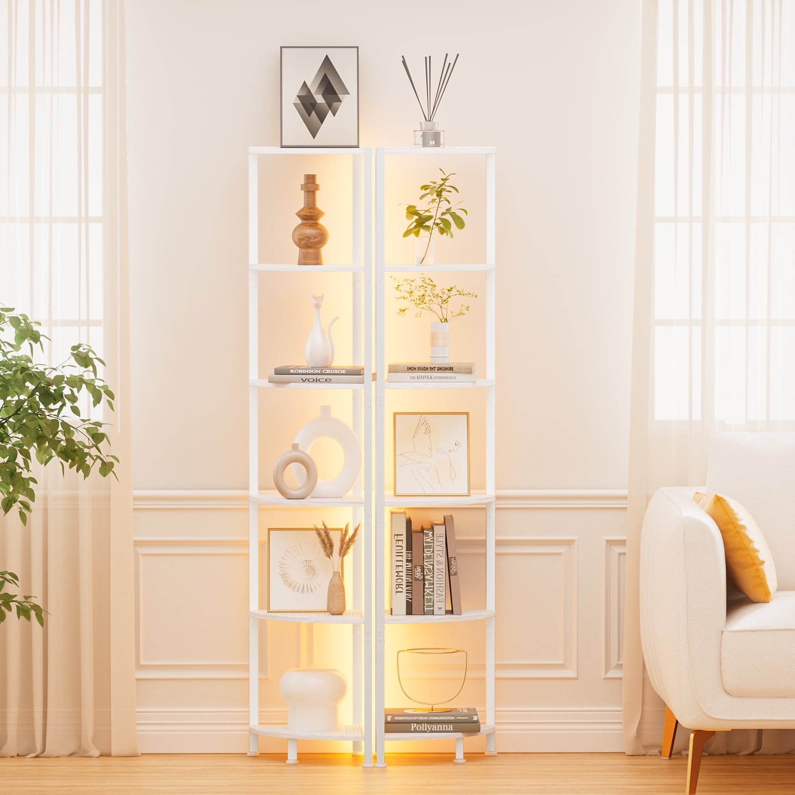 Satifur Corner Shelf Bookcase with LED Light Strip, 6-Tier Corner Bookshelf for Living Room,Bedroom,White