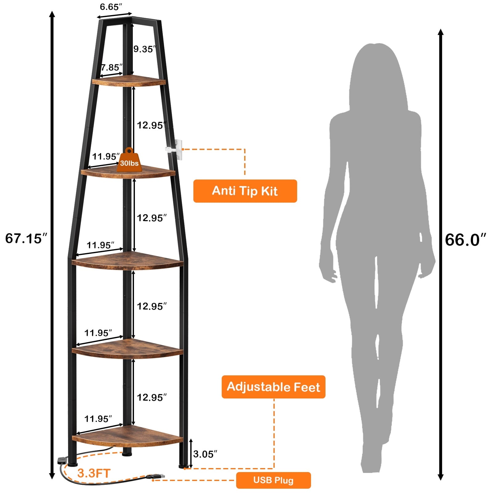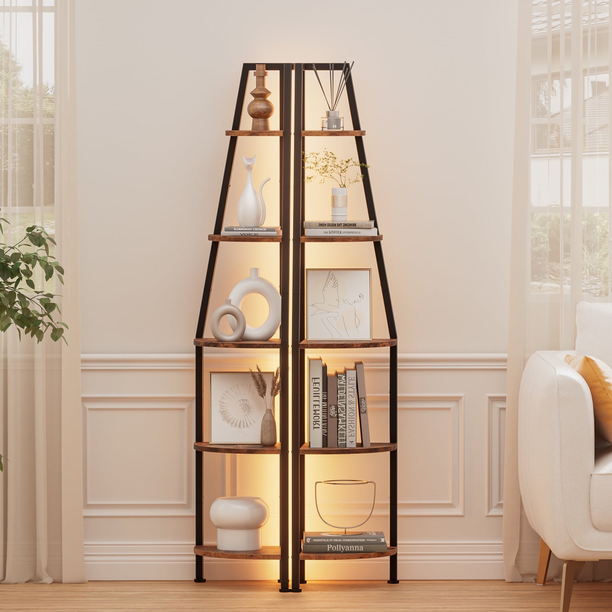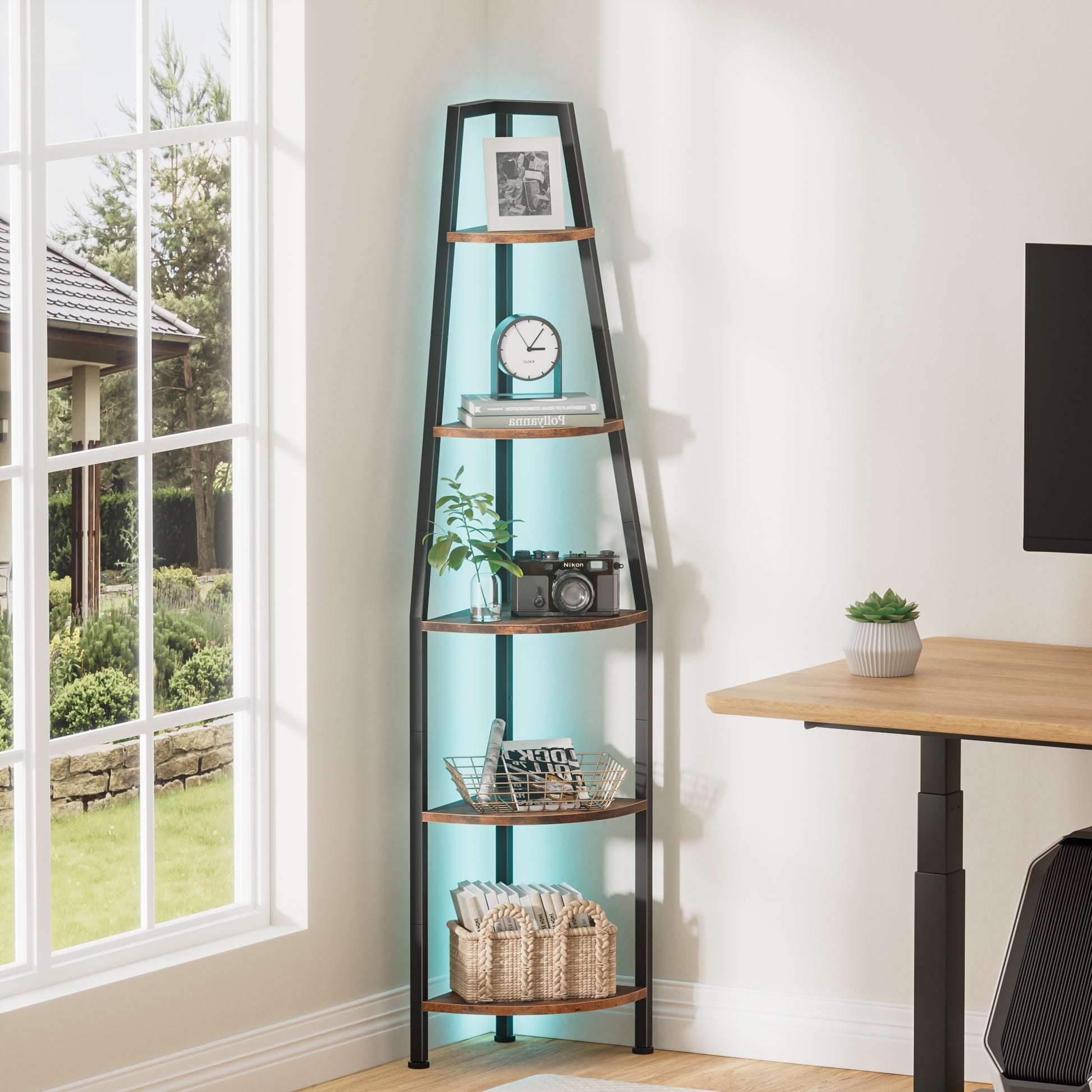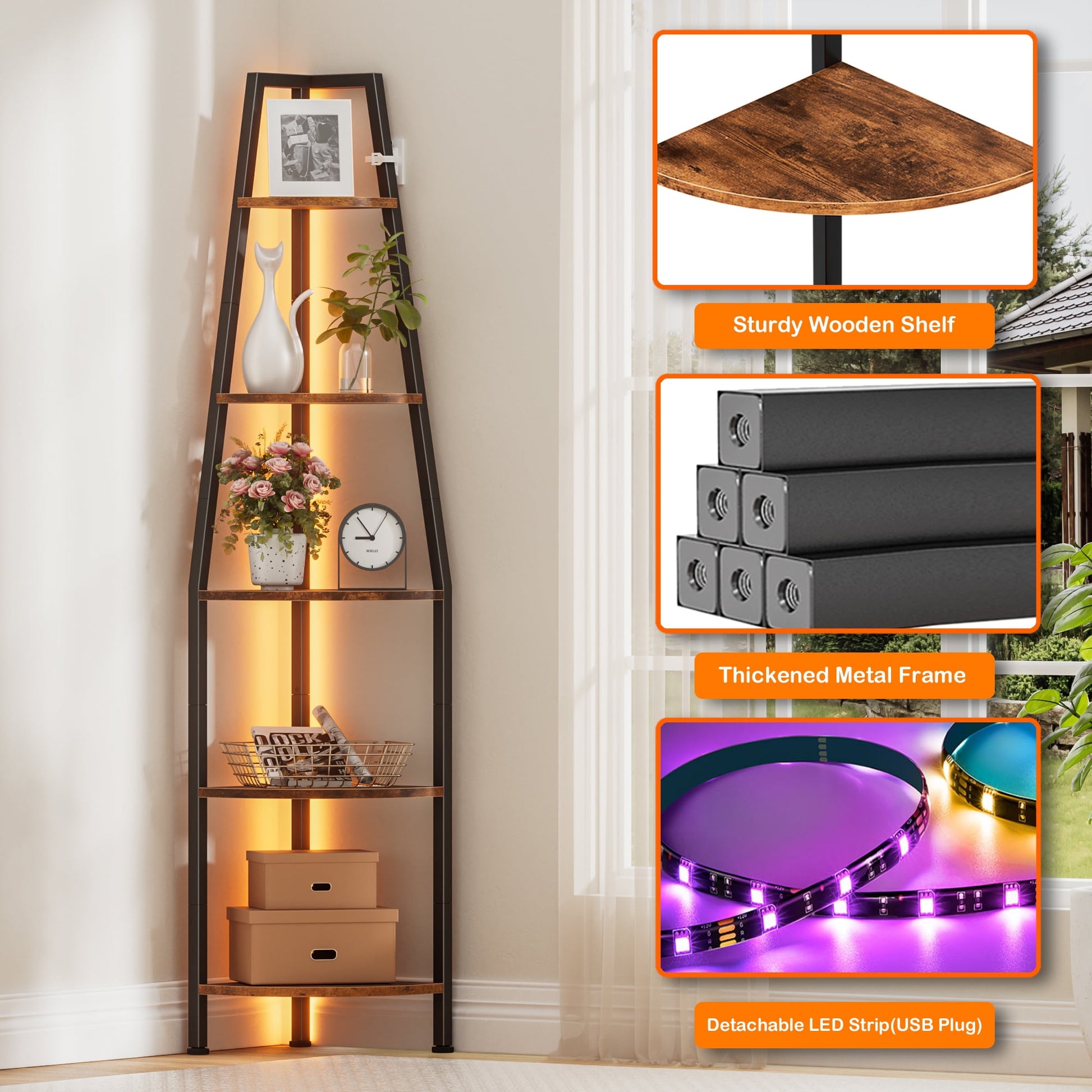 --Multi-tier shelves maximize corner space, ideal for displaying plants, books, or decor.