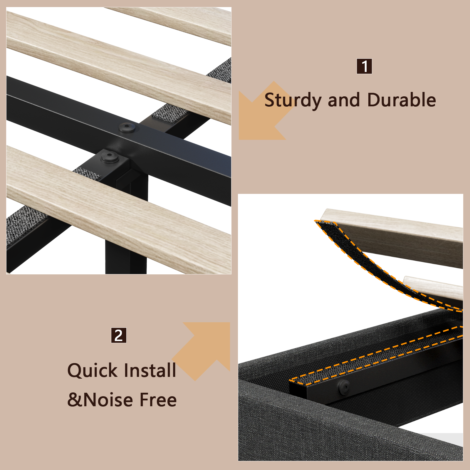 Satifur Dark Gray Bed Frame with Charge Station, Queen Size Bed Frame with LED Lights & Upholstered Headboard, No Box Spring Needed, Linen Fabric