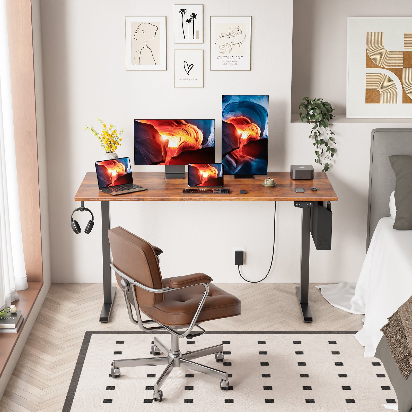 Satifur Electric Standing Desk 55", Ergonomic Computer Desk with Memory Preset, Height Adjustable Sit Stand Desk with Hooks & Storage, Rustic